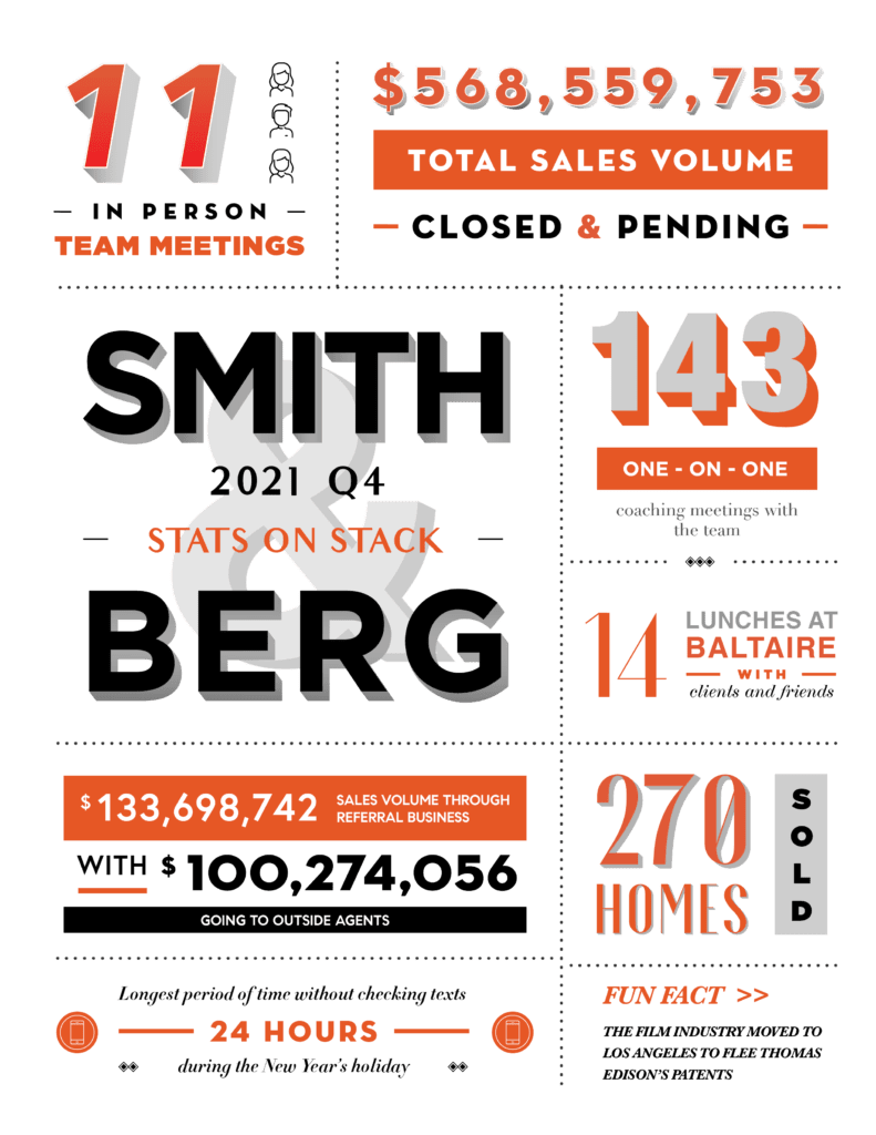 Look, it’s going to be hard to top SBP’s success in 2021 — but we’ve never met a challenge we didn’t like. By the end of Q4, our team achieved $568,559,753 in total sales volume. But what’s even more epic is that $133,698,742 of that was through referrals (with $100,274,056 going to outside agents). So essentially what we’re trying to say is: thank you. Thank you to our close-knit community of clients-turned-friends. Thank you to our families for supporting us along the way. And thank you to each and every SBP team member for kicking a$$ every day.