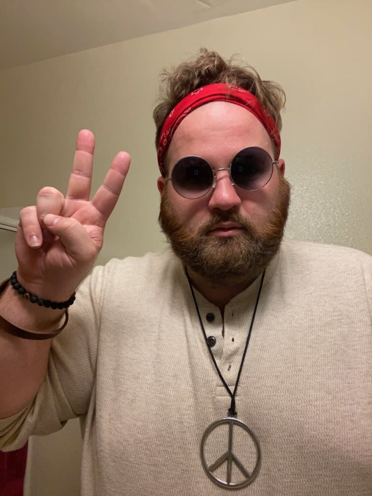 There’s a reason why people dress up as hippies year after year — essentially everyone has what they need to pull it off. SBP Concierge Garrett Sanders is lucky to have rounded, retro sunglasses and a peace-sign necklace in his back pocket at home, but if you’re lacking the obvious paraphernalia, simply grab a bandana, flared pants and all-things tie dye for the perfect hippie ‘fit.