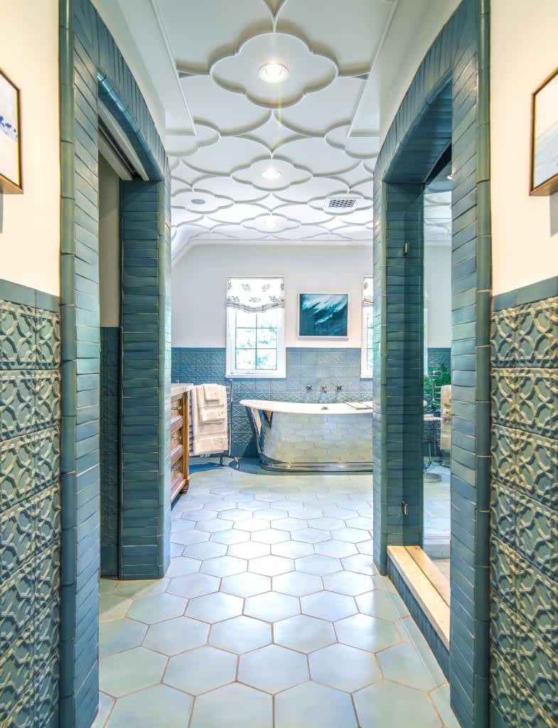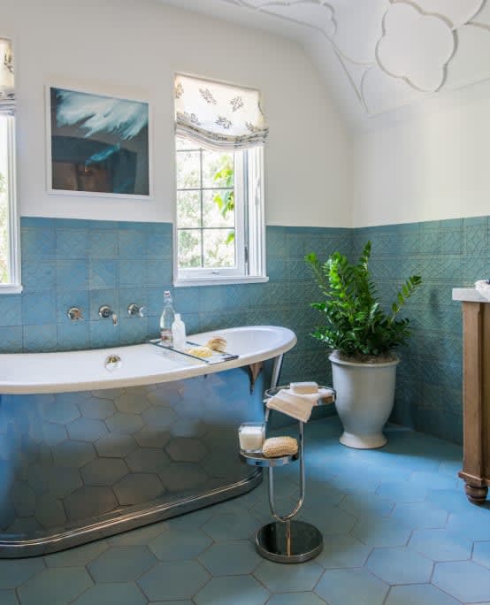 We tapped Goli Karimi, Director of Design at Home Front Build — an acclaimed architecture, interior design, and construction team out of Los Angeles — for her favorite bathroom renovation, and it’s safe to say that we’re totally inspired by the loo’s bold, over-the-top statement. Set within an iconic 1916 English Tudor in Pasadena, the bathroom features stunning Andalucia tiles from Walker Zanger and a beautifully textured ceiling that, in Goli’s words, “envelop you as if you’re being carried by ocean waves under fluffy clouds towards the impressive Crosswater tub.” Not only that, “the mirror-like polished stainless steel exterior of the tub reflects the floor tile, visually expanding the room.”