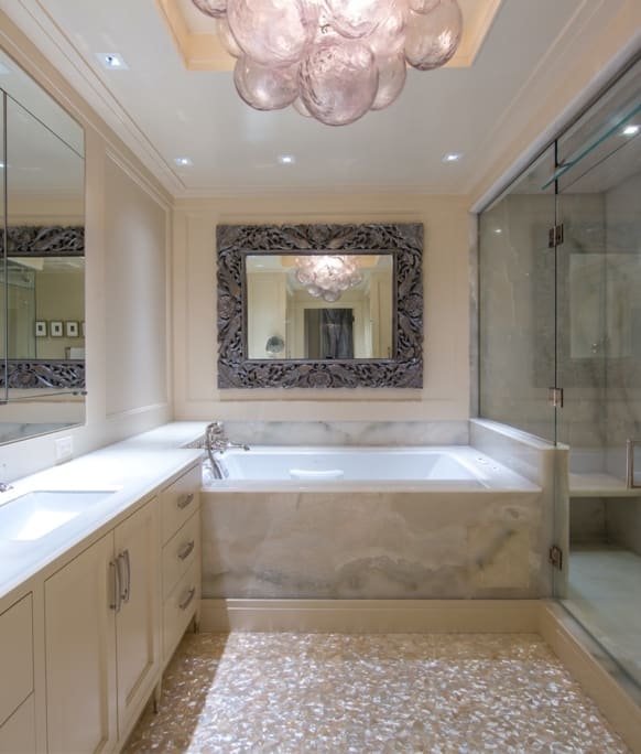 Based out of Brooklyn, The Renovated Home is a renowned design and planning firm helmed by Lee Stahl, who — much to our delight — provided a thorough backstory of his favorite bathroom renovation project in New York City. Back in 2009, an Architectural Digest 100 designer was tasked by a banking billionaire to freshen up his penthouse bathroom, but after submerging the space in all black (“something akin to the inside of a coffin,” as Lee put it), The Renovated Home was hired to fulfill the owner’s desire for a marble-clad bathroom that showcased a 16th-century panel from India inside the shower. So, Lee quickly got to work.