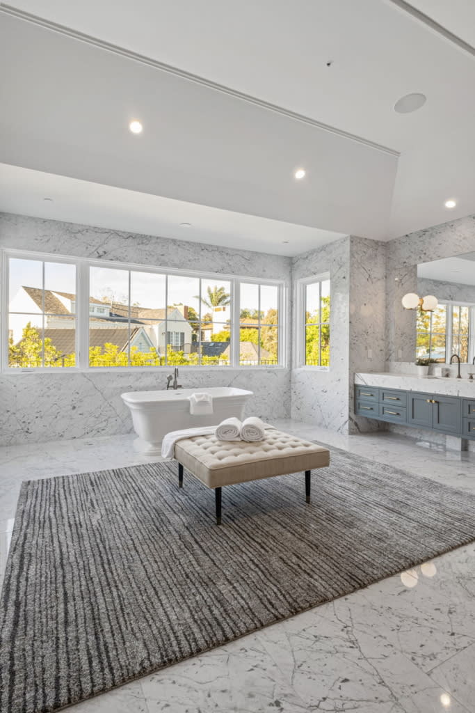 One of our favorite bathroom renovations on the SBP team is within a spectacular modern-meets-classic estate in Pacific Palisades. So, we got Associate Partner Trevor Edmond to weigh in on the incredible work that went into it and what makes the space pop so effortlessly. Replete with marble, muted blue cabinetry, stunning brass finishes, and awash in natural light, the space is a true self-care sanctuary. “The stone finishes here all tie together and lend to a clean design with both character and contrast,” Trevor shared. “There’s nothing cookie-cutter about this bathroom. Its spaciousness, large windows, classic hardware, and unique surface materials leave a thoughtful impression.”