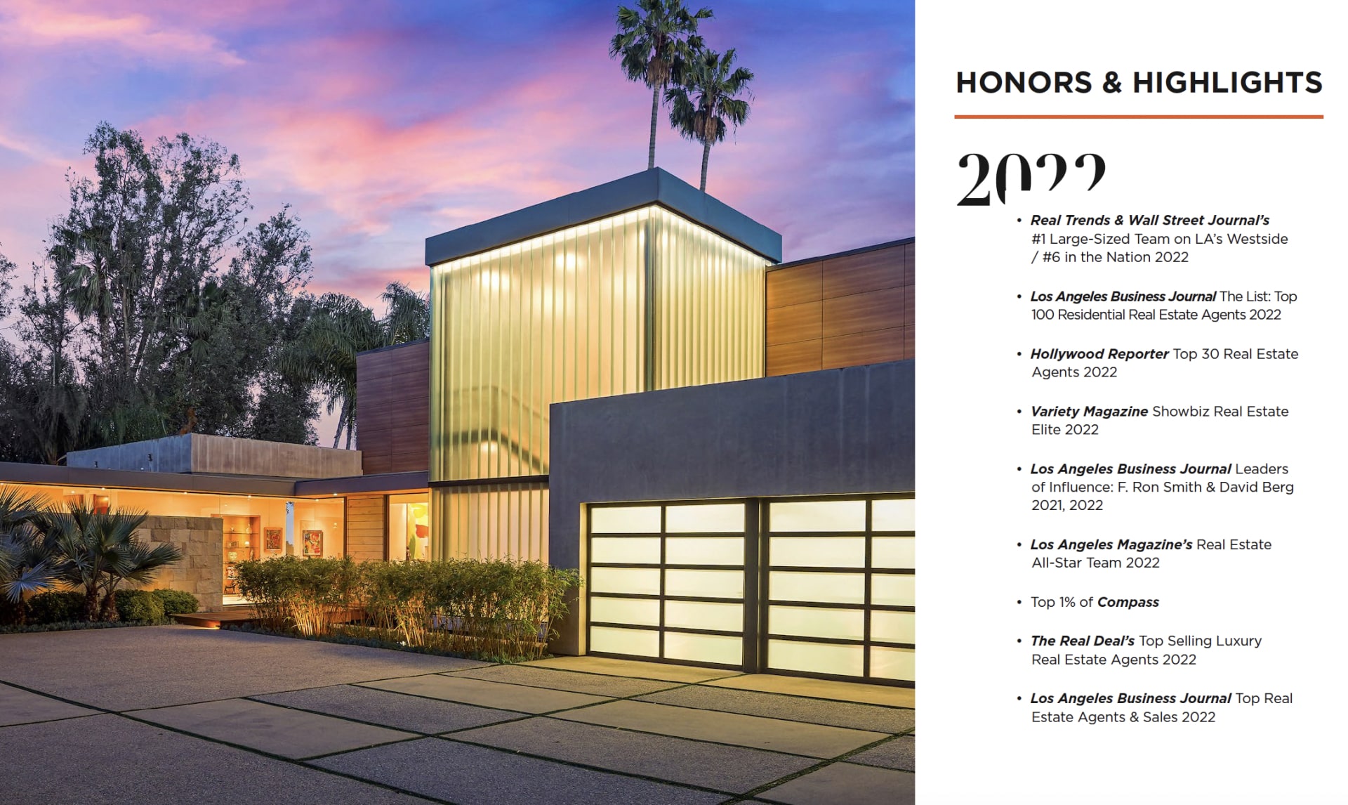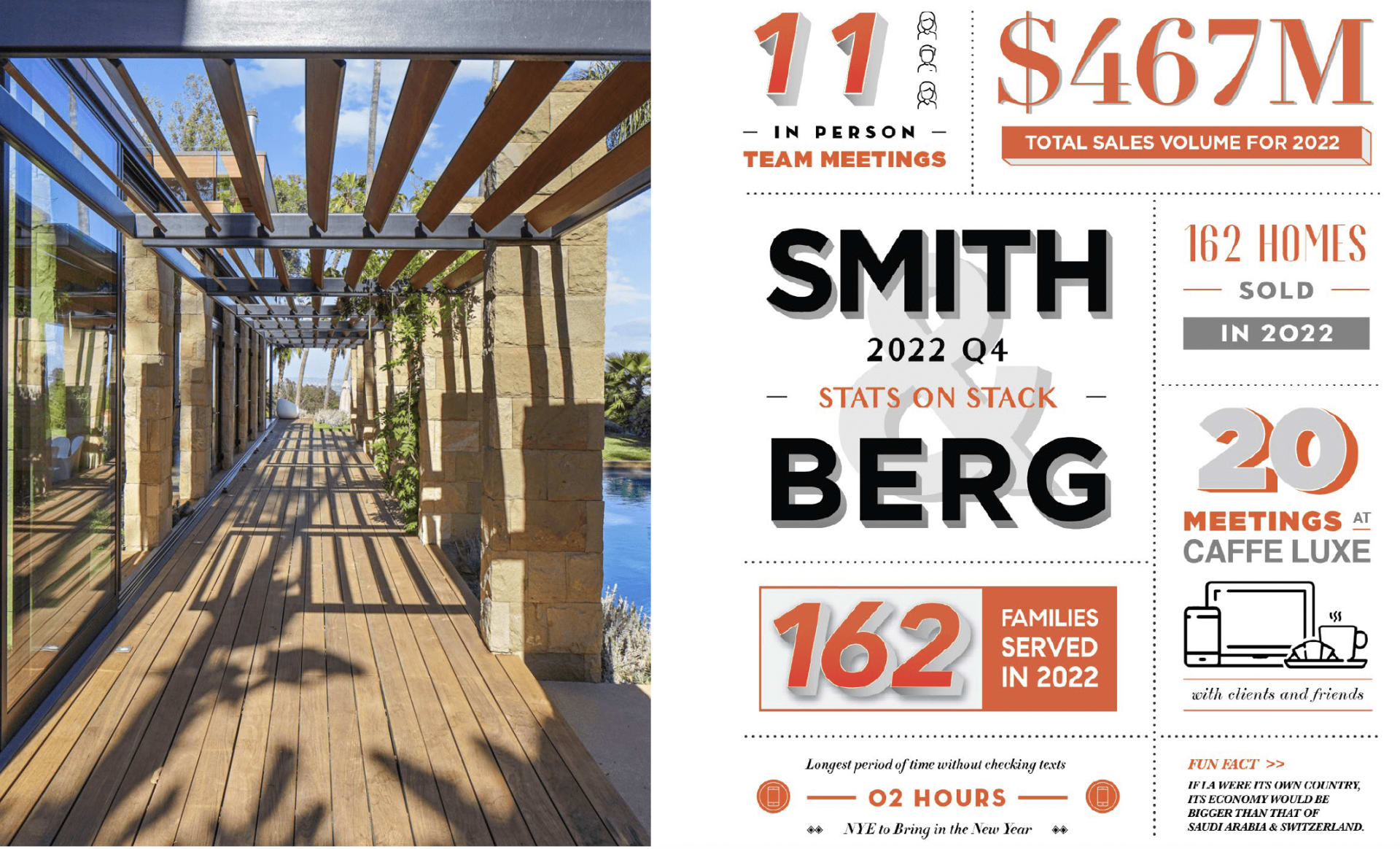 We navigated a very interesting real estate market in 2022, and we’re extremely proud to share that our sales volume reached $467 million. More importantly, we helped 162 fabulous clients through all aspects of their transactions last year — from buying to selling to everything in between. The SBP team was also awarded numerous accolades over the course of 2022, including being named Leaders of Influence by the Los Angeles Business Journal and the #1 Team on LA’s Westside by the Wall Street Journal and Real Trends. Humble brag, we know.