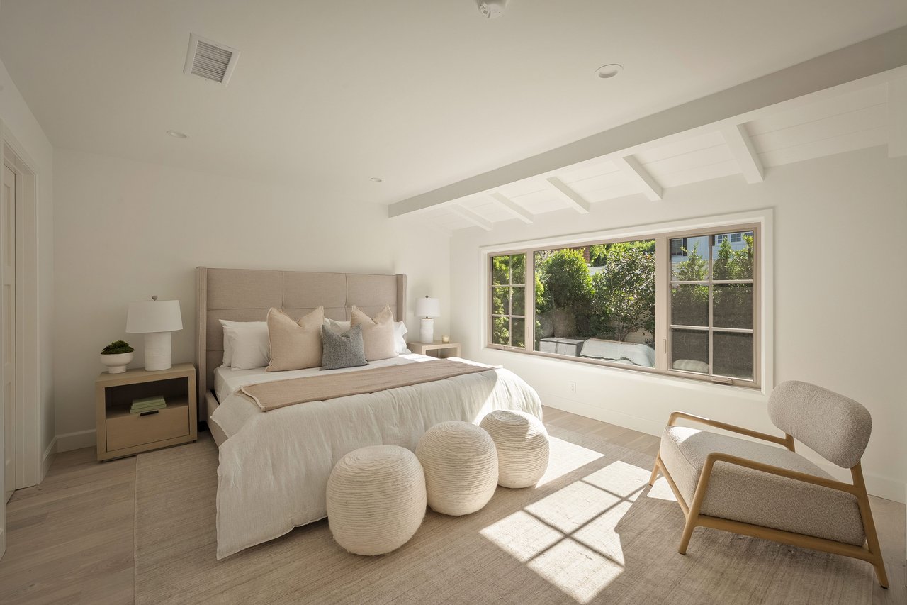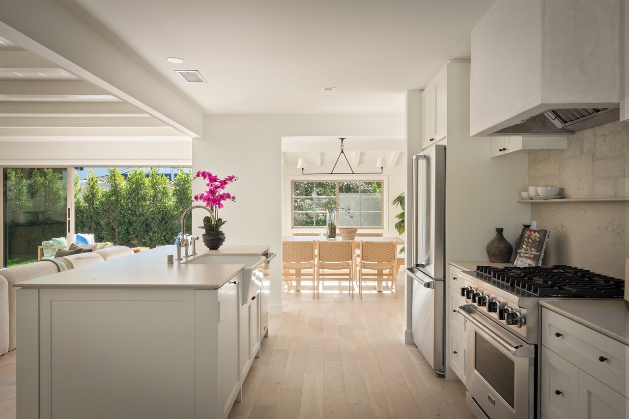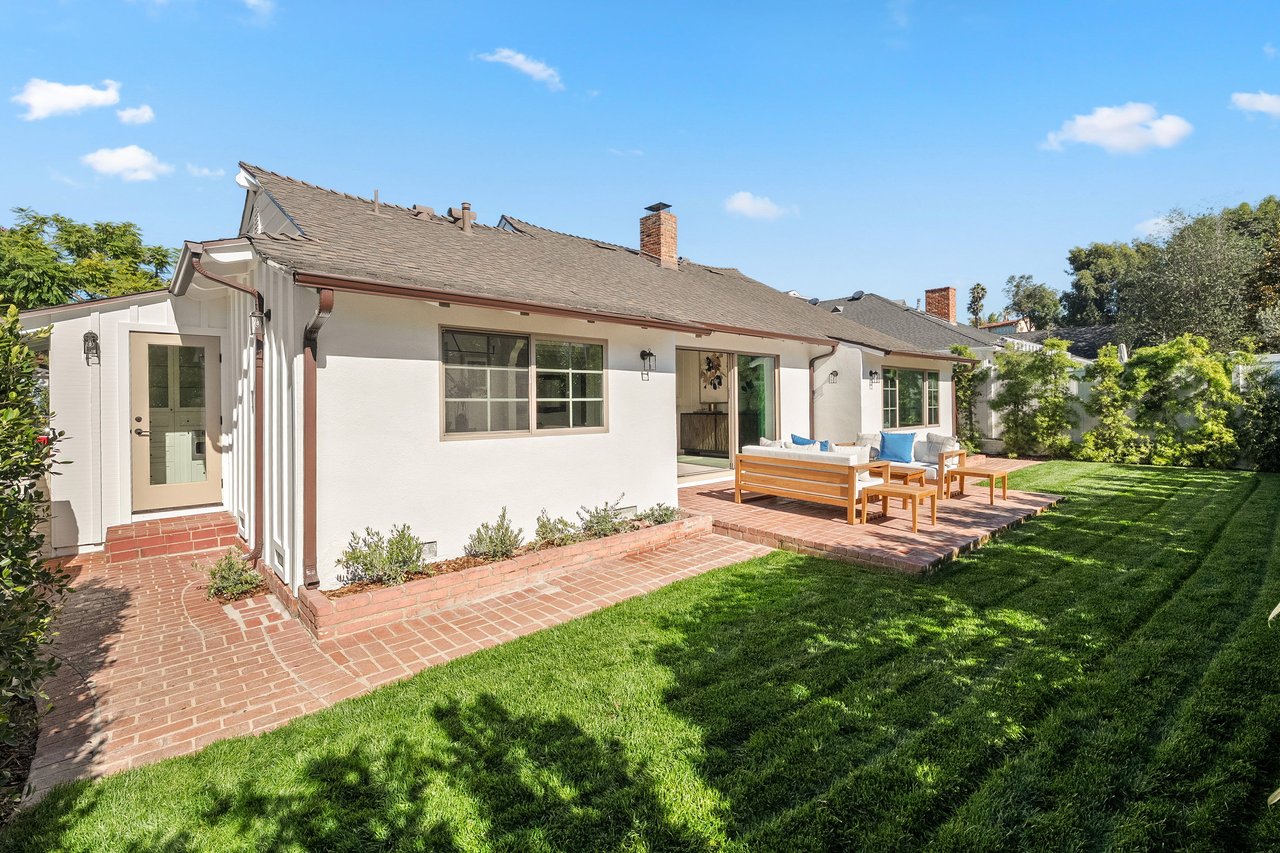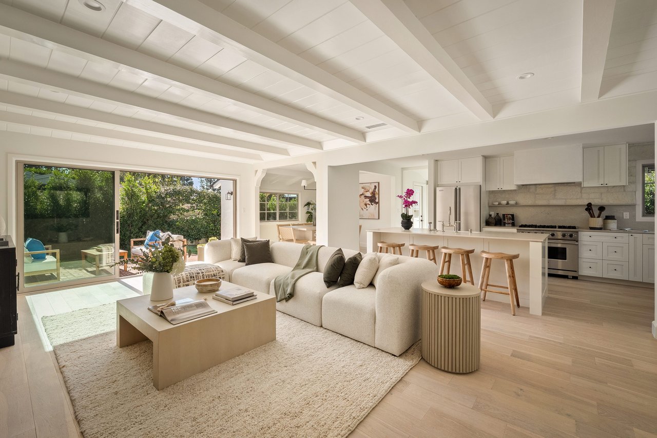 Completely transformed in 2025, this Westwood residence has been rebuilt as a turnkey sanctuary of light, style, and sophistication. Inside, a flowing open layout is framed by large windows, beamed ceilings, and white oak floors that infuse every space with warmth and airiness. The living room centers around a gas fireplace and opens effortlessly to the backyard through expansive sliding glass doors, creating the ideal setting for indoor/outdoor living. The adjoining kitchen is both beautiful and functional, with white shaker cabinetry, stone countertops, a generous seated island, and a walk-in pantry. Premium Viking appliances add convenience for the avid cook or entertainer, while the window-lined dining area offers a sunlit setting for casual meals or lively gatherings. The serene primary suite provides a private retreat with a walk-in closet and a spa-like bathroom featuring dual vanities and a glass-enclosed shower adorned with designer tile. Down the hall are three additional bedrooms, one suited as a home office, and two stylish bathrooms. Outside, the fully fenced backyard invites long afternoons in the California sunshine. Dine al fresco on the brick patio, unwind on the lawn, and enjoy the ease of a custom home that’s been thoughtfully crafted for modern living. With a new pull-through driveway, dedicated laundry area, and all-new systems and finishes, every detail has been designed for comfort and peace of mind. Set on a desirable corner lot just moments from Brentwood Village, The Getty, and the boutiques and dining along San Vicente Boulevard, this home captures the essence of refined Westside living.