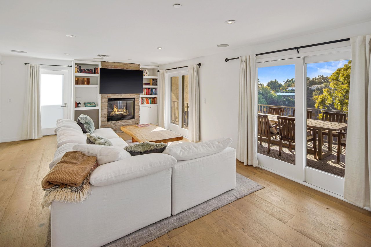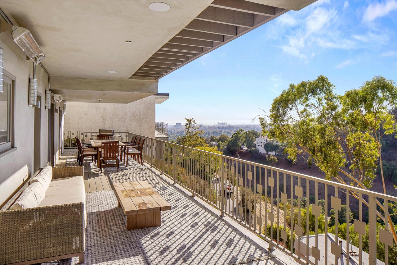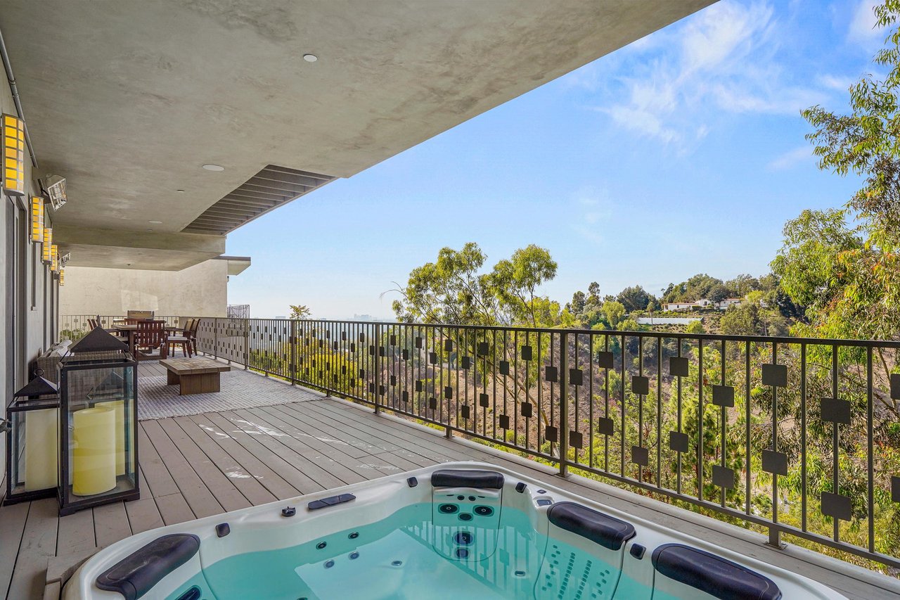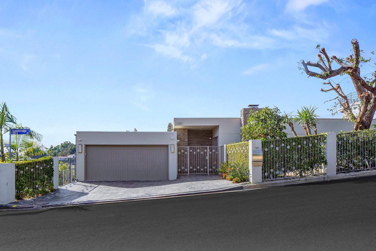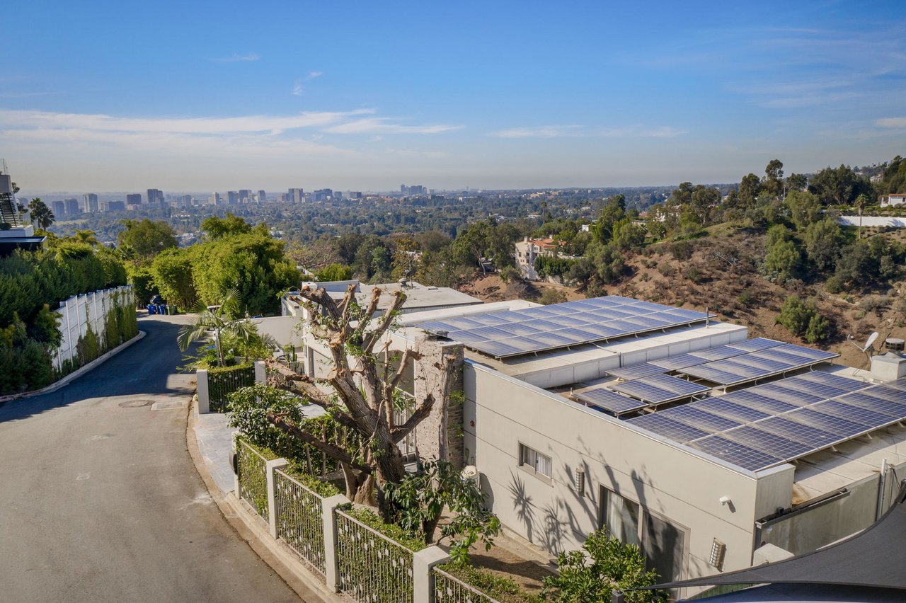 Perched on a scenic hillside in coveted Lower Beverly Hills Post Office, this beautifully renovated four-bedroom contemporary home offers breathtaking panoramic canyon, city, and ocean views just minutes from the heart of Beverly Hills. Designed to maximize natural light and indoor-outdoor living, oversized windows across multiple levels frame stunning vistas and create a bright, airy atmosphere throughout the home. The main level great room features a spacious living area with a gas fireplace and private view balcony, seamlessly flowing into a sunlit dining space and a modern chef's kitchen. The kitchen is outfitted with high-end Viking and Miele stainless steel appliances, granite countertops, and a seated center island, making it ideal for both everyday living and entertaining. The lower level offers an expansive family room with a state-of-the-art home theater system, opening directly to a large outdoor deck with a built-in jacuzzi, ideal for relaxing or hosting gatherings while enjoying the spectacular canyon and sunset views. Three bedrooms are located within the main residence, including a lower level suite with direct access to the deck and a luxurious primary suite complete with a walk-in closet and spa-inspired bathroom featuring a double vanity, soaking tub, and steam shower. A separate guest suite or private office with its own entrance, along with an additional storage room, provides flexible space for guests, work-from-home needs, or creative use. Fully remodeled with modern conveniences, the home includes smart home automation, Nest thermostats, built-in surround sound throughout, and energy-efficient solar panels. An attached two-car garage and spacious driveway present ample off-street parking, adding to the home's functionality. Ideally located just minutes from Rodeo Drive, world-class shopping, fine dining, and top Beverly Hills amenities, 1433 Summitridge Drive offers a rare combination of privacy, luxury, and sweeping views in one of Los Angeles' most desirable neighborhoods.