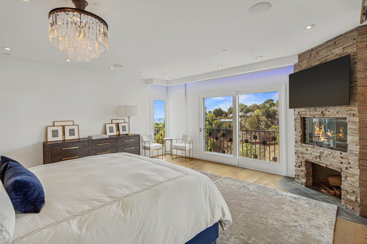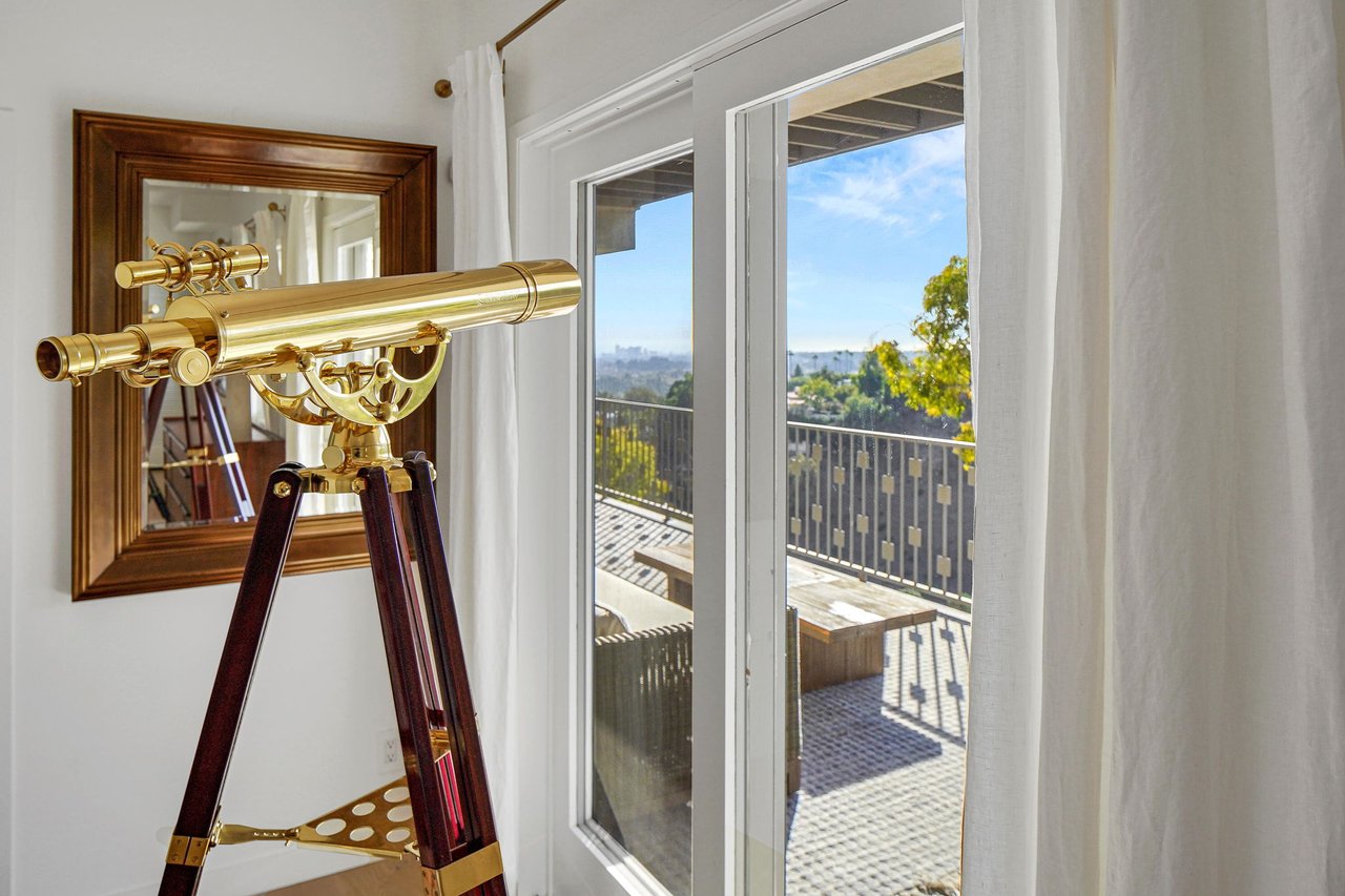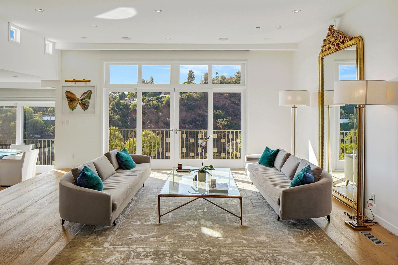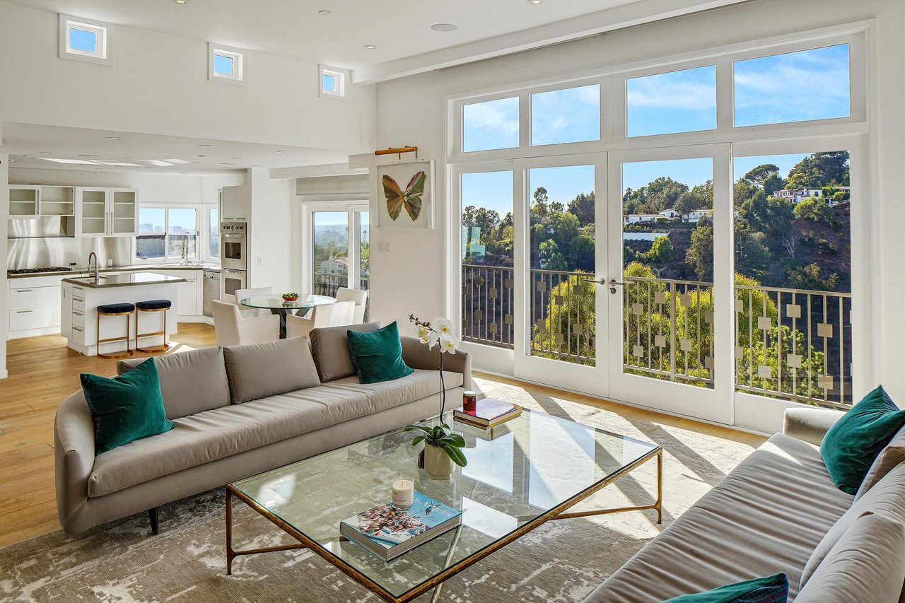 Perched on a scenic hillside in coveted Lower Beverly Hills Post Office, this beautifully renovated four-bedroom contemporary home offers breathtaking panoramic canyon, city, and ocean views just minutes from the heart of Beverly Hills. Designed to maximize natural light and indoor-outdoor living, oversized windows across multiple levels frame stunning vistas and create a bright, airy atmosphere throughout the home. The main level great room features a spacious living area with a gas fireplace and private view balcony, seamlessly flowing into a sunlit dining space and a modern chef's kitchen. The kitchen is outfitted with high-end Viking and Miele stainless steel appliances, granite countertops, and a seated center island, making it ideal for both everyday living and entertaining. The lower level offers an expansive family room with a state-of-the-art home theater system, opening directly to a large outdoor deck with a built-in jacuzzi, ideal for relaxing or hosting gatherings while enjoying the spectacular canyon and sunset views. Three bedrooms are located within the main residence, including a lower level suite with direct access to the deck and a luxurious primary suite complete with a walk-in closet and spa-inspired bathroom featuring a double vanity, soaking tub, and steam shower. A separate guest suite or private office with its own entrance, along with an additional storage room, provides flexible space for guests, work-from-home needs, or creative use. Fully remodeled with modern conveniences, the home includes smart home automation, Nest thermostats, built-in surround sound throughout, and energy-efficient solar panels. An attached two-car garage and spacious driveway present ample off-street parking, adding to the home's functionality. Ideally located just minutes from Rodeo Drive, world-class shopping, fine dining, and top Beverly Hills amenities, 1433 Summitridge Drive offers a rare combination of privacy, luxury, and sweeping views in one of Los Angeles' most desirable neighborhoods.