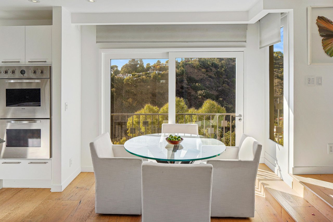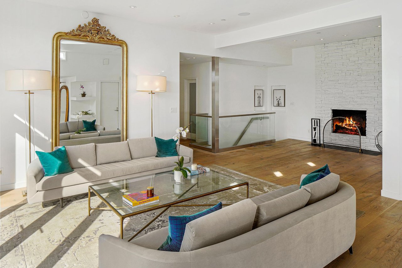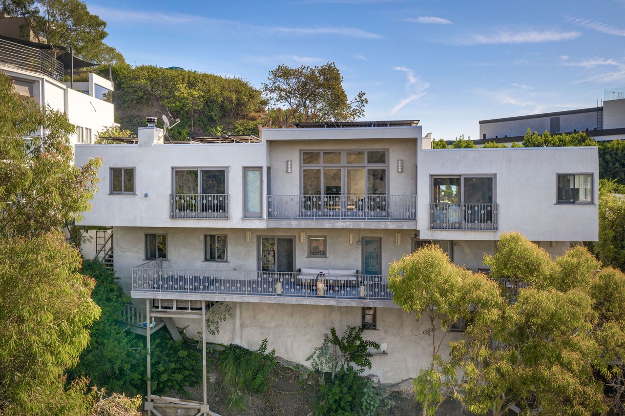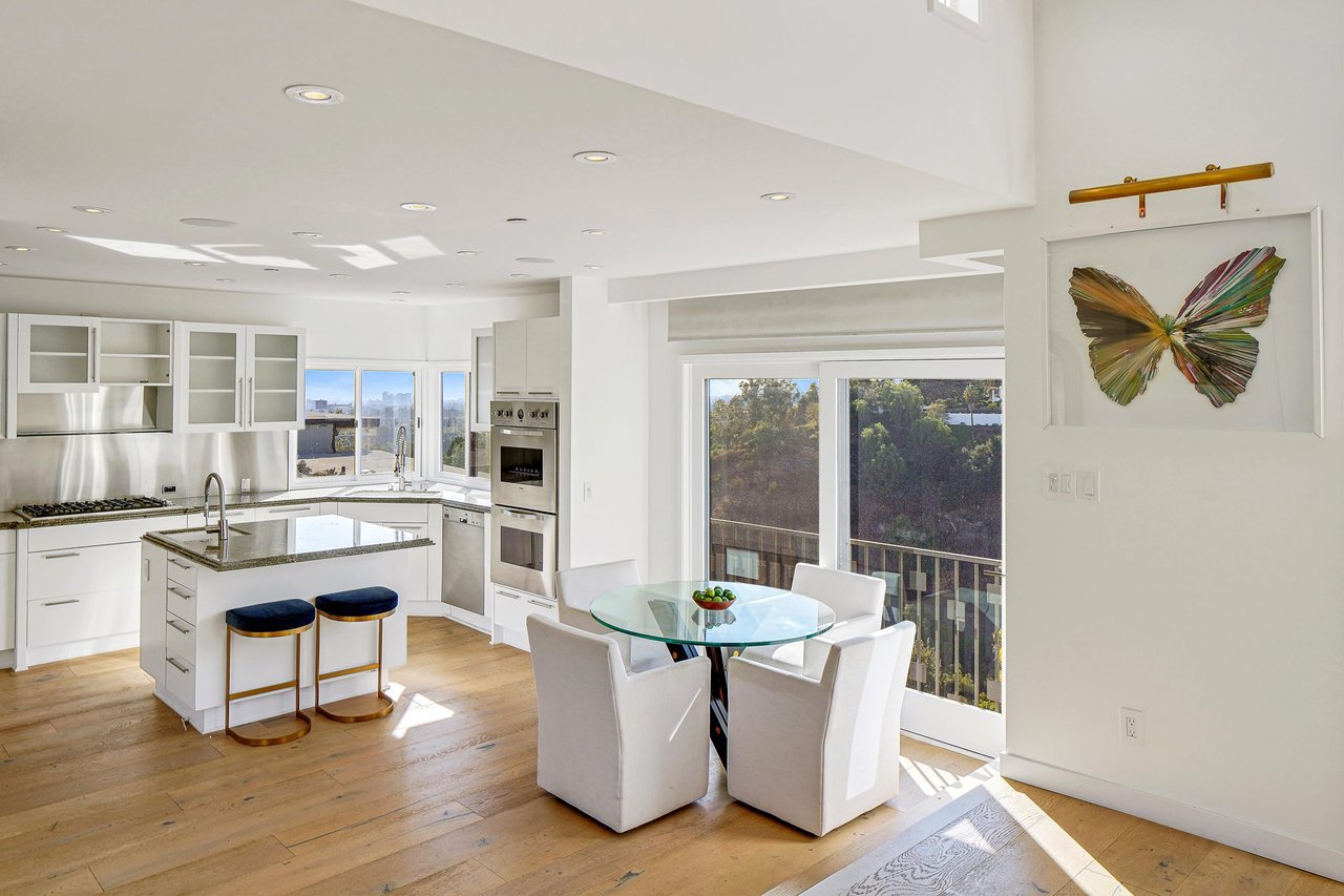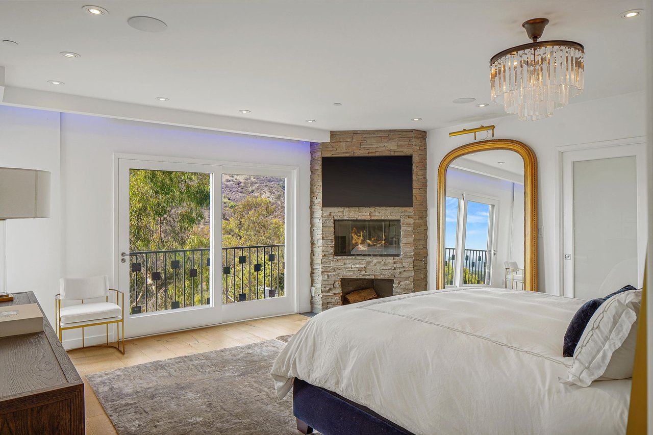 Perched on a scenic hillside in coveted Lower Beverly Hills Post Office, this beautifully renovated four-bedroom contemporary home offers breathtaking panoramic canyon, city, and ocean views just minutes from the heart of Beverly Hills. Designed to maximize natural light and indoor-outdoor living, oversized windows across multiple levels frame stunning vistas and create a bright, airy atmosphere throughout the home. The main level great room features a spacious living area with a gas fireplace and private view balcony, seamlessly flowing into a sunlit dining space and a modern chef's kitchen. The kitchen is outfitted with high-end Viking and Miele stainless steel appliances, granite countertops, and a seated center island, making it ideal for both everyday living and entertaining. The lower level offers an expansive family room with a state-of-the-art home theater system, opening directly to a large outdoor deck with a built-in jacuzzi, ideal for relaxing or hosting gatherings while enjoying the spectacular canyon and sunset views. Three bedrooms are located within the main residence, including a lower level suite with direct access to the deck and a luxurious primary suite complete with a walk-in closet and spa-inspired bathroom featuring a double vanity, soaking tub, and steam shower. A separate guest suite or private office with its own entrance, along with an additional storage room, provides flexible space for guests, work-from-home needs, or creative use. Fully remodeled with modern conveniences, the home includes smart home automation, Nest thermostats, built-in surround sound throughout, and energy-efficient solar panels. An attached two-car garage and spacious driveway present ample off-street parking, adding to the home's functionality. Ideally located just minutes from Rodeo Drive, world-class shopping, fine dining, and top Beverly Hills amenities, 1433 Summitridge Drive offers a rare combination of privacy, luxury, and sweeping views in one of Los Angeles' most desirable neighborhoods.