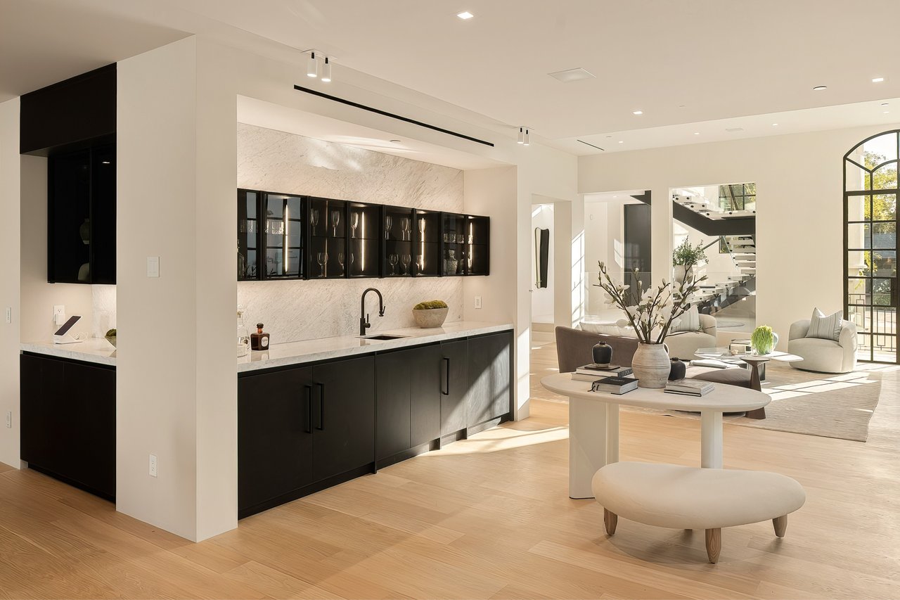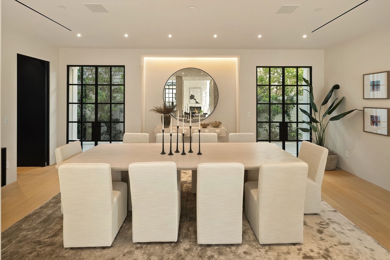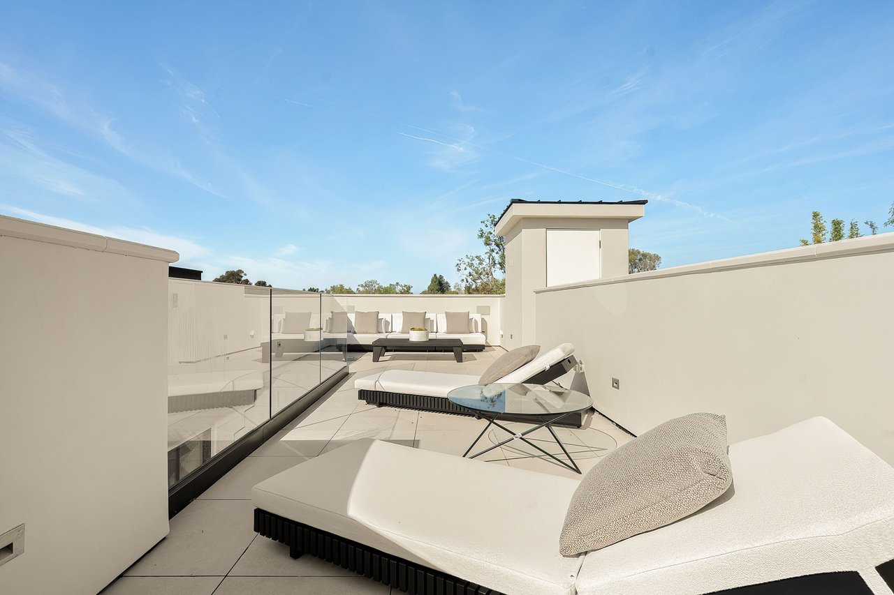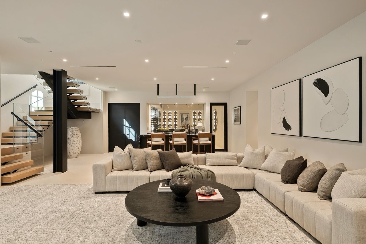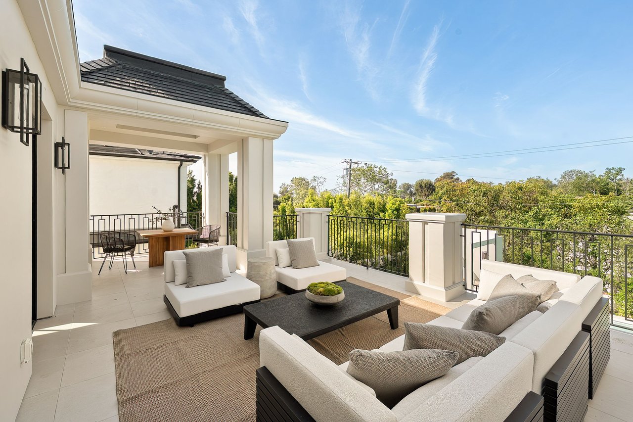 Supremely positioned north of Sunset in Brentwood, 155 North Anita Avenue is a newly constructed Modern French residence that blends timeless European influence with a refined contemporary aesthetic. Spanning 9,777 square feet with 6 bedrooms and 9 bathrooms, the home makes an immediate impression with a striking double-height entry, where a sculptural floating staircase and premium Semco flooring set a sophisticated tone. From there, expansive windows draw in natural light, illuminating warm hardwood floors that carry throughout the open-concept main level and connect a series of elegant yet inviting living spaces. Designed with both scale and flow in mind, the interiors unfold seamlessly from the formal dining room to a lounge with wet bar and into an expansive great room that opens directly to a heated loggia. The chef-inspired kitchen balances form and function with imported marble countertops, contrasting Pedini cabinetry, and a generous seated island. A discreet butler's pantry enhances usability, while a suite of premium appliances, including a Wolf double-oven range, dual Miele dishwashers, and Sub-Zero refrigeration, supports both everyday living and elevated entertaining. Just beyond, the resort-like backyard is framed by mature hedging, offering a tranquil setting with a pool and spa, turf lawn, and multiple areas for lounging and dining al fresco. Throughout the home, integrated systems provide modern convenience, including an elevator, Crestron home automation, Lutron lighting, surround sound, 10-zone climate control, heated bathroom floors, and a solar system. Upstairs, a relaxed atmosphere unfolds with a comfortable family room opening to the rooftop deck that captures panoramic views across the Westside. Four en suite bedrooms are also located on this level, including the primary suite, which is designed as a private retreat with direct access to a private terrace, an expansive walk-in closet, and a spa-like bathroom featuring a dual steam shower, soaking tub, and separate vanities. The lower level is dedicated to leisure and entertainment, where a spacious recreation room with a full wet bar is complemented by a temperature-controlled wine cellar and tasting room, a screening room, and a gym with infrared sauna. Two additional bedroom suites with a separate entrance provide ideal accommodations for staff or guests, supported by laundry rooms on both the upper and lower levels. A comprehensive security system with cameras, a three-car garage, and parking for up to nine vehicles complete the offering. Located just moments from Brentwood Country Club, top-rated schools, premier dining and shopping along San Vicente Blvd, and less than ten minutes from the beach, this residence offers a rare combination of privacy, scale, and access within one of the Westside's most desirable enclaves.