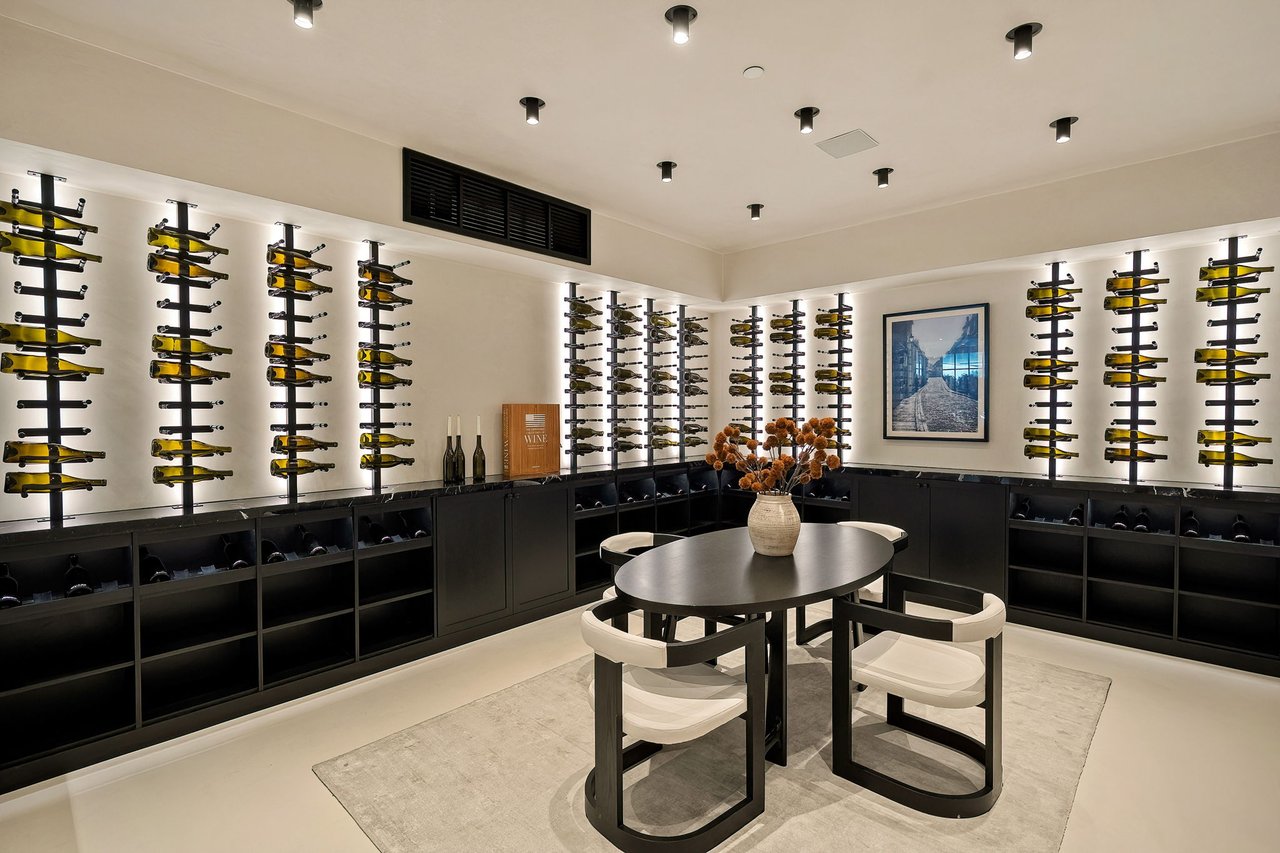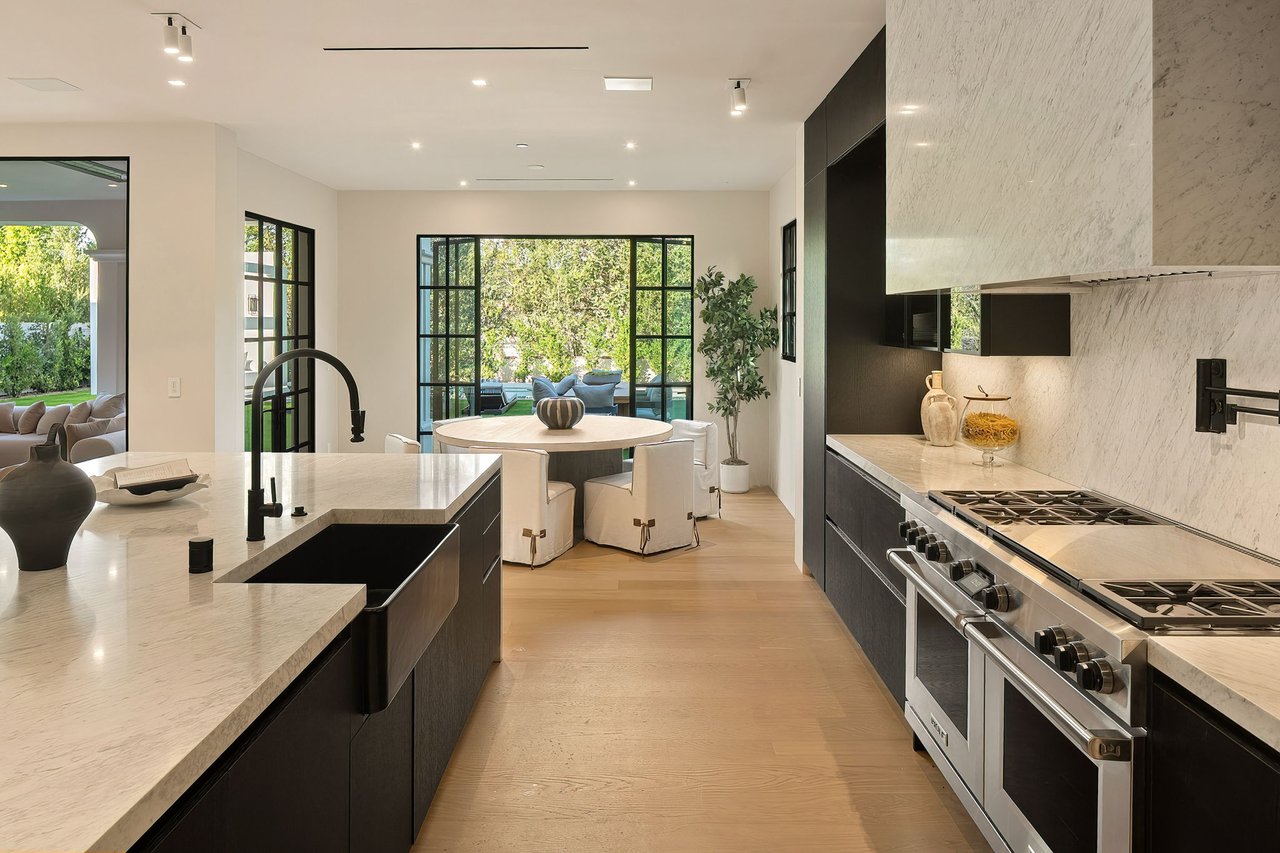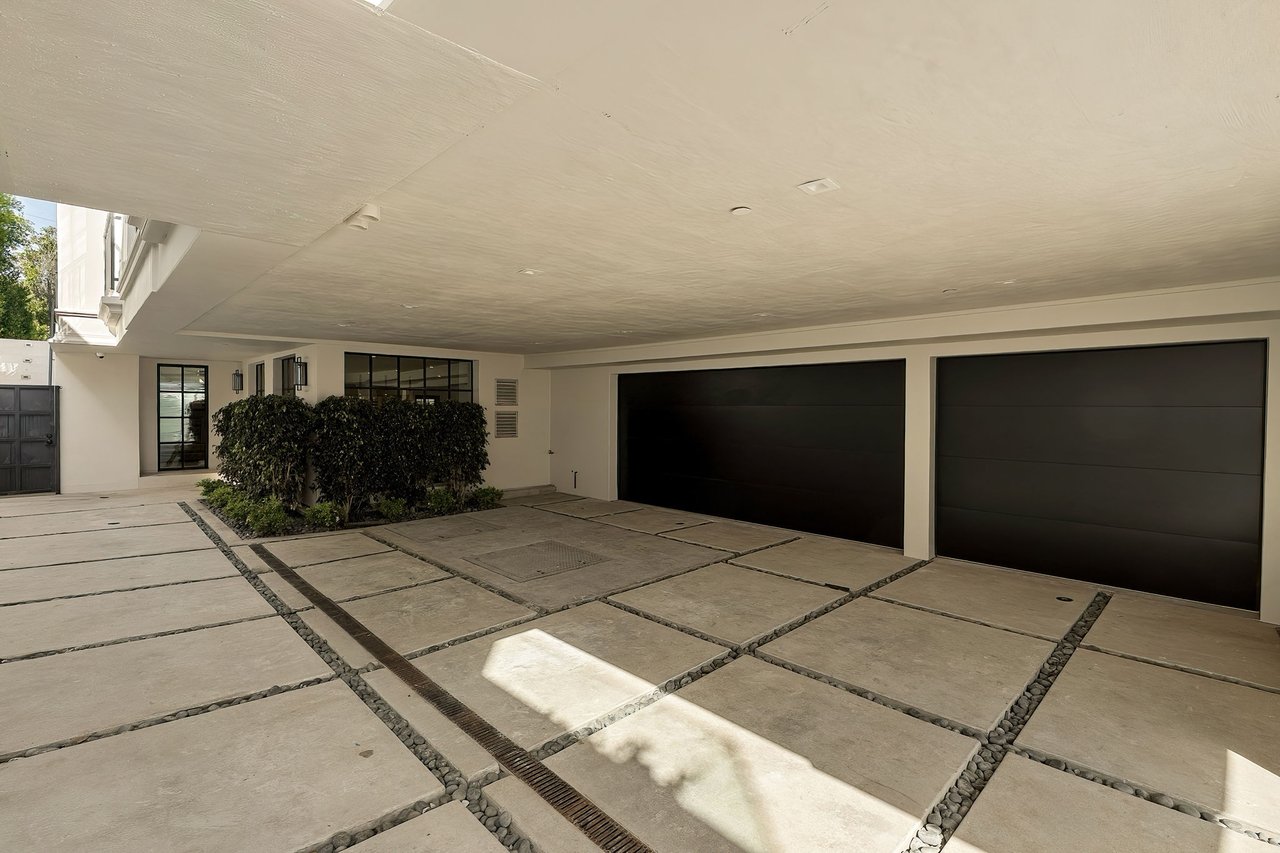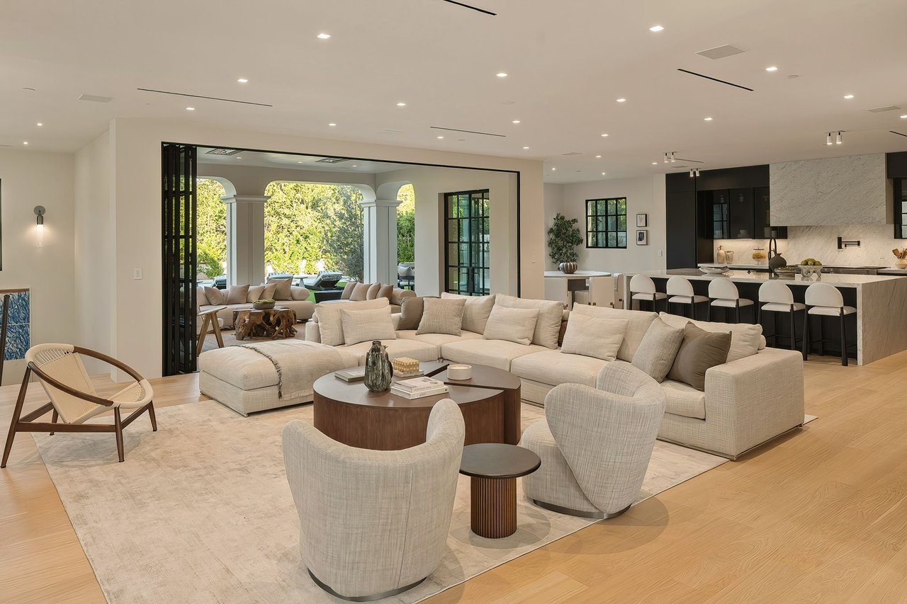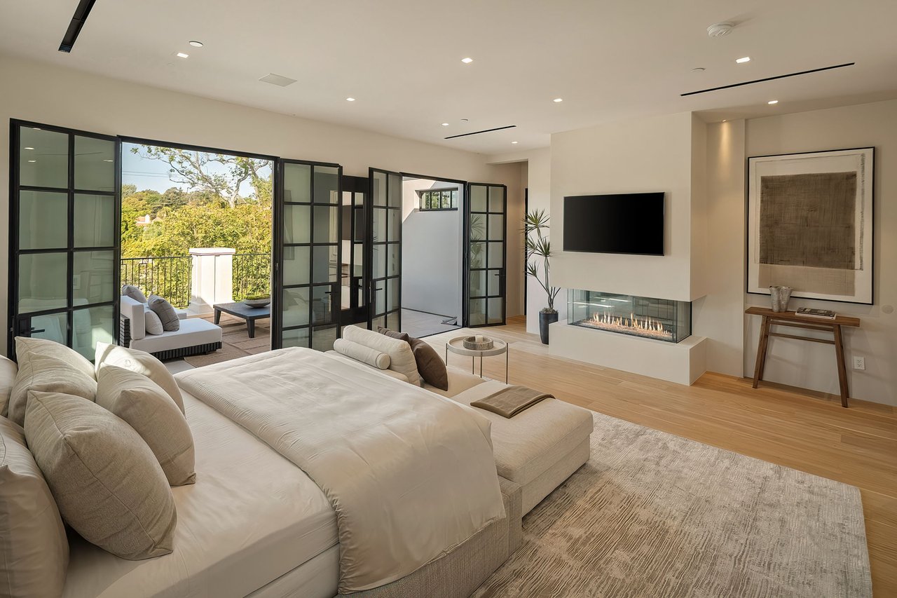 Supremely positioned north of Sunset in Brentwood, 155 North Anita Avenue is a newly constructed Modern French residence that blends timeless European influence with a refined contemporary aesthetic. Spanning 9,777 square feet with 6 bedrooms and 9 bathrooms, the home makes an immediate impression with a striking double-height entry, where a sculptural floating staircase and premium Semco flooring set a sophisticated tone. From there, expansive windows draw in natural light, illuminating warm hardwood floors that carry throughout the open-concept main level and connect a series of elegant yet inviting living spaces. Designed with both scale and flow in mind, the interiors unfold seamlessly from the formal dining room to a lounge with wet bar and into an expansive great room that opens directly to a heated loggia. The chef-inspired kitchen balances form and function with imported marble countertops, contrasting Pedini cabinetry, and a generous seated island. A discreet butler's pantry enhances usability, while a suite of premium appliances, including a Wolf double-oven range, dual Miele dishwashers, and Sub-Zero refrigeration, supports both everyday living and elevated entertaining. Just beyond, the resort-like backyard is framed by mature hedging, offering a tranquil setting with a pool and spa, turf lawn, and multiple areas for lounging and dining al fresco. Throughout the home, integrated systems provide modern convenience, including an elevator, Crestron home automation, Lutron lighting, surround sound, 10-zone climate control, heated bathroom floors, and a solar system. Upstairs, a relaxed atmosphere unfolds with a comfortable family room opening to the rooftop deck that captures panoramic views across the Westside. Four en suite bedrooms are also located on this level, including the primary suite, which is designed as a private retreat with direct access to a private terrace, an expansive walk-in closet, and a spa-like bathroom featuring a dual steam shower, soaking tub, and separate vanities. The lower level is dedicated to leisure and entertainment, where a spacious recreation room with a full wet bar is complemented by a temperature-controlled wine cellar and tasting room, a screening room, and a gym with infrared sauna. Two additional bedroom suites with a separate entrance provide ideal accommodations for staff or guests, supported by laundry rooms on both the upper and lower levels. A comprehensive security system with cameras, a three-car garage, and parking for up to nine vehicles complete the offering. Located just moments from Brentwood Country Club, top-rated schools, premier dining and shopping along San Vicente Blvd, and less than ten minutes from the beach, this residence offers a rare combination of privacy, scale, and access within one of the Westside's most desirable enclaves.