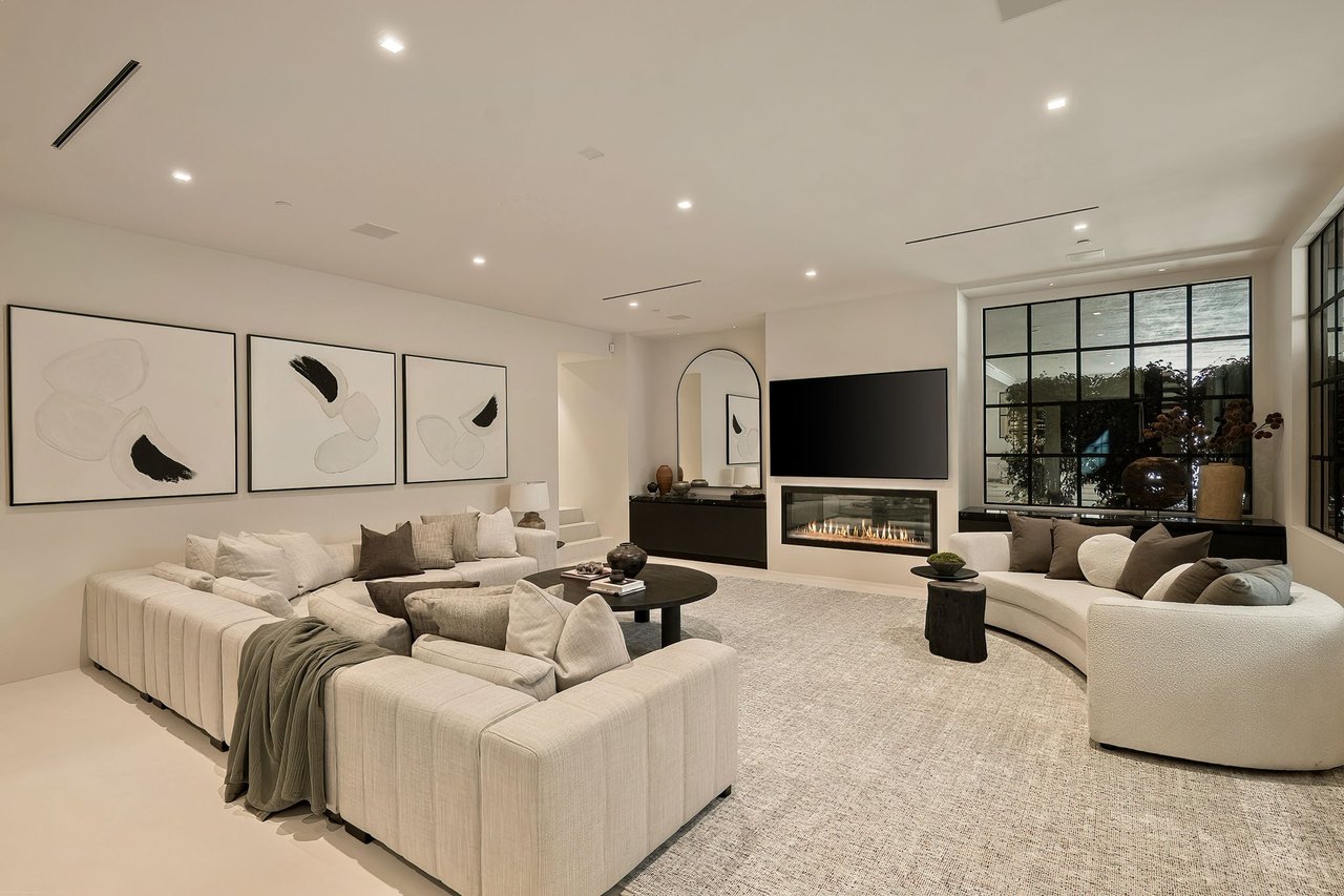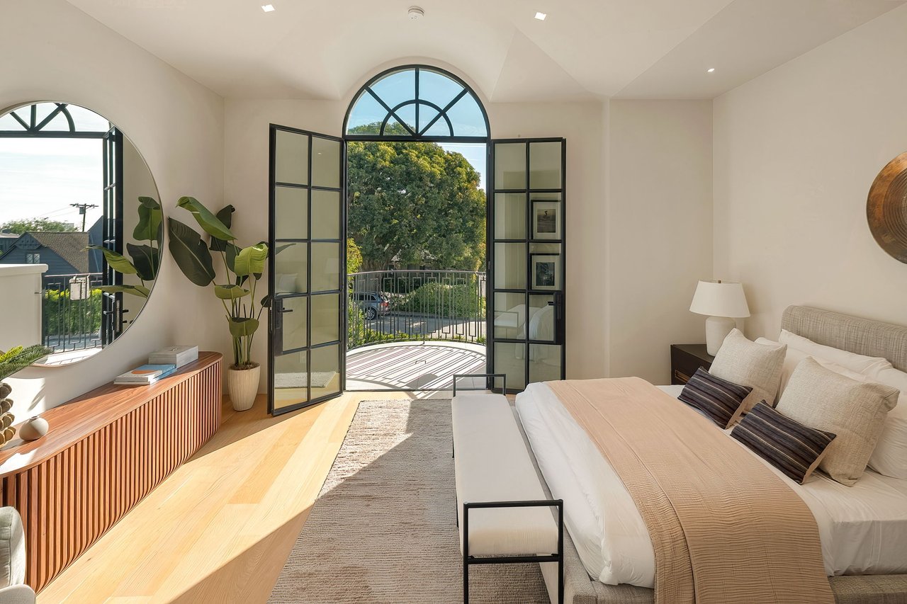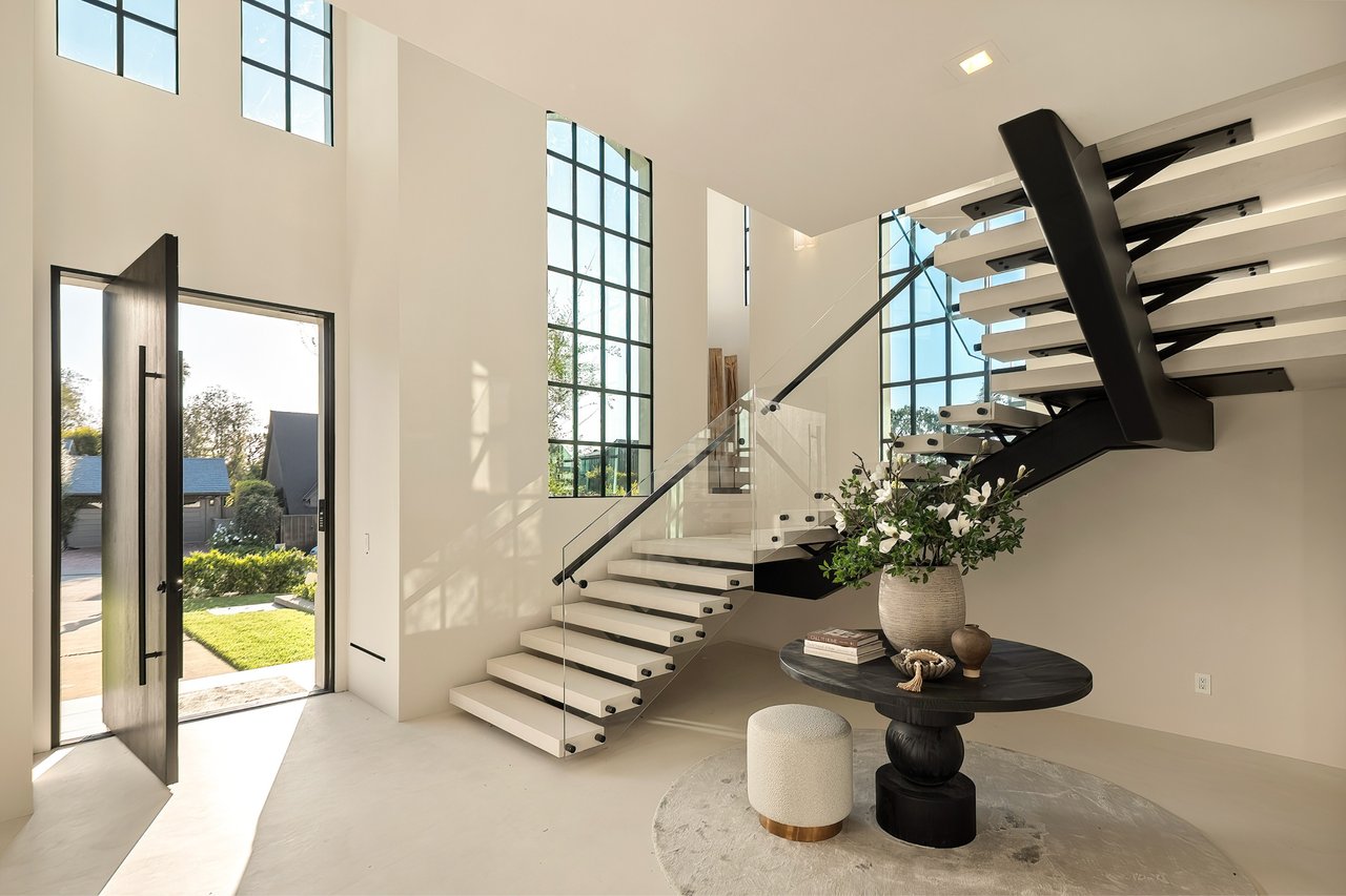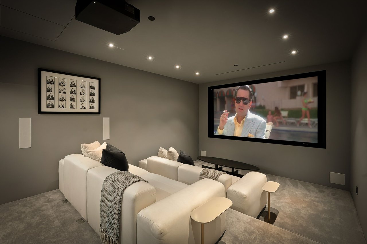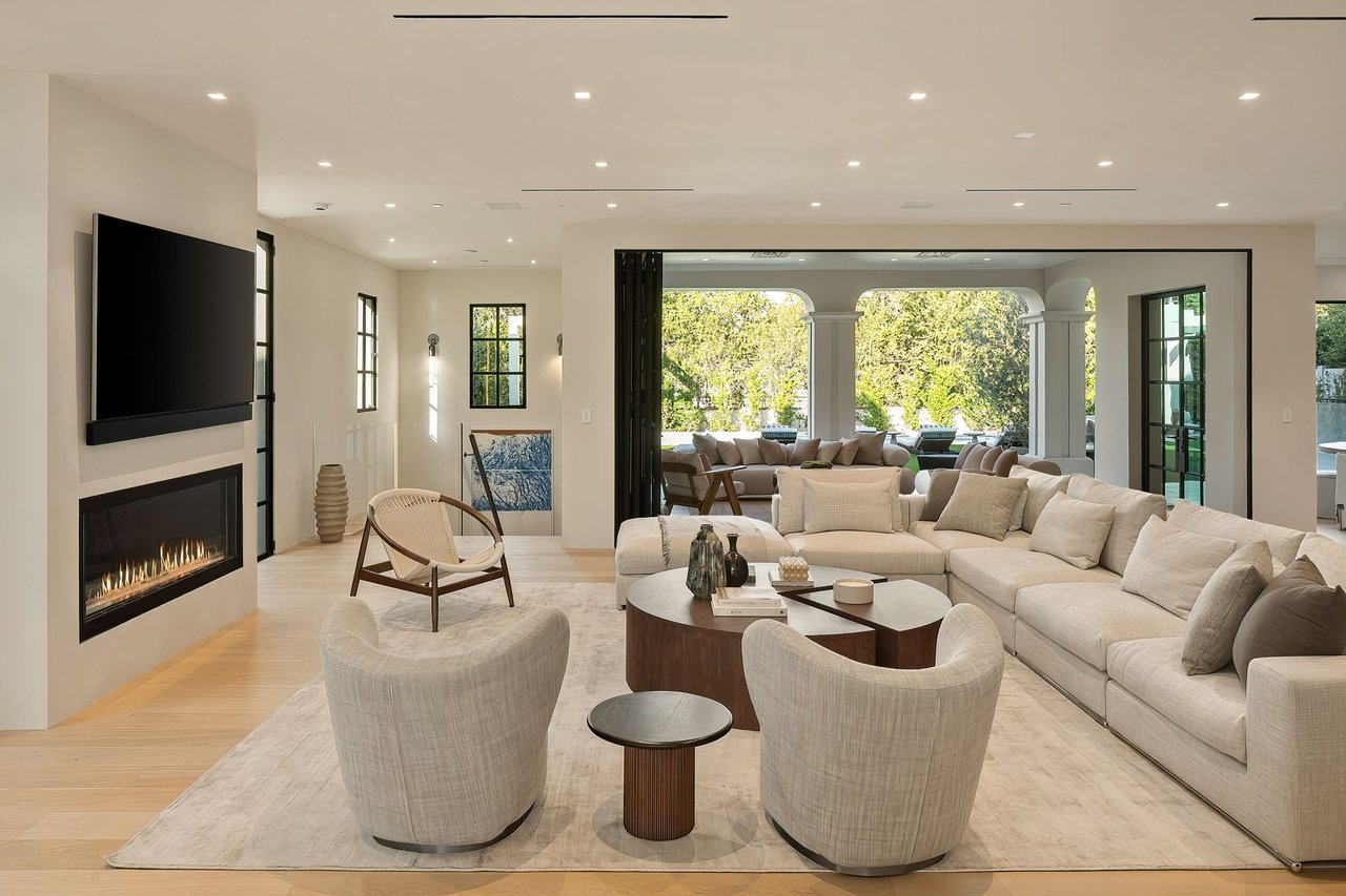 Supremely positioned north of Sunset in Brentwood, 155 North Anita Avenue is a newly constructed Modern French residence that blends timeless European influence with a refined contemporary aesthetic. Spanning 9,777 square feet with 6 bedrooms and 9 bathrooms, the home makes an immediate impression with a striking double-height entry, where a sculptural floating staircase and premium Semco flooring set a sophisticated tone. From there, expansive windows draw in natural light, illuminating warm hardwood floors that carry throughout the open-concept main level and connect a series of elegant yet inviting living spaces. Designed with both scale and flow in mind, the interiors unfold seamlessly from the formal dining room to a lounge with wet bar and into an expansive great room that opens directly to a heated loggia. The chef-inspired kitchen balances form and function with imported marble countertops, contrasting Pedini cabinetry, and a generous seated island. A discreet butler's pantry enhances usability, while a suite of premium appliances, including a Wolf double-oven range, dual Miele dishwashers, and Sub-Zero refrigeration, supports both everyday living and elevated entertaining. Just beyond, the resort-like backyard is framed by mature hedging, offering a tranquil setting with a pool and spa, turf lawn, and multiple areas for lounging and dining al fresco. Throughout the home, integrated systems provide modern convenience, including an elevator, Crestron home automation, Lutron lighting, surround sound, 10-zone climate control, heated bathroom floors, and a solar system. Upstairs, a relaxed atmosphere unfolds with a comfortable family room opening to the rooftop deck that captures panoramic views across the Westside. Four en suite bedrooms are also located on this level, including the primary suite, which is designed as a private retreat with direct access to a private terrace, an expansive walk-in closet, and a spa-like bathroom featuring a dual steam shower, soaking tub, and separate vanities. The lower level is dedicated to leisure and entertainment, where a spacious recreation room with a full wet bar is complemented by a temperature-controlled wine cellar and tasting room, a screening room, and a gym with infrared sauna. Two additional bedroom suites with a separate entrance provide ideal accommodations for staff or guests, supported by laundry rooms on both the upper and lower levels. A comprehensive security system with cameras, a three-car garage, and parking for up to nine vehicles complete the offering. Located just moments from Brentwood Country Club, top-rated schools, premier dining and shopping along San Vicente Blvd, and less than ten minutes from the beach, this residence offers a rare combination of privacy, scale, and access within one of the Westside's most desirable enclaves.