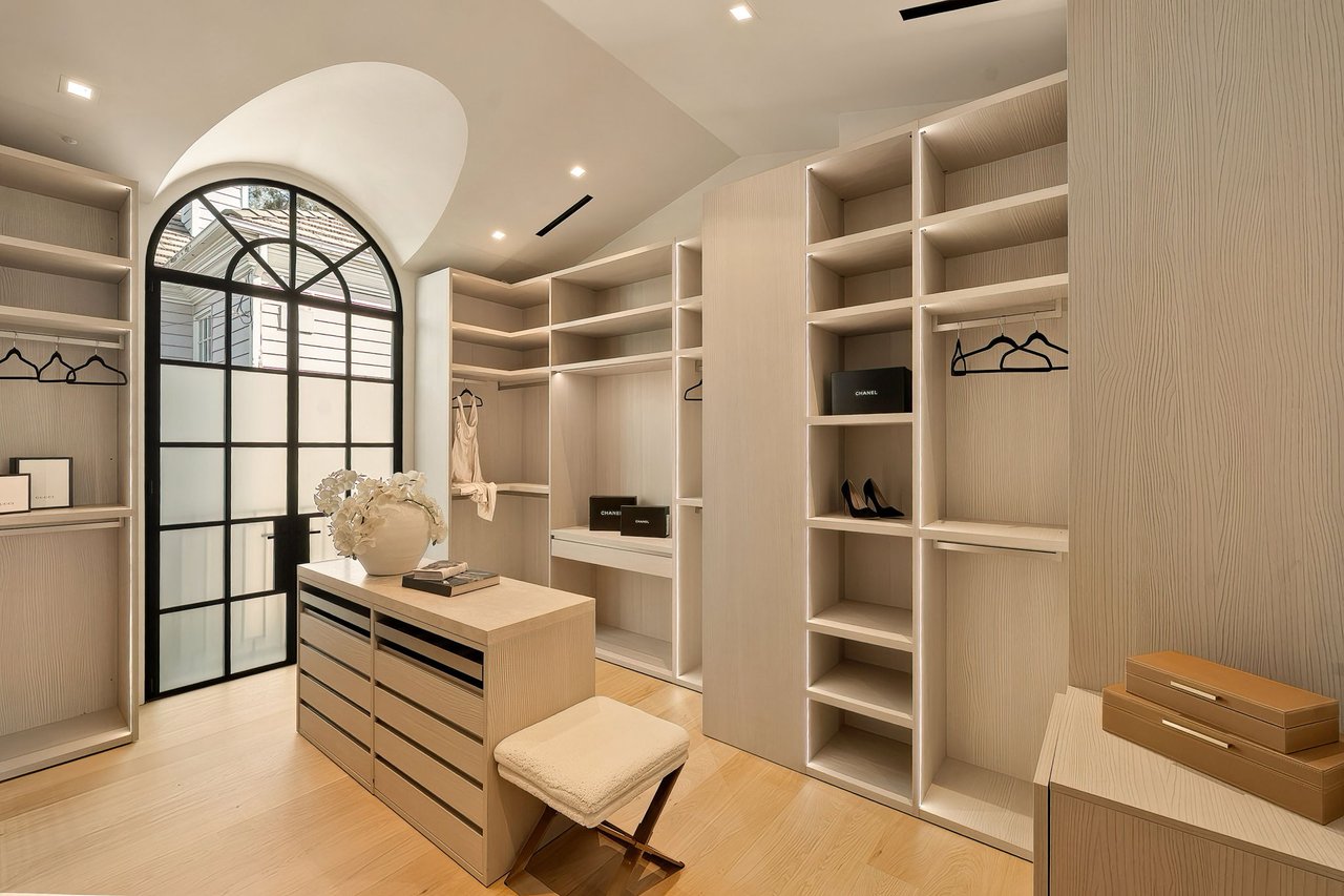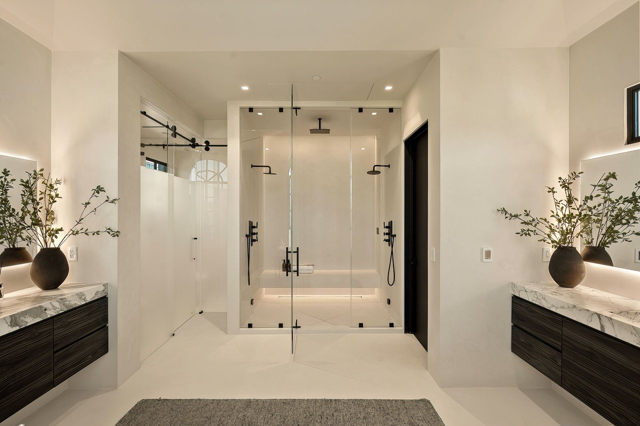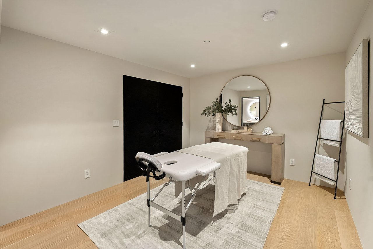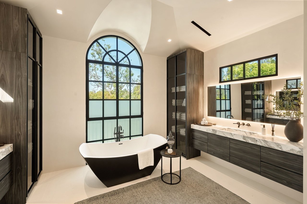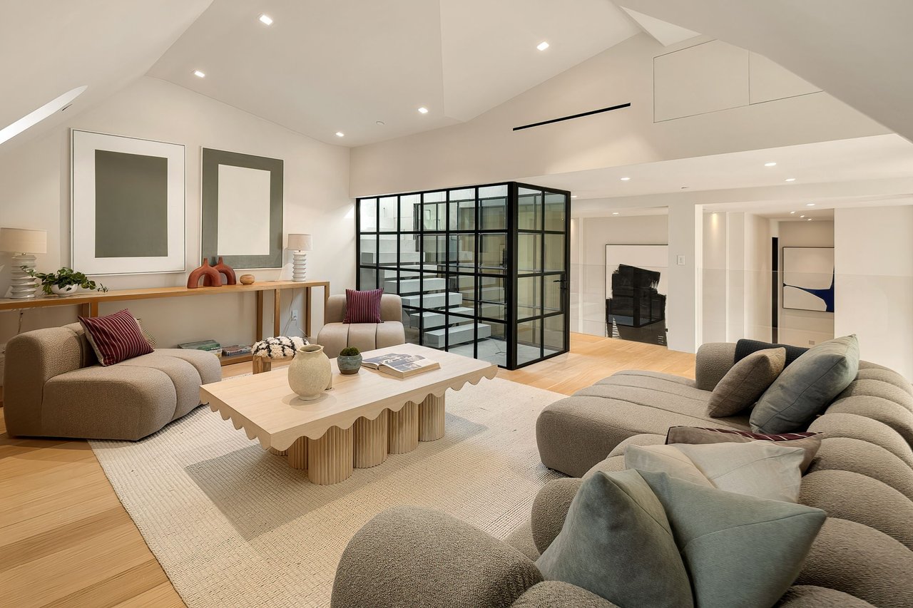 Supremely positioned north of Sunset in Brentwood, 155 North Anita Avenue is a newly constructed Modern French residence that blends timeless European influence with a refined contemporary aesthetic. Spanning 9,777 square feet with 6 bedrooms and 9 bathrooms, the home makes an immediate impression with a striking double-height entry, where a sculptural floating staircase and premium Semco flooring set a sophisticated tone. From there, expansive windows draw in natural light, illuminating warm hardwood floors that carry throughout the open-concept main level and connect a series of elegant yet inviting living spaces. Designed with both scale and flow in mind, the interiors unfold seamlessly from the formal dining room to a lounge with wet bar and into an expansive great room that opens directly to a heated loggia. The chef-inspired kitchen balances form and function with imported marble countertops, contrasting Pedini cabinetry, and a generous seated island. A discreet butler's pantry enhances usability, while a suite of premium appliances, including a Wolf double-oven range, dual Miele dishwashers, and Sub-Zero refrigeration, supports both everyday living and elevated entertaining. Just beyond, the resort-like backyard is framed by mature hedging, offering a tranquil setting with a pool and spa, turf lawn, and multiple areas for lounging and dining al fresco. Throughout the home, integrated systems provide modern convenience, including an elevator, Crestron home automation, Lutron lighting, surround sound, 10-zone climate control, heated bathroom floors, and a solar system. Upstairs, a relaxed atmosphere unfolds with a comfortable family room opening to the rooftop deck that captures panoramic views across the Westside. Four en suite bedrooms are also located on this level, including the primary suite, which is designed as a private retreat with direct access to a private terrace, an expansive walk-in closet, and a spa-like bathroom featuring a dual steam shower, soaking tub, and separate vanities. The lower level is dedicated to leisure and entertainment, where a spacious recreation room with a full wet bar is complemented by a temperature-controlled wine cellar and tasting room, a screening room, and a gym with infrared sauna. Two additional bedroom suites with a separate entrance provide ideal accommodations for staff or guests, supported by laundry rooms on both the upper and lower levels. A comprehensive security system with cameras, a three-car garage, and parking for up to nine vehicles complete the offering. Located just moments from Brentwood Country Club, top-rated schools, premier dining and shopping along San Vicente Blvd, and less than ten minutes from the beach, this residence offers a rare combination of privacy, scale, and access within one of the Westside's most desirable enclaves.