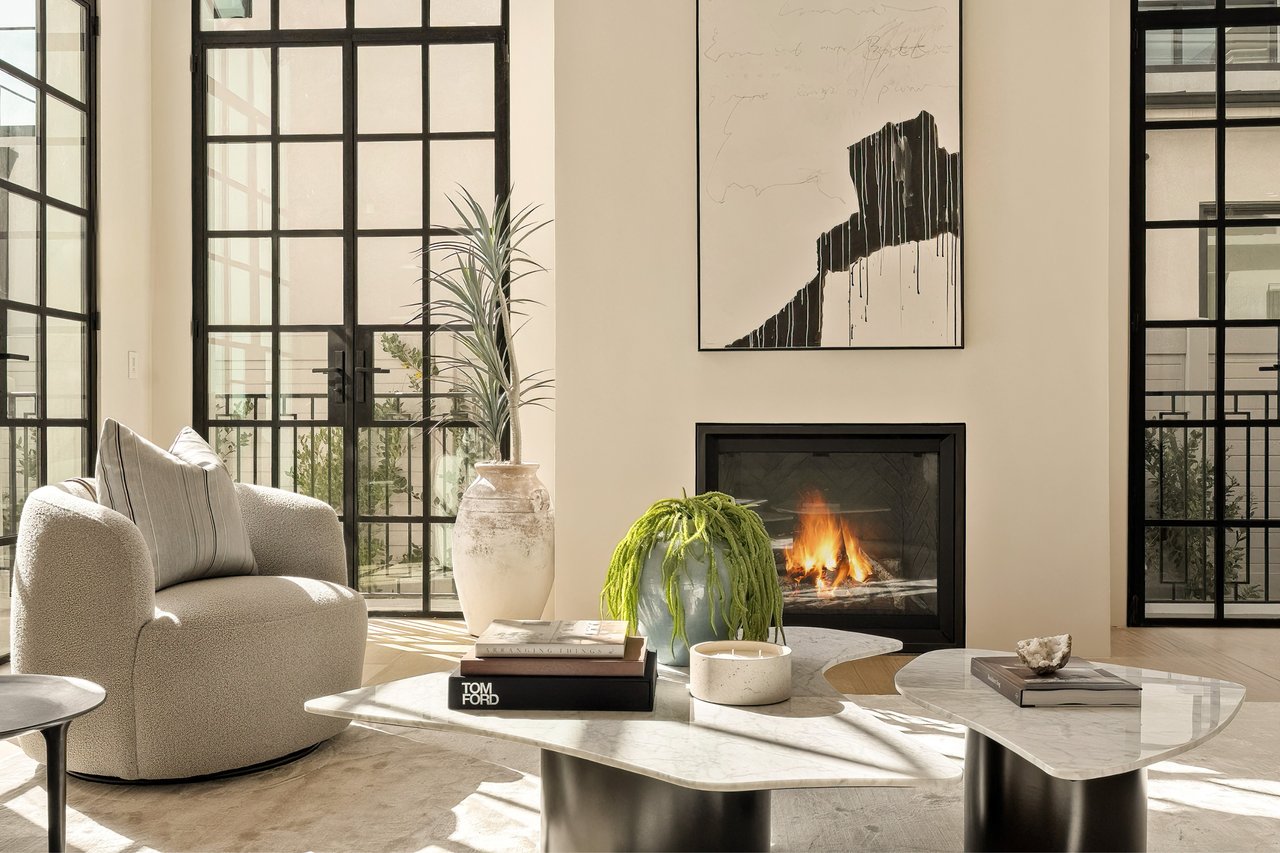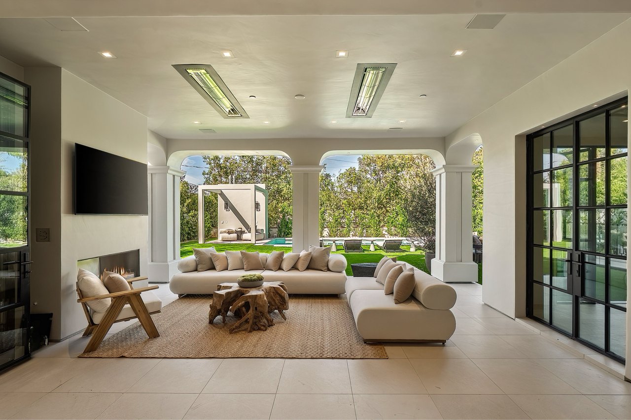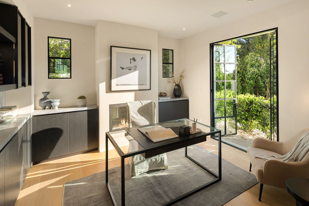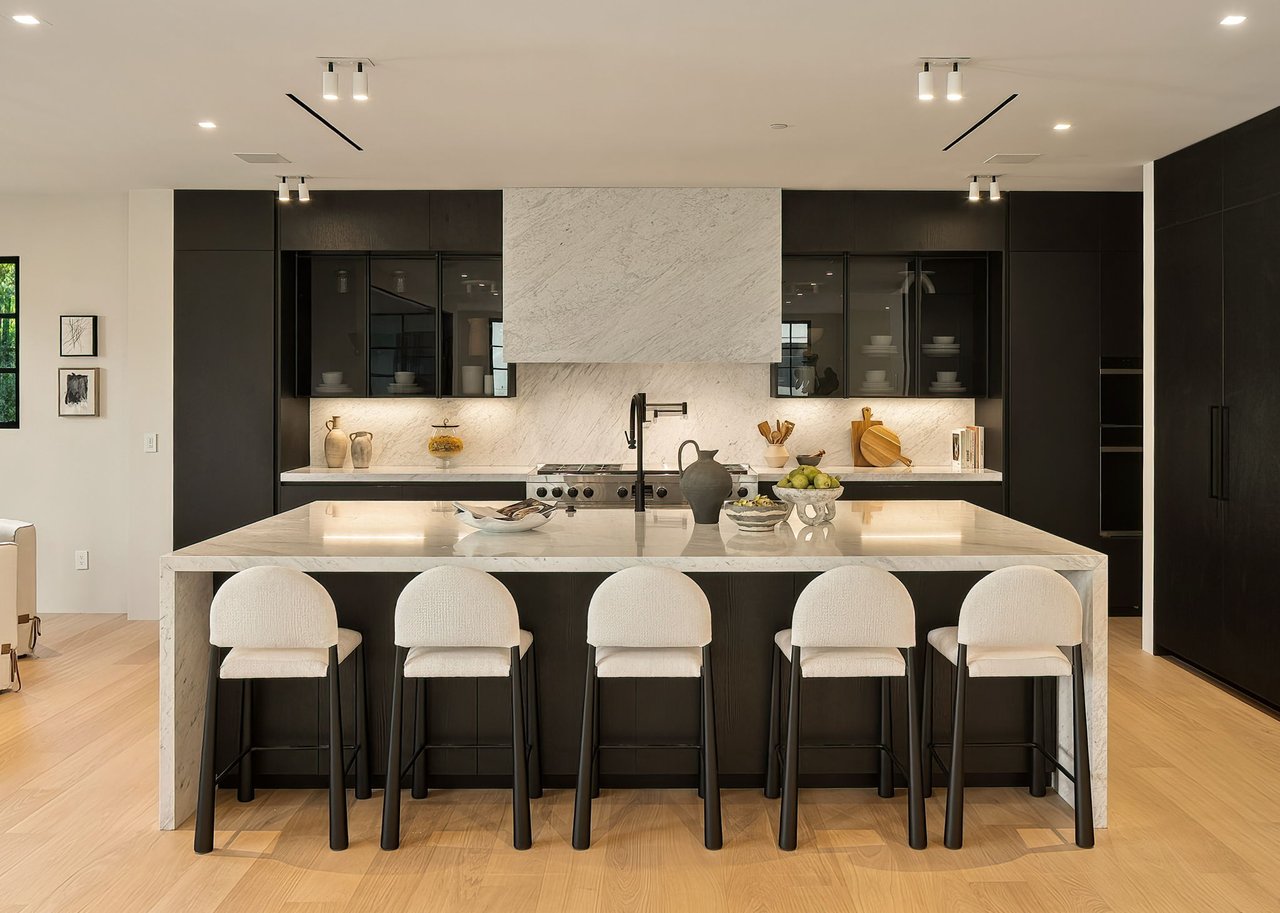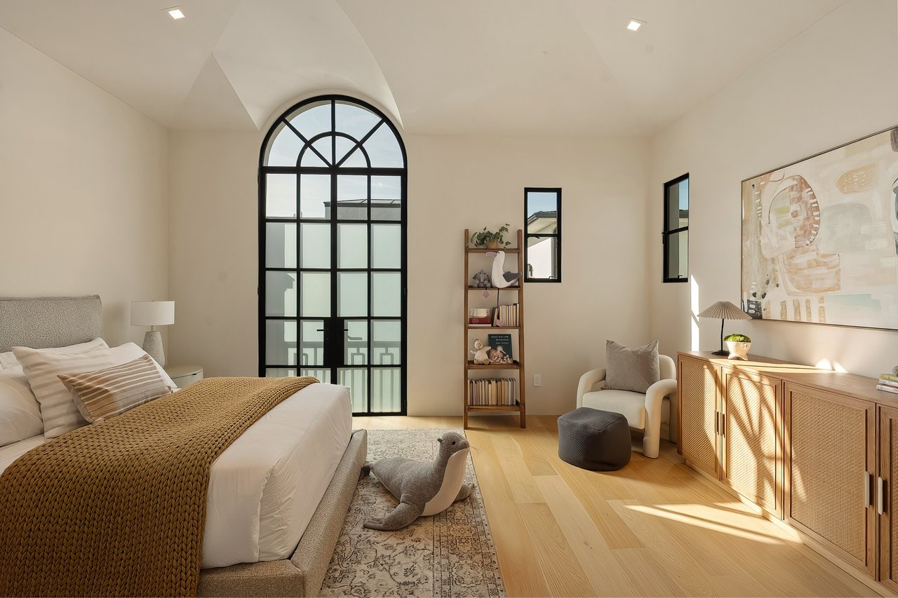 Supremely positioned north of Sunset in Brentwood, 155 North Anita Avenue is a newly constructed Modern French residence that blends timeless European influence with a refined contemporary aesthetic. Spanning 9,777 square feet with 6 bedrooms and 9 bathrooms, the home makes an immediate impression with a striking double-height entry, where a sculptural floating staircase and premium Semco flooring set a sophisticated tone. From there, expansive windows draw in natural light, illuminating warm hardwood floors that carry throughout the open-concept main level and connect a series of elegant yet inviting living spaces. Designed with both scale and flow in mind, the interiors unfold seamlessly from the formal dining room to a lounge with wet bar and into an expansive great room that opens directly to a heated loggia. The chef-inspired kitchen balances form and function with imported marble countertops, contrasting Pedini cabinetry, and a generous seated island. A discreet butler's pantry enhances usability, while a suite of premium appliances, including a Wolf double-oven range, dual Miele dishwashers, and Sub-Zero refrigeration, supports both everyday living and elevated entertaining. Just beyond, the resort-like backyard is framed by mature hedging, offering a tranquil setting with a pool and spa, turf lawn, and multiple areas for lounging and dining al fresco. Throughout the home, integrated systems provide modern convenience, including an elevator, Crestron home automation, Lutron lighting, surround sound, 10-zone climate control, heated bathroom floors, and a solar system. Upstairs, a relaxed atmosphere unfolds with a comfortable family room opening to the rooftop deck that captures panoramic views across the Westside. Four en suite bedrooms are also located on this level, including the primary suite, which is designed as a private retreat with direct access to a private terrace, an expansive walk-in closet, and a spa-like bathroom featuring a dual steam shower, soaking tub, and separate vanities. The lower level is dedicated to leisure and entertainment, where a spacious recreation room with a full wet bar is complemented by a temperature-controlled wine cellar and tasting room, a screening room, and a gym with infrared sauna. Two additional bedroom suites with a separate entrance provide ideal accommodations for staff or guests, supported by laundry rooms on both the upper and lower levels. A comprehensive security system with cameras, a three-car garage, and parking for up to nine vehicles complete the offering. Located just moments from Brentwood Country Club, top-rated schools, premier dining and shopping along San Vicente Blvd, and less than ten minutes from the beach, this residence offers a rare combination of privacy, scale, and access within one of the Westside's most desirable enclaves.