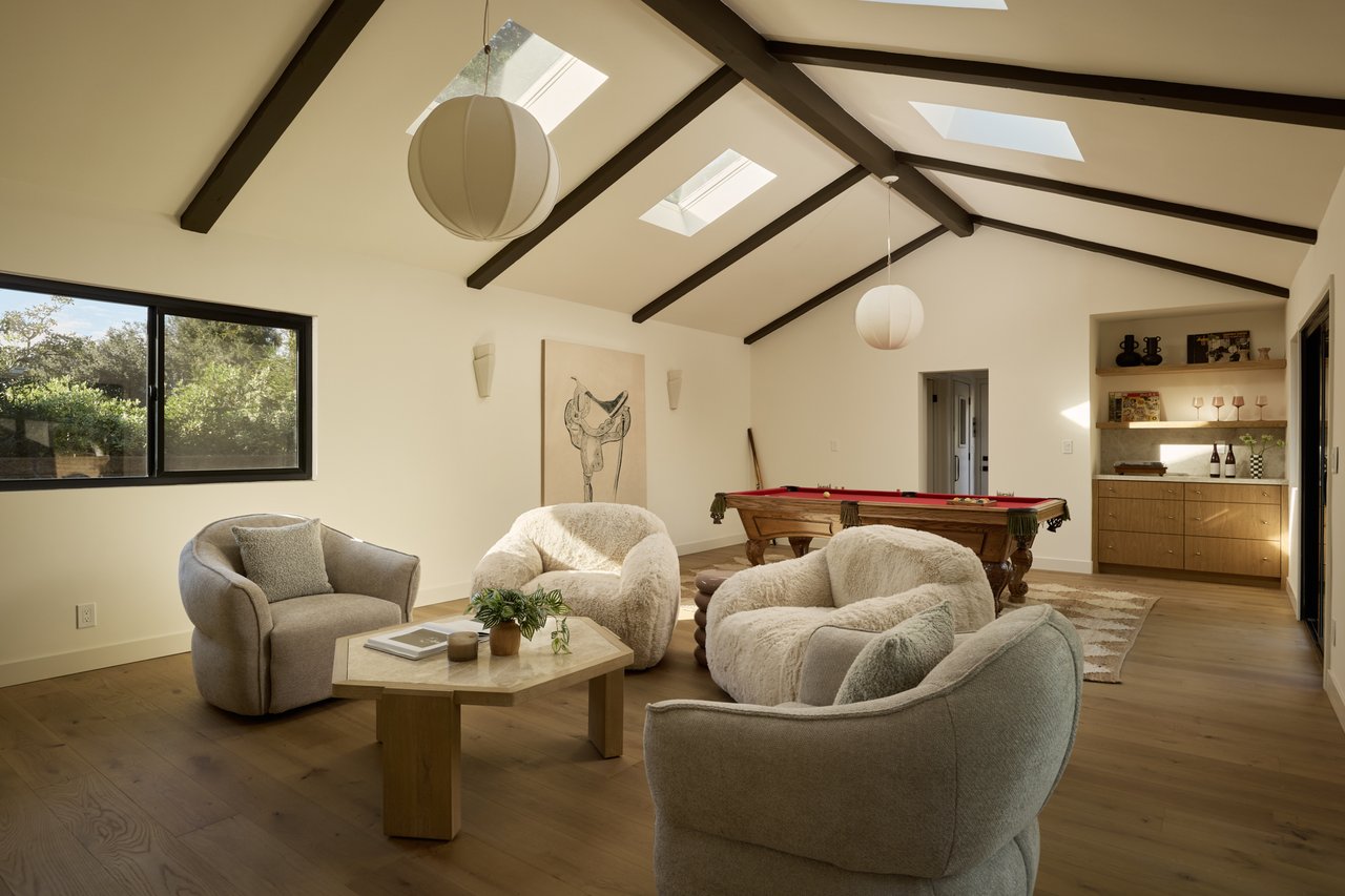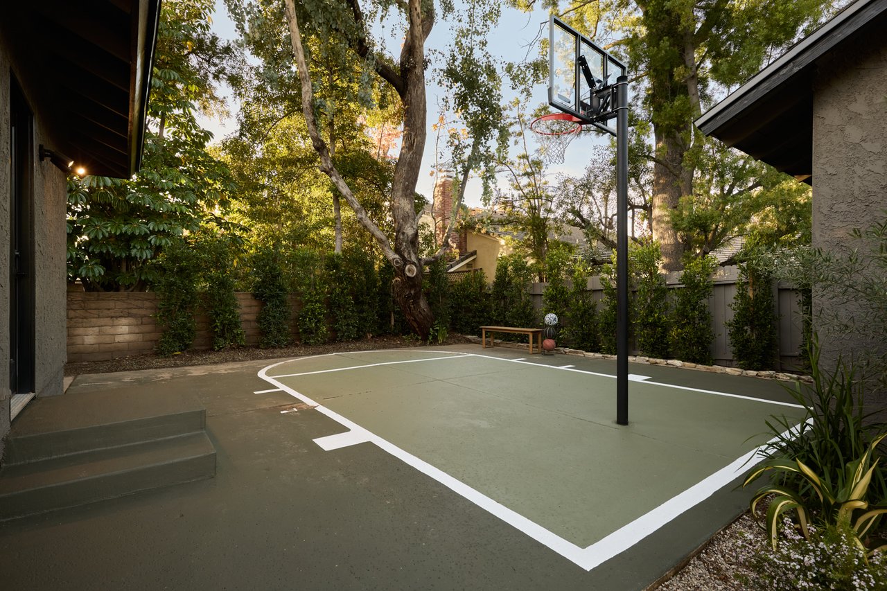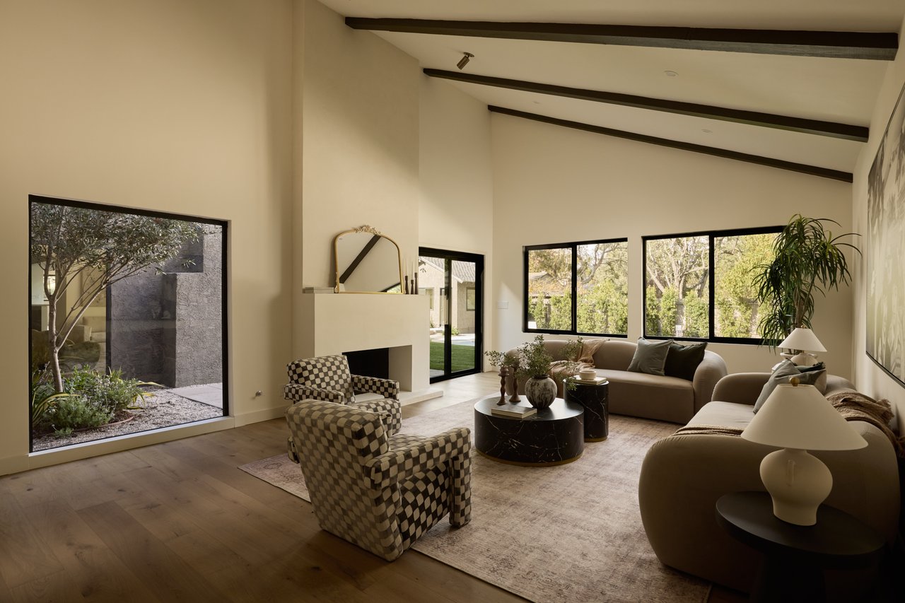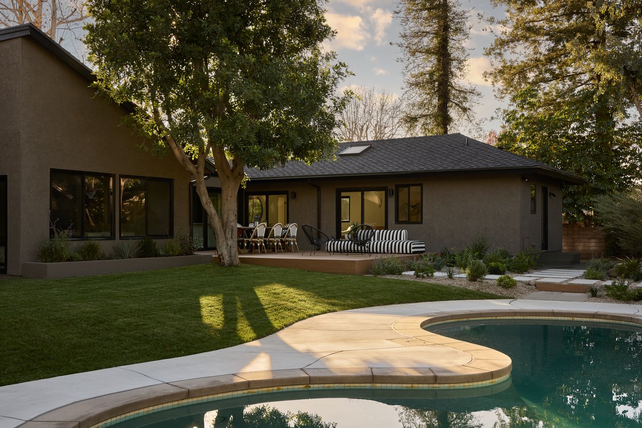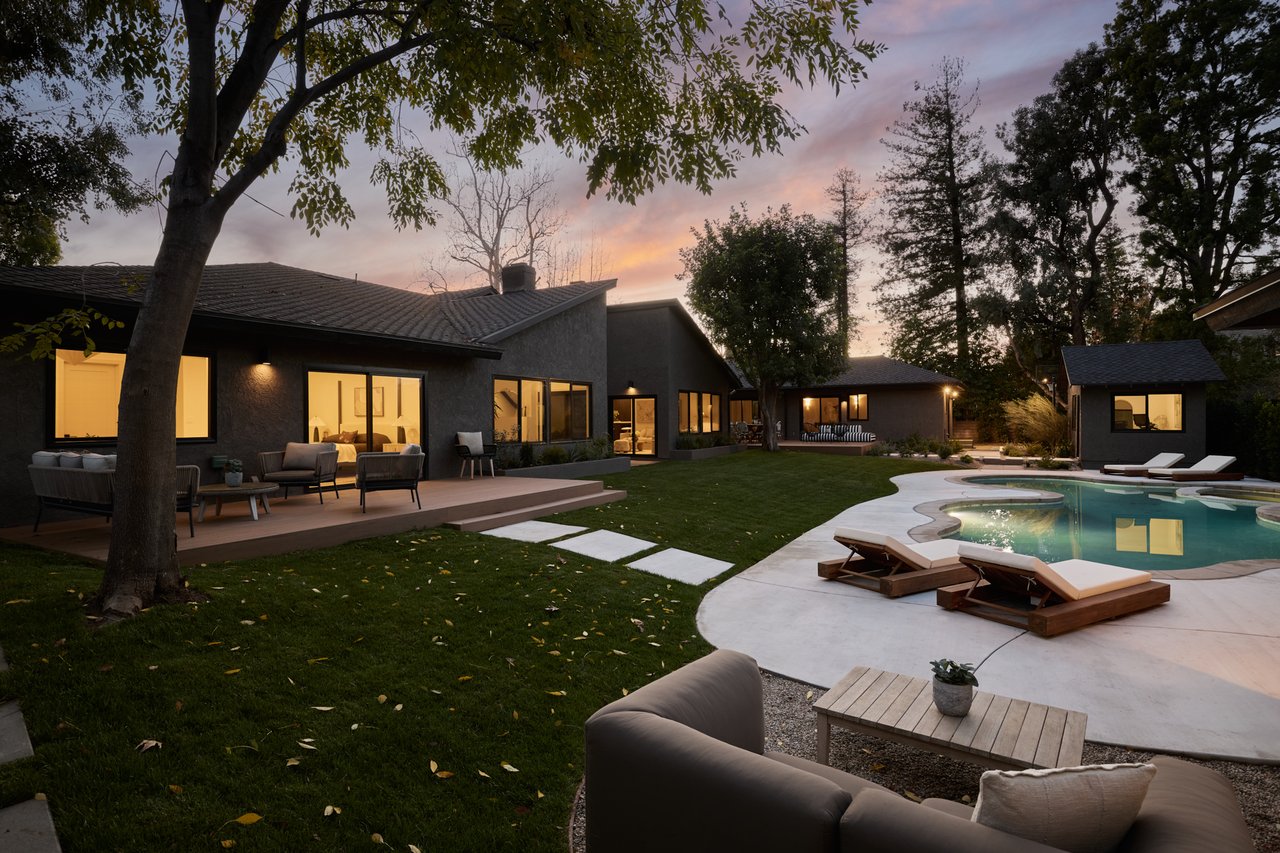 Completely reimagined for modern living by Maverick Design, this 1970s Ranch-style home in Encino blends timeless character with contemporary luxury on an expansive 17,022-square-foot lot just moments from vibrant Ventura Blvd. The single-story, 5,032-square-foot layout unfolds with effortless ease, grounded by wide-plank oak floors, designer lighting, oversized picture windows, and a refined palette of modern finishes. Enter through double doors to the dramatic entry foyer that sets the tone for the home's beautifully connected living spaces. The formal living room, accented by soaring vaulted ceilings and a built-in bar, invites stylish entertaining, while the family room's striking stone fireplace creates a relaxed gathering place that opens directly to the gourmet kitchen. Designed as the heart of the home, the kitchen is appointed with Perla Venata leathered stone countertops and backsplash, premium appliances including an oversized double-oven range, and a generous walk-in pantry. Nearby, the formal dining room provides an elegant setting for dinner parties, and an expansive recreation room, with an in-home wooden sauna and direct access to the backyard, offers a versatile space to unwind. Four spacious bedrooms are thoughtfully positioned, including a serene primary suite with dual walk-in closets, a cozy sitting area, and a stone-clad ensuite featuring a dual vanity and a glass-enclosed wet room with a shower and soaking tub. A dedicated office, gym, laundry room, and attached three-car garage meet the demands of modern living with ease. Outside, discover a true resort-style sanctuary. Multiple outdoor lounge areas wrap around a sparkling pool and spa, complemented by a detached pool bar and bathroom, mature trees, a manicured lawn, and a private sport court, creating the ultimate backdrop for both intimate gatherings and large-scale entertaining. Set in a prime Encino neighborhood near renowned restaurants, top-rated schools, parks, and the El Caballero Country Club, this meticulously renovated home offers a rare blend of sophistication, comfort, and California living at its finest.