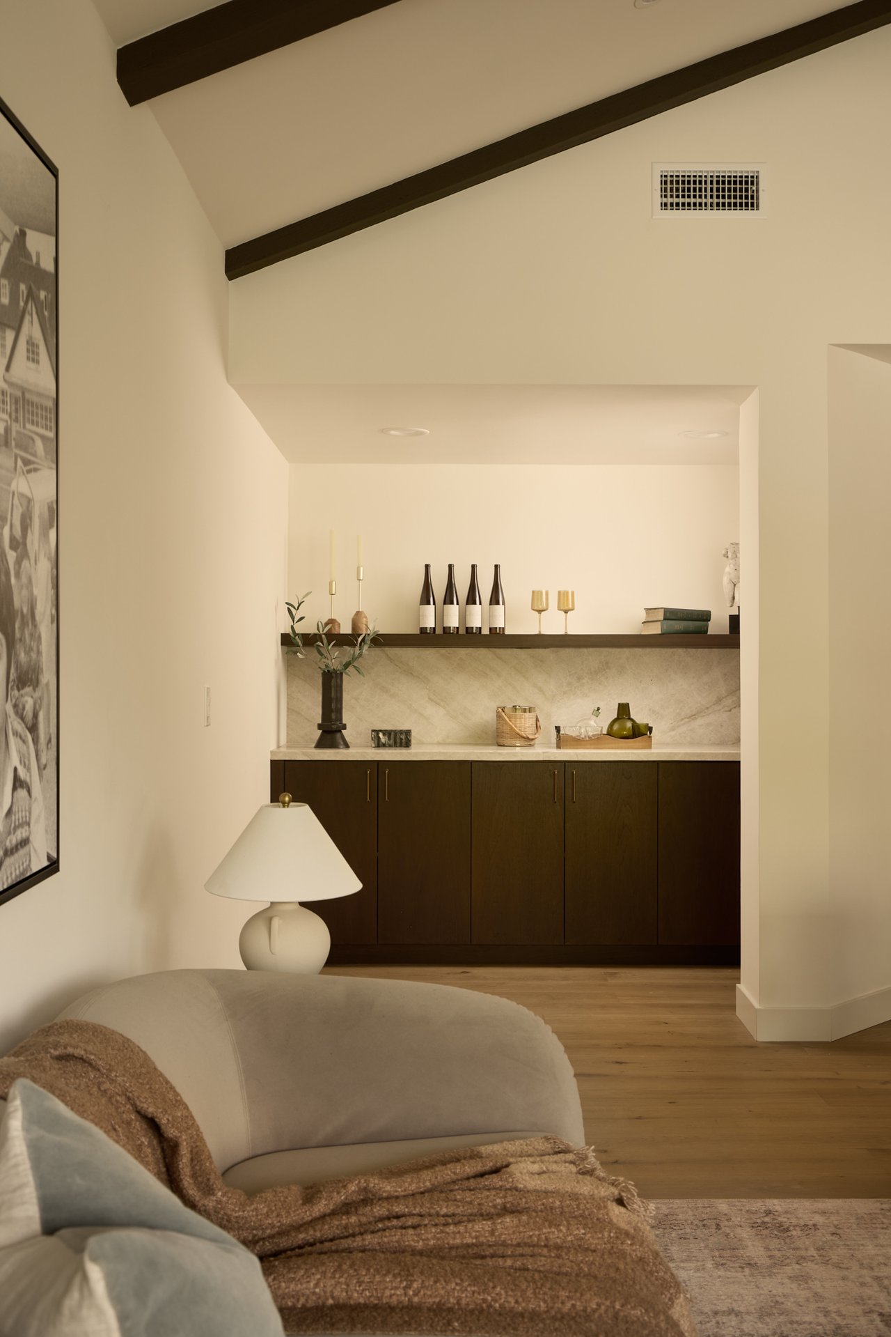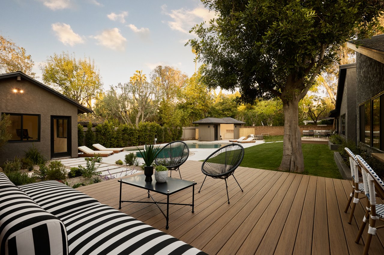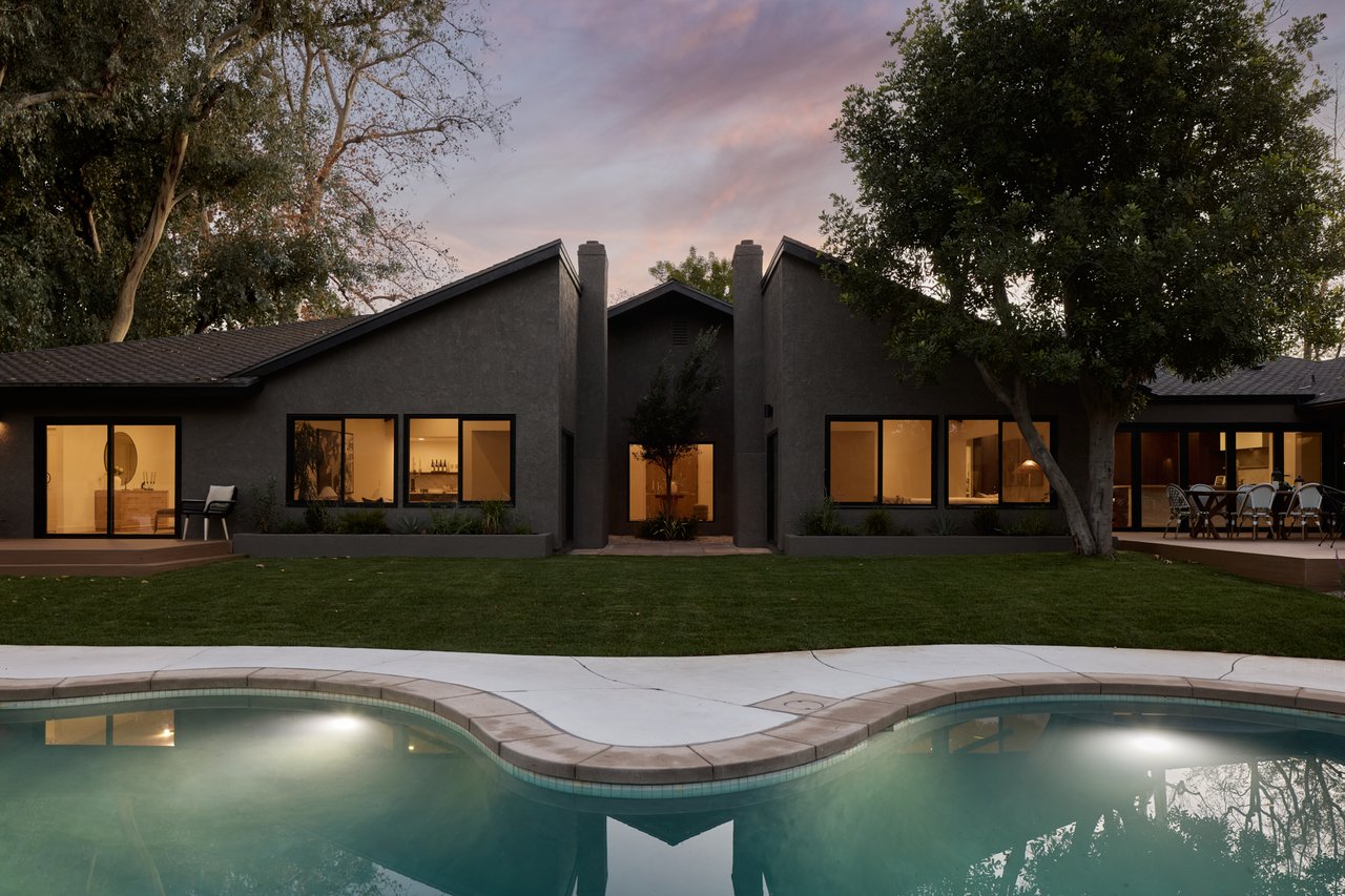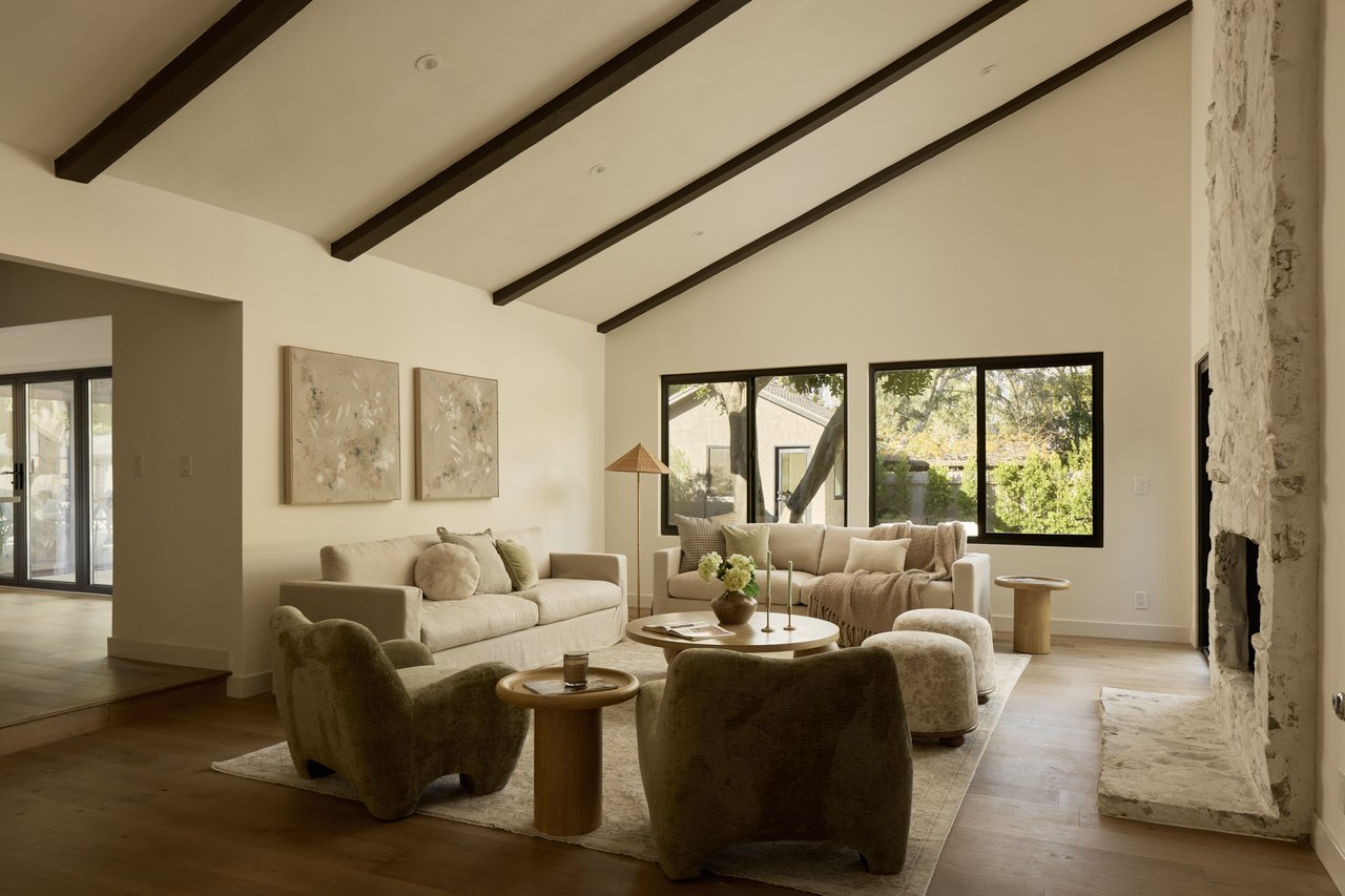 Completely reimagined for modern living by Maverick Design, this 1970s Ranch-style home in Encino blends timeless character with contemporary luxury on an expansive 17,022-square-foot lot just moments from vibrant Ventura Blvd. The single-story, 5,032-square-foot layout unfolds with effortless ease, grounded by wide-plank oak floors, designer lighting, oversized picture windows, and a refined palette of modern finishes. Enter through double doors to the dramatic entry foyer that sets the tone for the home's beautifully connected living spaces. The formal living room, accented by soaring vaulted ceilings and a built-in bar, invites stylish entertaining, while the family room's striking stone fireplace creates a relaxed gathering place that opens directly to the gourmet kitchen. Designed as the heart of the home, the kitchen is appointed with Perla Venata leathered stone countertops and backsplash, premium appliances including an oversized double-oven range, and a generous walk-in pantry. Nearby, the formal dining room provides an elegant setting for dinner parties, and an expansive recreation room, with an in-home wooden sauna and direct access to the backyard, offers a versatile space to unwind. Four spacious bedrooms are thoughtfully positioned, including a serene primary suite with dual walk-in closets, a cozy sitting area, and a stone-clad ensuite featuring a dual vanity and a glass-enclosed wet room with a shower and soaking tub. A dedicated office, gym, laundry room, and attached three-car garage meet the demands of modern living with ease. Outside, discover a true resort-style sanctuary. Multiple outdoor lounge areas wrap around a sparkling pool and spa, complemented by a detached pool bar and bathroom, mature trees, a manicured lawn, and a private sport court, creating the ultimate backdrop for both intimate gatherings and large-scale entertaining. Set in a prime Encino neighborhood near renowned restaurants, top-rated schools, parks, and the El Caballero Country Club, this meticulously renovated home offers a rare blend of sophistication, comfort, and California living at its finest.