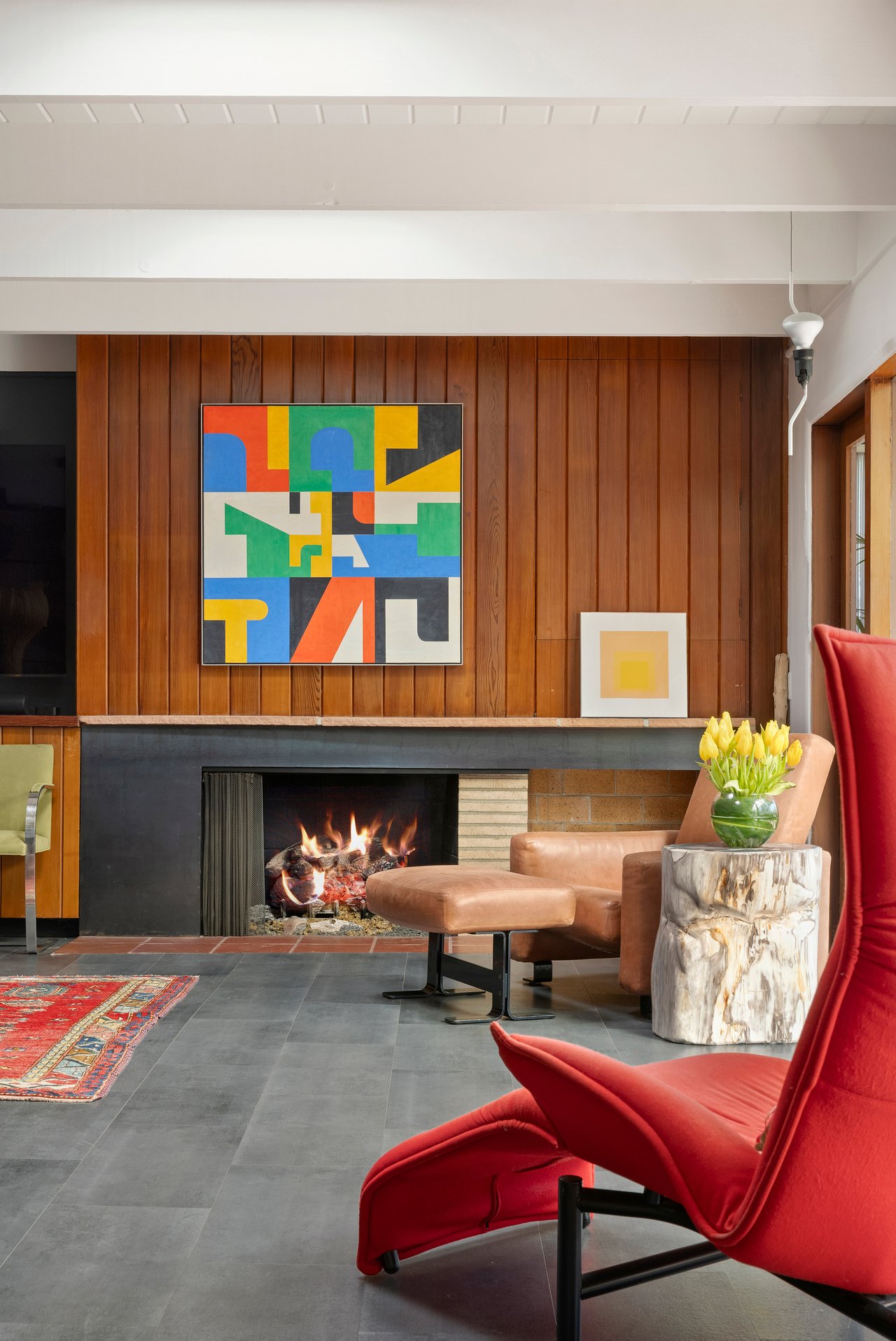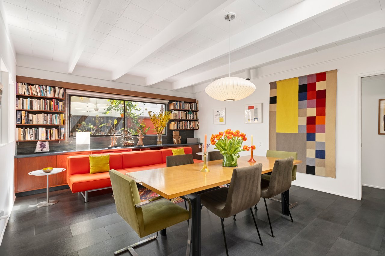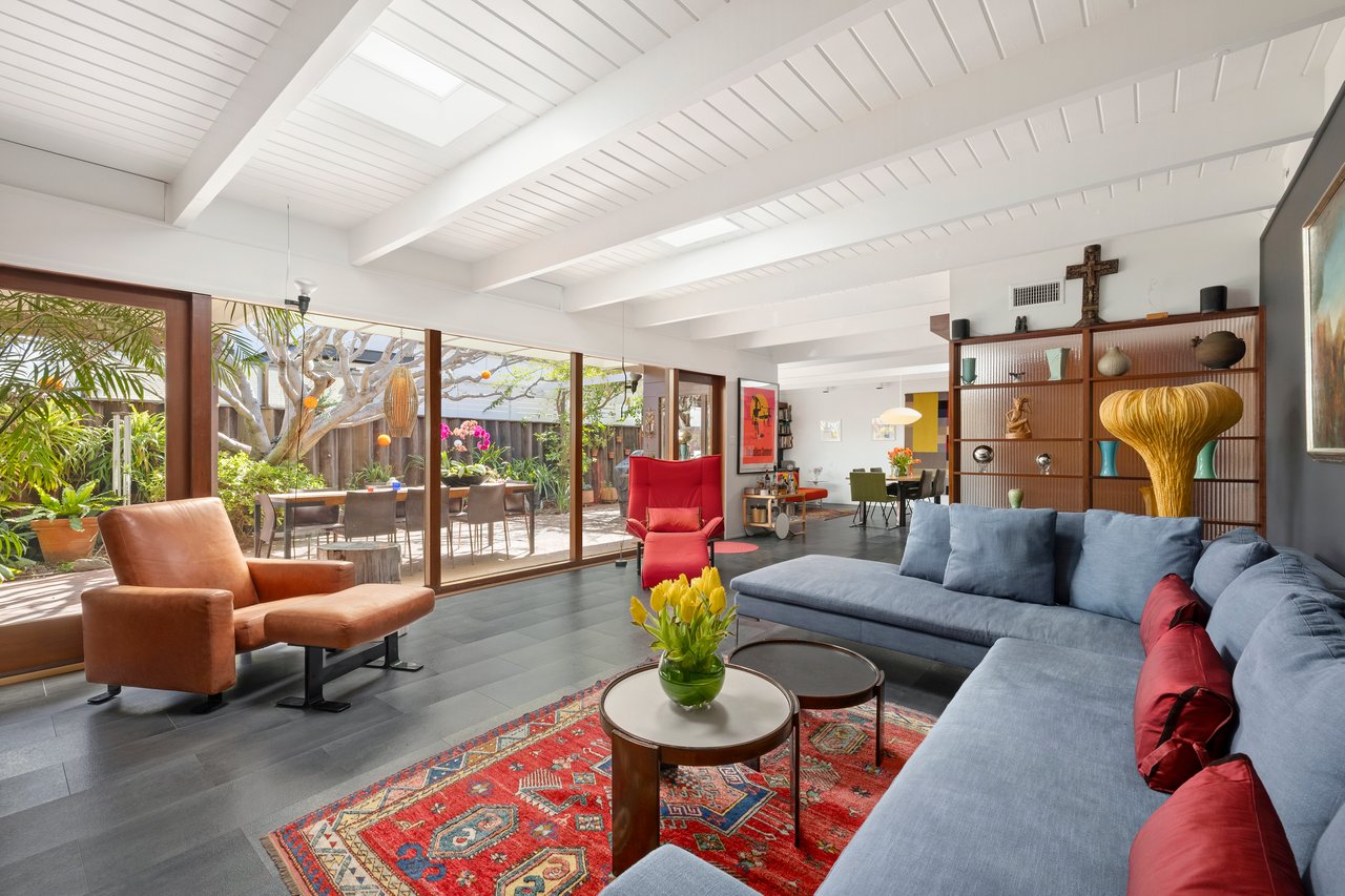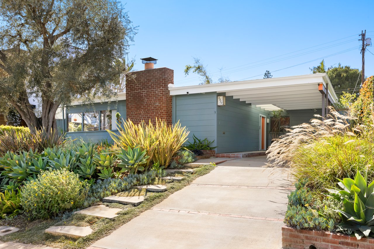 A family and dog-friendly neighborhood with tree-lined streets and Mid-Century modern architecture.