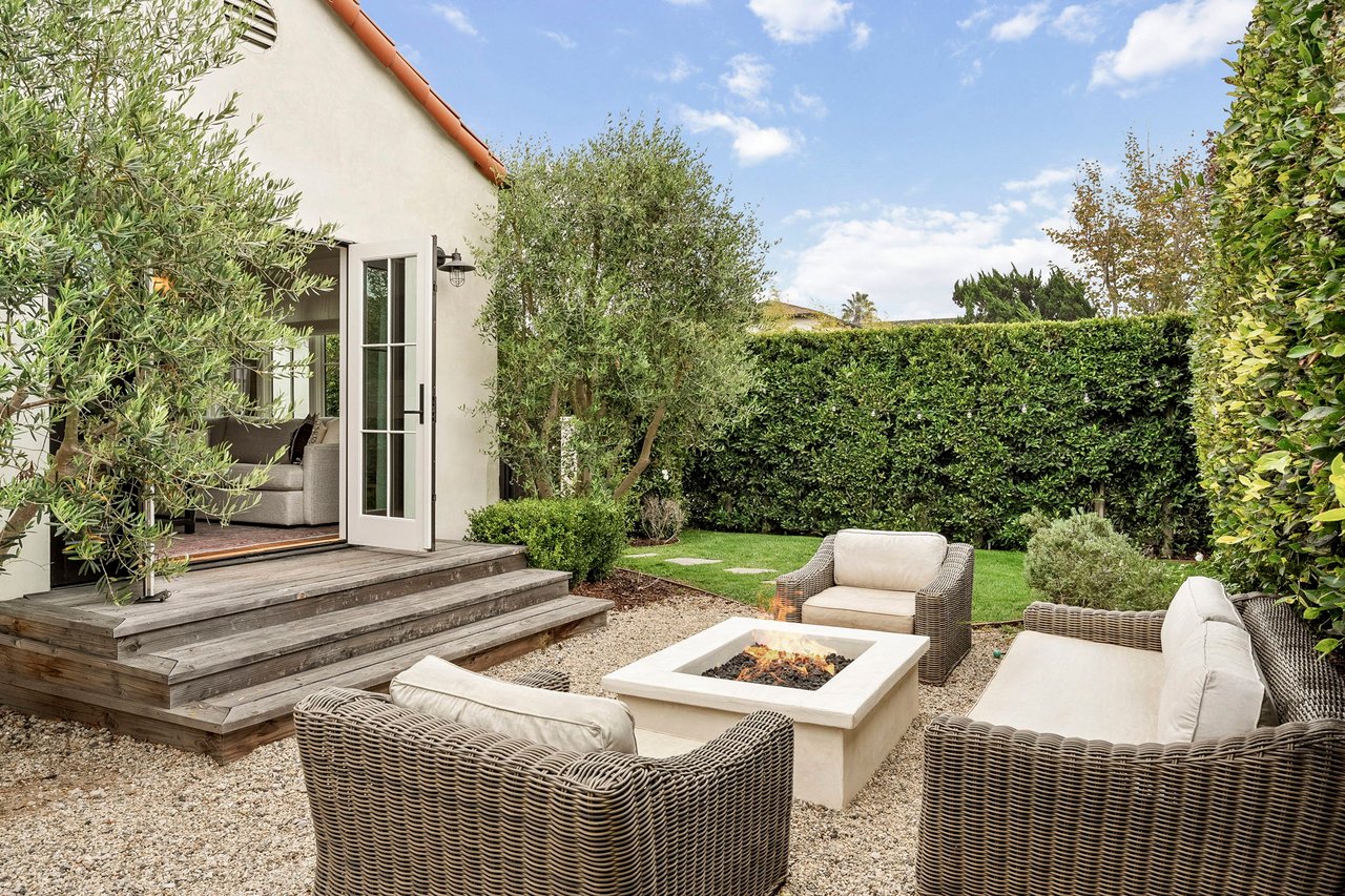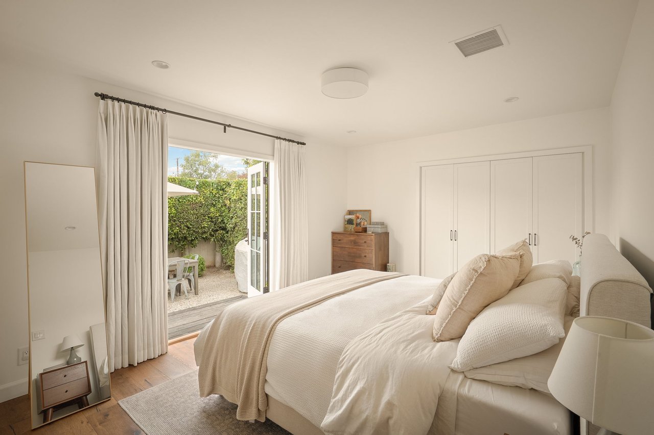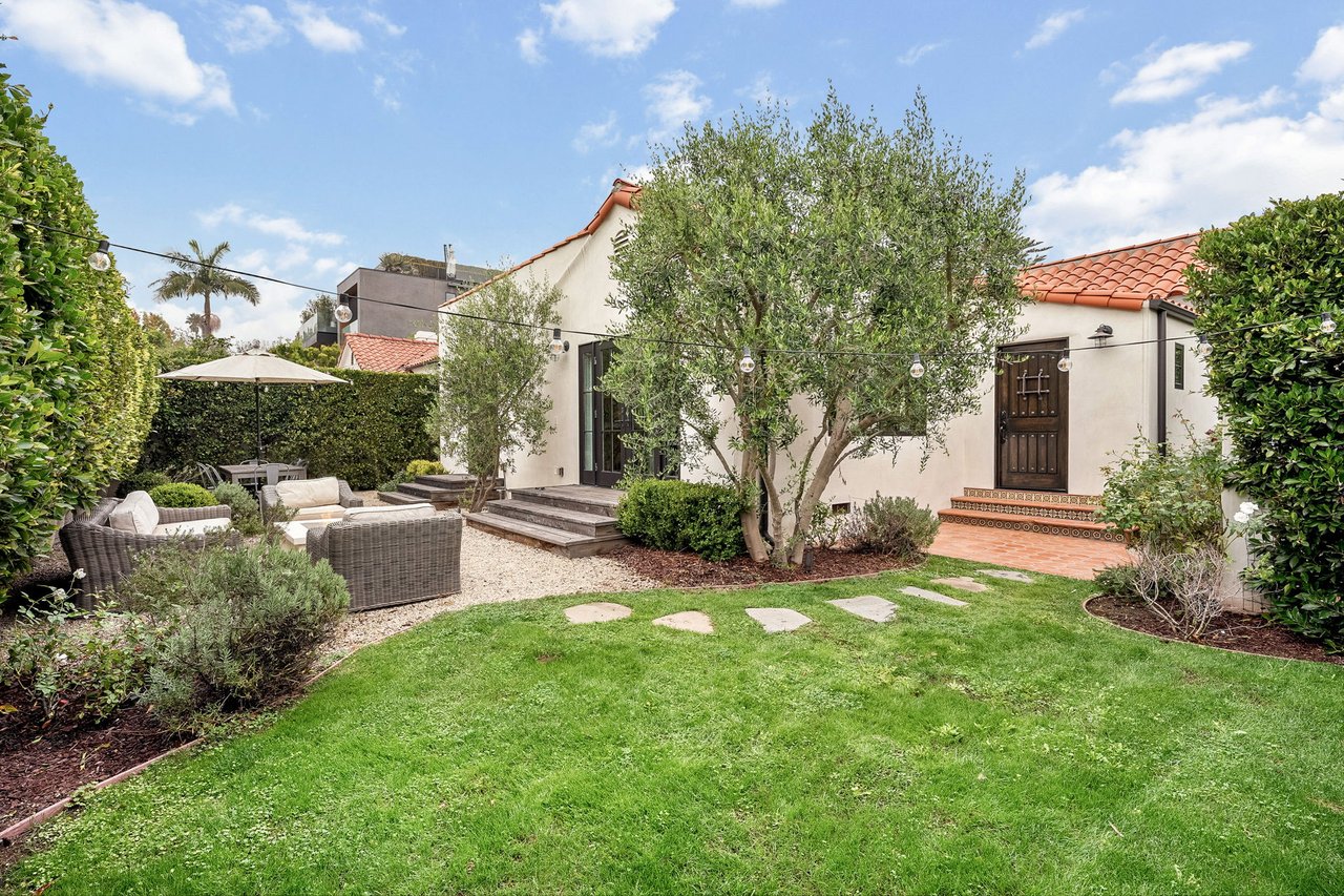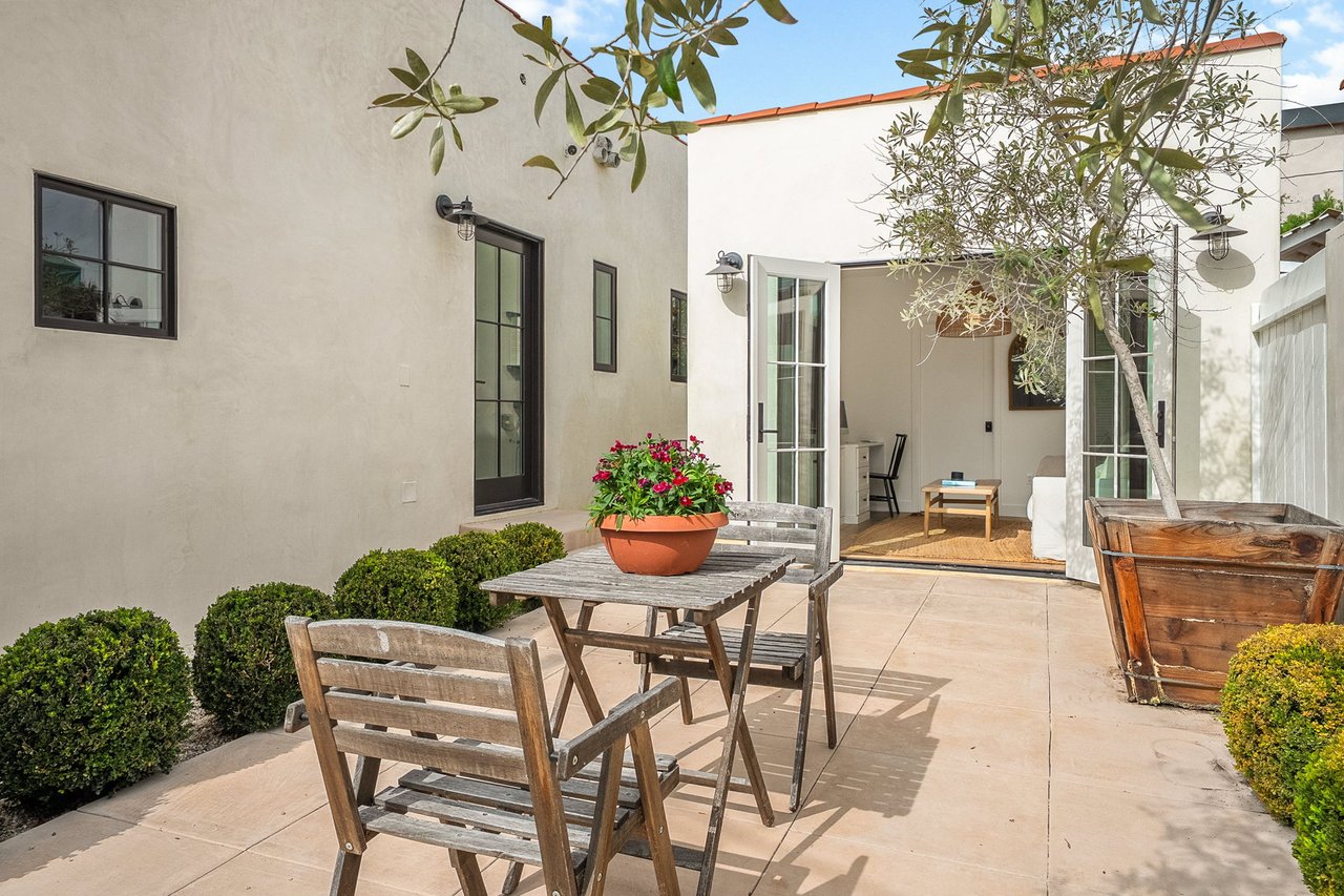 Discreetly tucked behind tall privacy hedging, this exquisite 1920s Spanish-style residence was completely renovated in 2020—blending timeless architectural character with thoughtful modern updates in the heart of Mar Vista. The home's classic charm is evident throughout, featuring coved ceilings, terracotta tile, warm wood floors, and a traditional barrel tile roof. Large windows fill the interior with natural light, while sculptural lighting and elegant sconces create a refined and welcoming atmosphere. The spacious living room, anchored by a gas fireplace and wired for surround sound, provides a comfortable setting for both relaxing and entertaining, with French doors that open directly to the backyard for effortless indoor-outdoor living. In the kitchen, every detail has been curated for both beauty and function. A seated, natural stone-topped island takes center stage, while premium Thermador appliances and abundant pantry storage make cooking an absolute pleasure. Adjacent to the kitchen, a sunlit dining area with a built-in banquette creates an inviting space for gatherings. Down the hall are two well-appointed bedrooms, including a serene primary with dual closets and another set of French doors that open to the backyard. The primary bathroom is clad in custom marble tile and features a dual sink vanity and a glass-enclosed shower. Outside, a private backyard oasis awaits, complete with an expansive patio for al fresco dining and entertaining, a firepit for evening relaxation, stately olive trees, and a lush lawn. The fully permitted detached suite with a full bathroom provides versatile options for a guest bedroom, home office, or studio. Integrated home tech offers peace of mind and optimal connectivity with pre-wired fiber internet, cable, and hardwired security cameras on the property's exterior. Additional highlights include a formal entryway with built-in storage, a stylish powder room, a stacked laundry area, and two driveway parking spaces. Ideally located in a sought-after Mar Vista neighborhood, this home offers convenient access to local shopping, dining, and amenities along Venice Boulevard, and is less than ten minutes from Abbot Kinney and the beach. A rare blend of classic charm, modern luxury, and exceptional privacy, this Spanish gem exemplifies the best of Westside living.