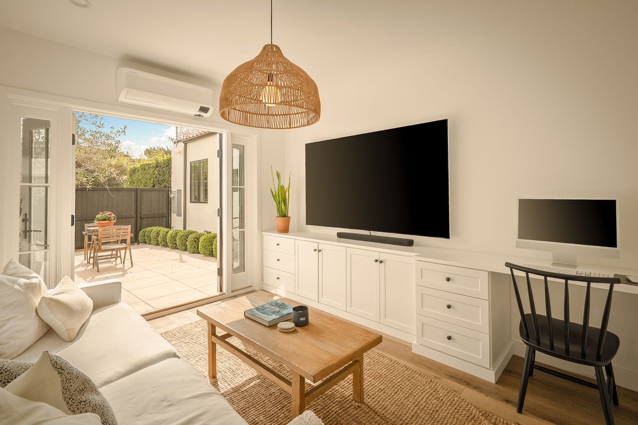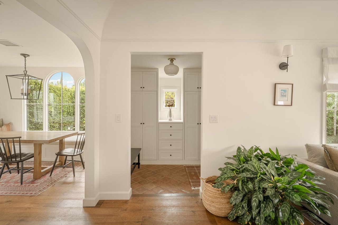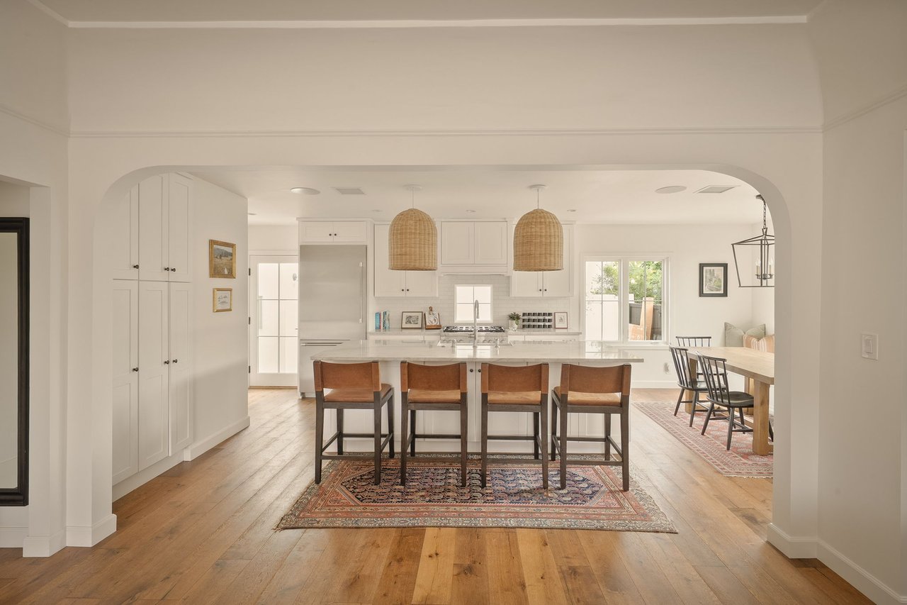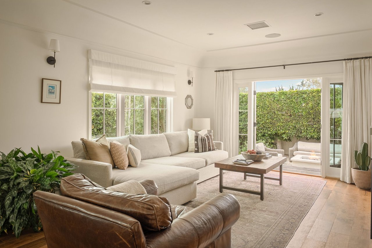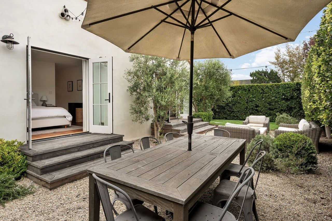 Discreetly tucked behind tall privacy hedging, this exquisite 1920s Spanish-style residence was completely renovated in 2020—blending timeless architectural character with thoughtful modern updates in the heart of Mar Vista. The home's classic charm is evident throughout, featuring coved ceilings, terracotta tile, warm wood floors, and a traditional barrel tile roof. Large windows fill the interior with natural light, while sculptural lighting and elegant sconces create a refined and welcoming atmosphere. The spacious living room, anchored by a gas fireplace and wired for surround sound, provides a comfortable setting for both relaxing and entertaining, with French doors that open directly to the backyard for effortless indoor-outdoor living. In the kitchen, every detail has been curated for both beauty and function. A seated, natural stone-topped island takes center stage, while premium Thermador appliances and abundant pantry storage make cooking an absolute pleasure. Adjacent to the kitchen, a sunlit dining area with a built-in banquette creates an inviting space for gatherings. Down the hall are two well-appointed bedrooms, including a serene primary with dual closets and another set of French doors that open to the backyard. The primary bathroom is clad in custom marble tile and features a dual sink vanity and a glass-enclosed shower. Outside, a private backyard oasis awaits, complete with an expansive patio for al fresco dining and entertaining, a firepit for evening relaxation, stately olive trees, and a lush lawn. The fully permitted detached suite with a full bathroom provides versatile options for a guest bedroom, home office, or studio. Integrated home tech offers peace of mind and optimal connectivity with pre-wired fiber internet, cable, and hardwired security cameras on the property's exterior. Additional highlights include a formal entryway with built-in storage, a stylish powder room, a stacked laundry area, and two driveway parking spaces. Ideally located in a sought-after Mar Vista neighborhood, this home offers convenient access to local shopping, dining, and amenities along Venice Boulevard, and is less than ten minutes from Abbot Kinney and the beach. A rare blend of classic charm, modern luxury, and exceptional privacy, this Spanish gem exemplifies the best of Westside living.
