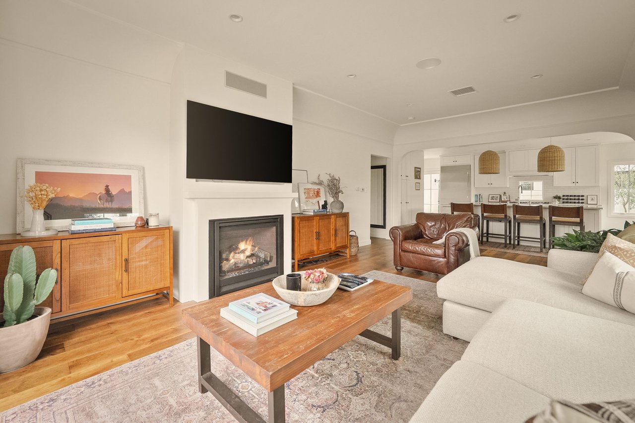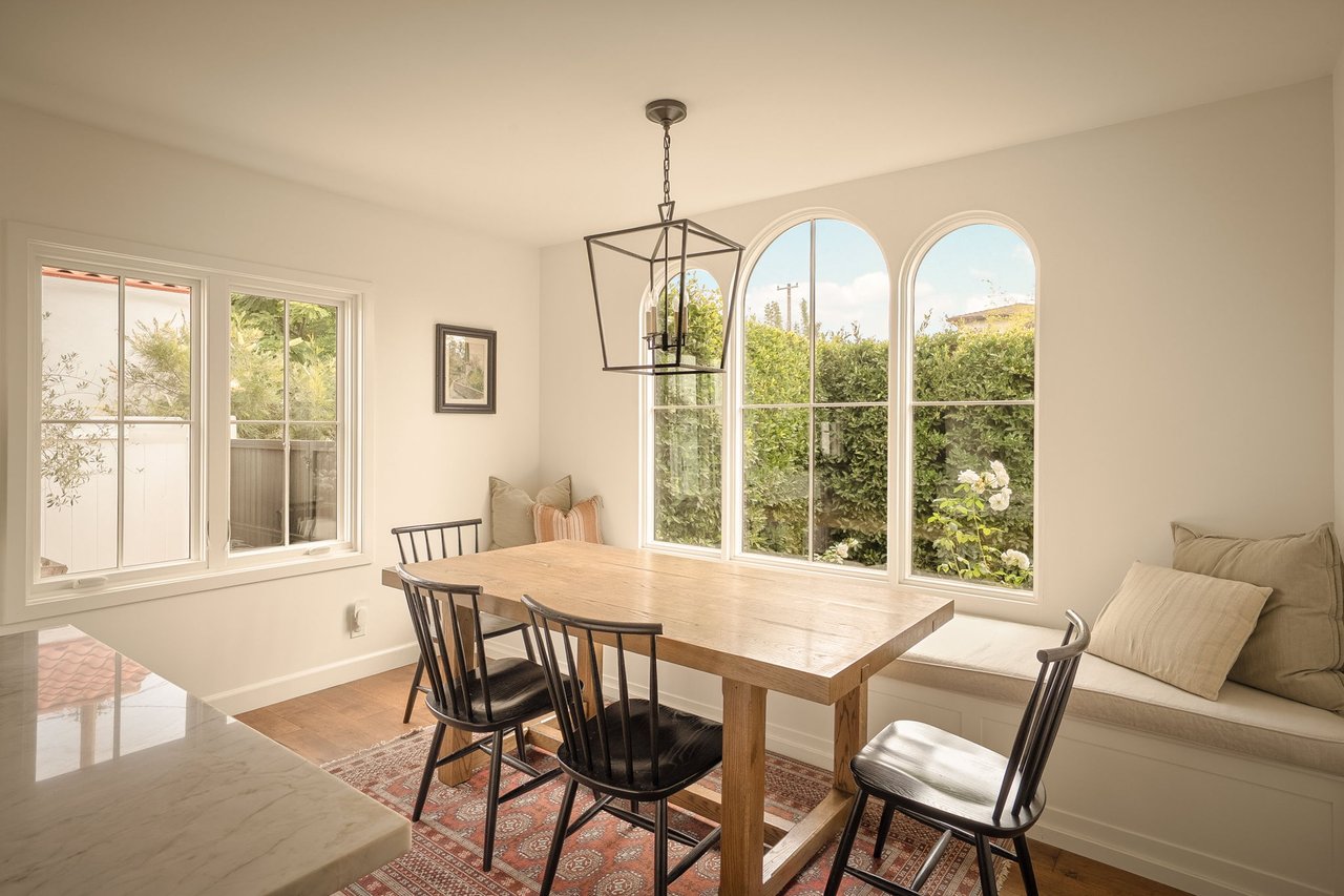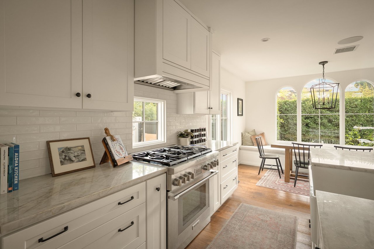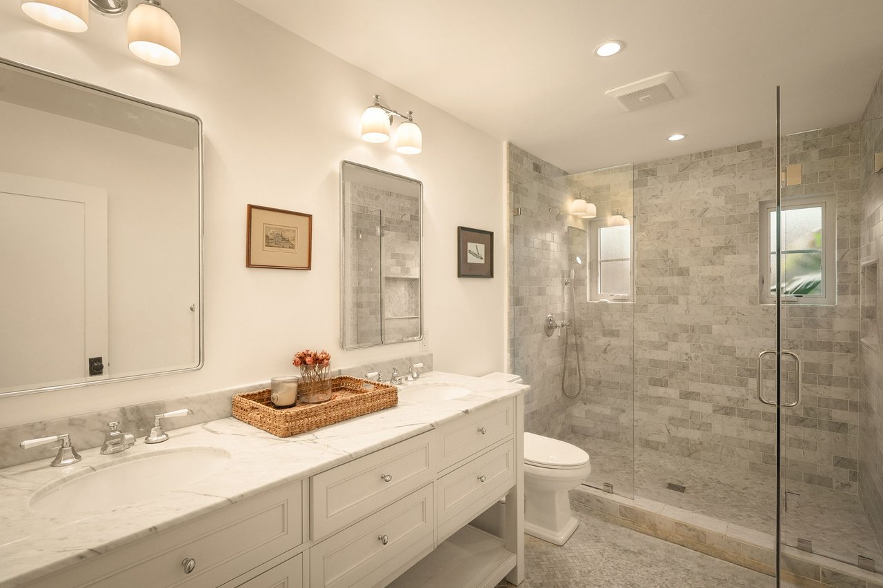 Discreetly tucked behind tall privacy hedging, this exquisite 1920s Spanish-style residence was completely renovated in 2020—blending timeless architectural character with thoughtful modern updates in the heart of Mar Vista. The home's classic charm is evident throughout, featuring coved ceilings, terracotta tile, warm wood floors, and a traditional barrel tile roof. Large windows fill the interior with natural light, while sculptural lighting and elegant sconces create a refined and welcoming atmosphere. The spacious living room, anchored by a gas fireplace and wired for surround sound, provides a comfortable setting for both relaxing and entertaining, with French doors that open directly to the backyard for effortless indoor-outdoor living. In the kitchen, every detail has been curated for both beauty and function. A seated, natural stone-topped island takes center stage, while premium Thermador appliances and abundant pantry storage make cooking an absolute pleasure. Adjacent to the kitchen, a sunlit dining area with a built-in banquette creates an inviting space for gatherings. Down the hall are two well-appointed bedrooms, including a serene primary with dual closets and another set of French doors that open to the backyard. The primary bathroom is clad in custom marble tile and features a dual sink vanity and a glass-enclosed shower. Outside, a private backyard oasis awaits, complete with an expansive patio for al fresco dining and entertaining, a firepit for evening relaxation, stately olive trees, and a lush lawn. The fully permitted detached suite with a full bathroom provides versatile options for a guest bedroom, home office, or studio. Integrated home tech offers peace of mind and optimal connectivity with pre-wired fiber internet, cable, and hardwired security cameras on the property's exterior. Additional highlights include a formal entryway with built-in storage, a stylish powder room, a stacked laundry area, and two driveway parking spaces. Ideally located in a sought-after Mar Vista neighborhood, this home offers convenient access to local shopping, dining, and amenities along Venice Boulevard, and is less than ten minutes from Abbot Kinney and the beach. A rare blend of classic charm, modern luxury, and exceptional privacy, this Spanish gem exemplifies the best of Westside living.
