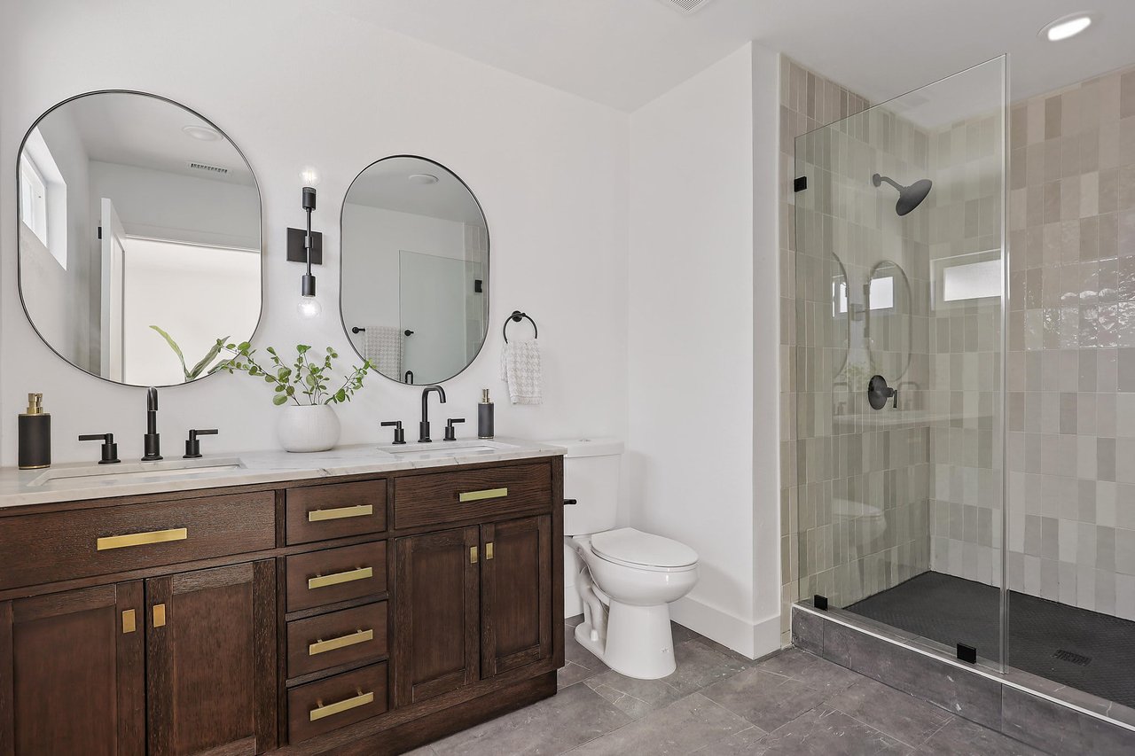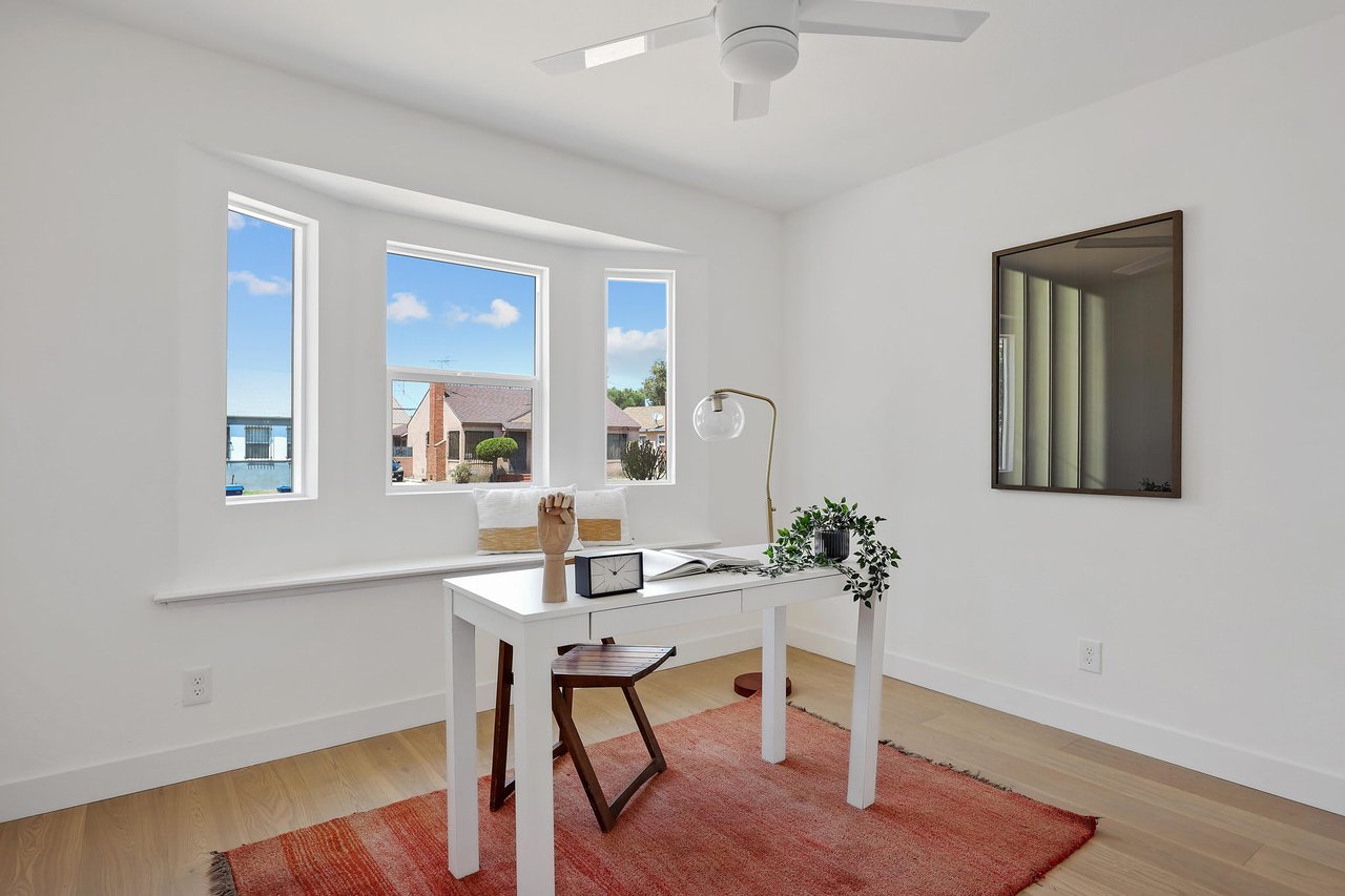 Impeccably designed California Bungalow with 3 bedrooms and 2 baths in LA's coveted Crenshaw Manor neighborhood. The home has been meticulously reimagined by Maverick Design, with thoughtful finishes and striking attention to detail. In addition to new energy-efficient windows, appliances, and designer fixtures throughout, this home features wide plank oak floors lead into an open concept great room featuring dual living areas, high beamed ceilings, and an abundance of natural light. The brand new kitchen is the centerpiece of the home and ideal for both everyday living and entertaining with custom cabinetry and backsplash, large seated island, Calcutta quartz countertops, and built-in Frigidaire Gallery appliances. The sunlit primary suite offers a private oasis at the back of the home with a large walk-in closet, en suite spa bath with a dual vanity and a custom-tiled shower, and a sliding door with direct access to the new backyard patio. The two secondary bedrooms, one with a lovely bay window, have clean finishes and generous closet space, and share the hall bath which features new tile, soaking tub, 60" double vanity, and designer fixtures. Outside the front yard features drought tolerant xeriscape and a long, gated driveway that leads to a 2-car garage with epoxy floors, an additional storage room, and a large grassy area with multiple patio spaces to enjoy the sunny LA summers. Additional property features include: new central HVAC, smart NEST thermostat, updated electrical/sub panel, and a new garage door and automatic driveway gate and all work was done with permits! Set in a highly convenient location near the Baldwin Hills Crenshaw Plaza with access to premier shopping, restaurants and entertainment options, this home offers the ideal opportunity to live out your dream California lifestyle.