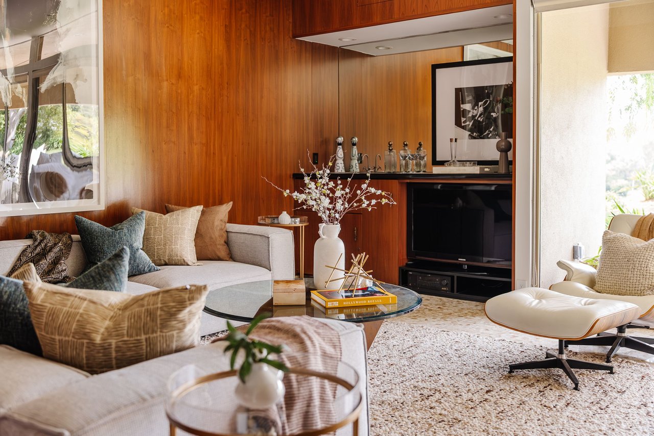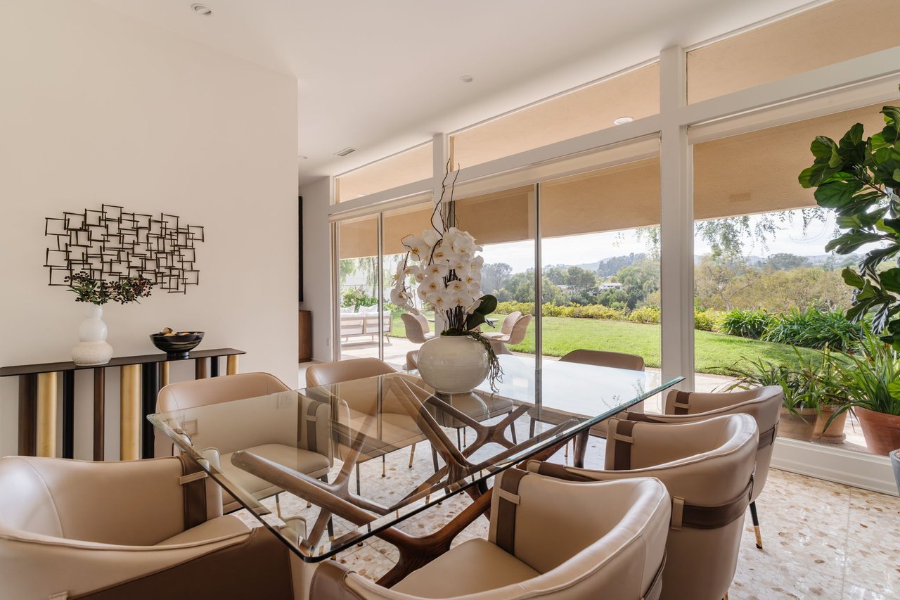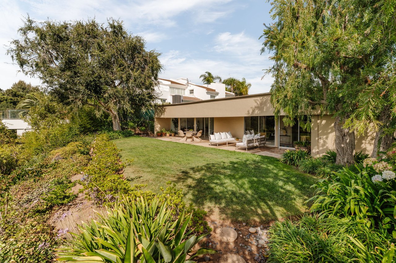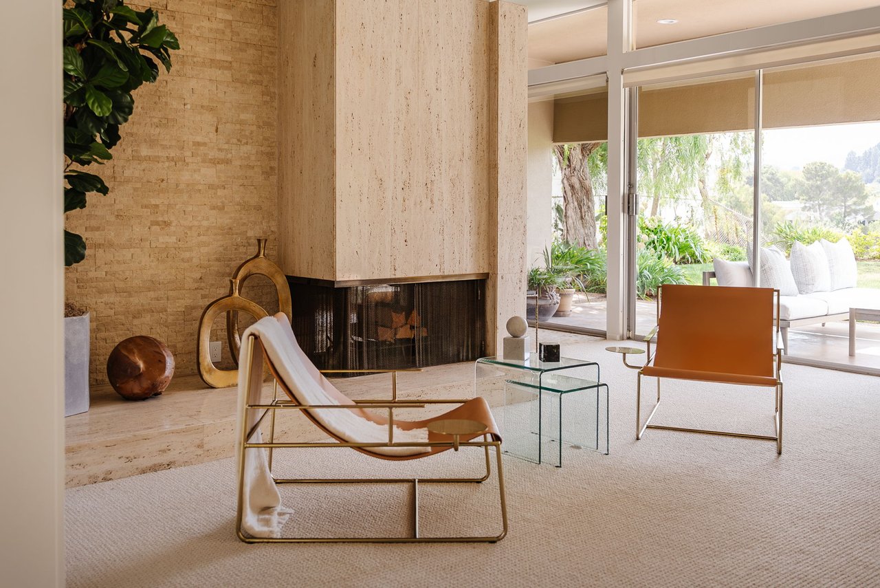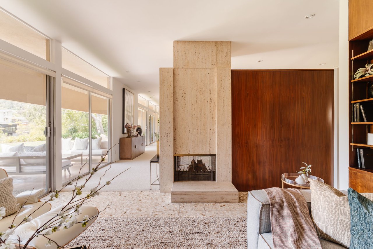 Designed in 1966 by acclaimed architect William Krisel, this Brentwood residence stands as a preserved study in California modernism, where light, landscape, and architecture converge with rare precision. Celebrated for shaping the postwar aesthetic of Southern California, Krisel's vision was defined by clean lines, open living, and a belief that design should elevate everyday life—and this home embodies that philosophy at every turn. Set discreetly above the street, the single-level floorplan reveals its architectural intent upon entering from the original double doors and Italian terrazzo floors to expansive, unobstructed views from the communal living spaces. A two-sided travertine fireplace anchors the interiors, separating the formal entertaining room from a more intimate lounge framed by warm wood built-ins and a chic wet bar. Walls of glass slide open to a covered patio that spans the length of the home, where serene canyon and mountain views unfold across a grassy backyard shaded by mature trees and layered landscaping. The property extends down the hillside, creating both privacy and the opportunity to design a true resort-style retreat. The reimagined kitchen retains its modernist spirit with a sculptural island, skylight, ample pantry storage, and sleek contemporary finishes. A breakfast nook and built-in workstation enhance daily living, while the adjacent formal dining room and entertaining areas flow seamlessly to the outdoors. Four bedrooms include a tranquil primary suite with generous closet space and a luxurious stone-clad bath. Additional amenities include brand new AC/Heater units, laundry room, and a two-car attached garage. Ideally situated in Kenter Canyon, the home feels worlds away yet remains close to Westside favorites like the area's fine dining, boutiques, top rated schools, and is just minutes to the beach. Preserved with integrity, this rare Brentwood offering honors the legacy of one of California's most celebrated architects and presents an opportunity to inhabit an authentic work of modernist design.