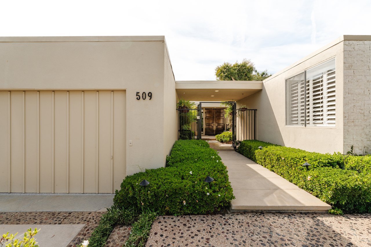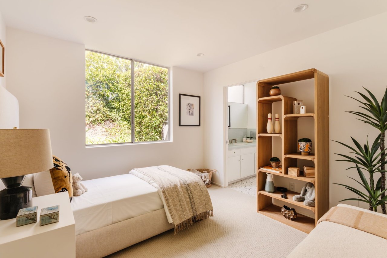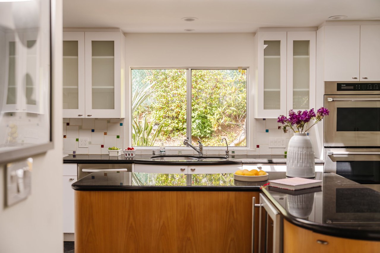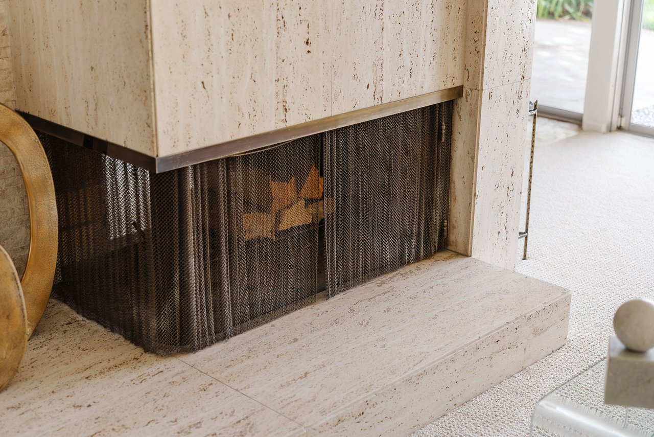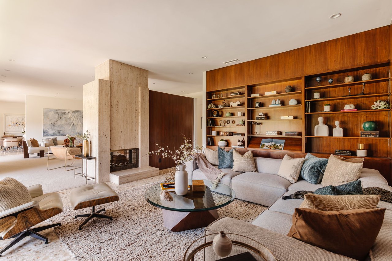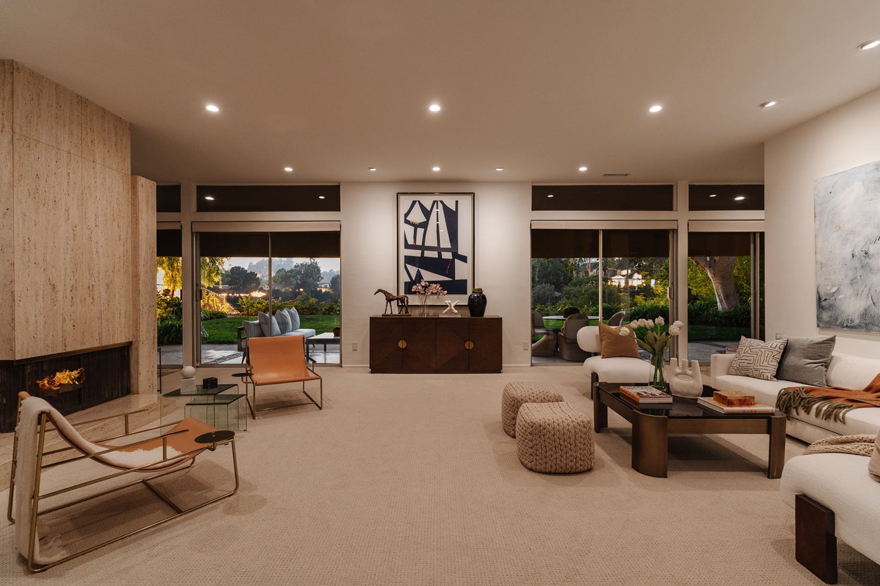 Designed in 1966 by acclaimed architect William Krisel, this Brentwood residence stands as a preserved study in California modernism, where light, landscape, and architecture converge with rare precision. Celebrated for shaping the postwar aesthetic of Southern California, Krisel's vision was defined by clean lines, open living, and a belief that design should elevate everyday life—and this home embodies that philosophy at every turn. Set discreetly above the street, the single-level floorplan reveals its architectural intent upon entering from the original double doors and Italian terrazzo floors to expansive, unobstructed views from the communal living spaces. A two-sided travertine fireplace anchors the interiors, separating the formal entertaining room from a more intimate lounge framed by warm wood built-ins and a chic wet bar. Walls of glass slide open to a covered patio that spans the length of the home, where serene canyon and mountain views unfold across a grassy backyard shaded by mature trees and layered landscaping. The property extends down the hillside, creating both privacy and the opportunity to design a true resort-style retreat. The reimagined kitchen retains its modernist spirit with a sculptural island, skylight, ample pantry storage, and sleek contemporary finishes. A breakfast nook and built-in workstation enhance daily living, while the adjacent formal dining room and entertaining areas flow seamlessly to the outdoors. Four bedrooms include a tranquil primary suite with generous closet space and a luxurious stone-clad bath. Additional amenities include brand new AC/Heater units, laundry room, and a two-car attached garage. Ideally situated in Kenter Canyon, the home feels worlds away yet remains close to Westside favorites like the area's fine dining, boutiques, top rated schools, and is just minutes to the beach. Preserved with integrity, this rare Brentwood offering honors the legacy of one of California's most celebrated architects and presents an opportunity to inhabit an authentic work of modernist design.