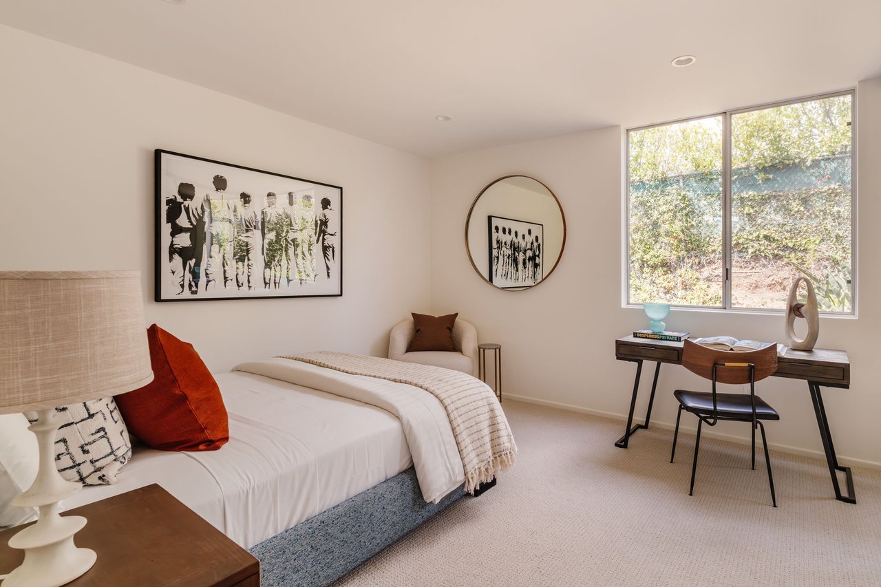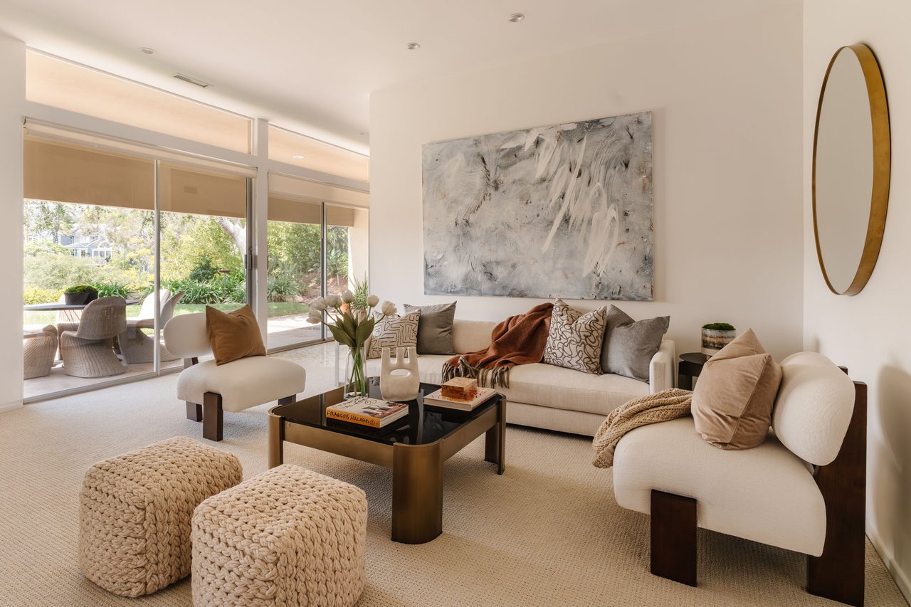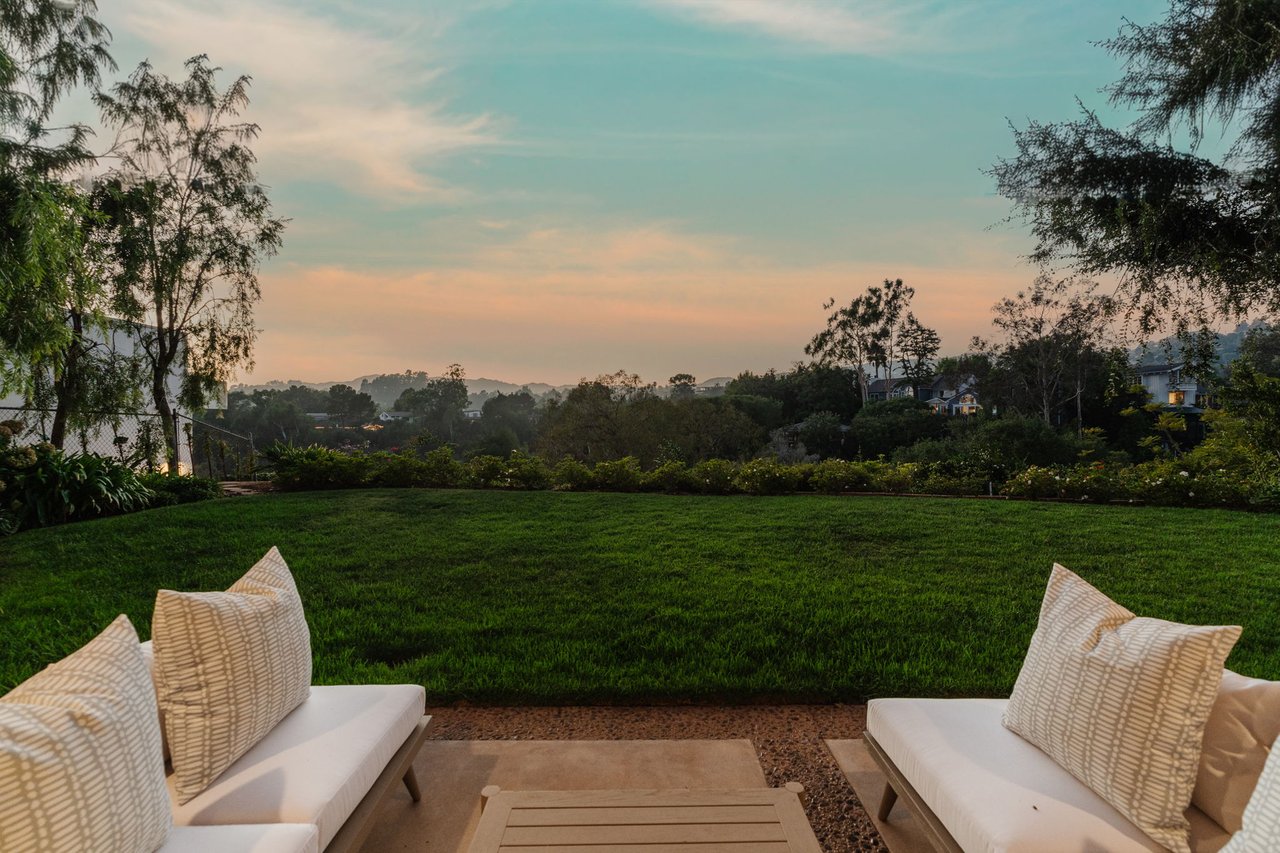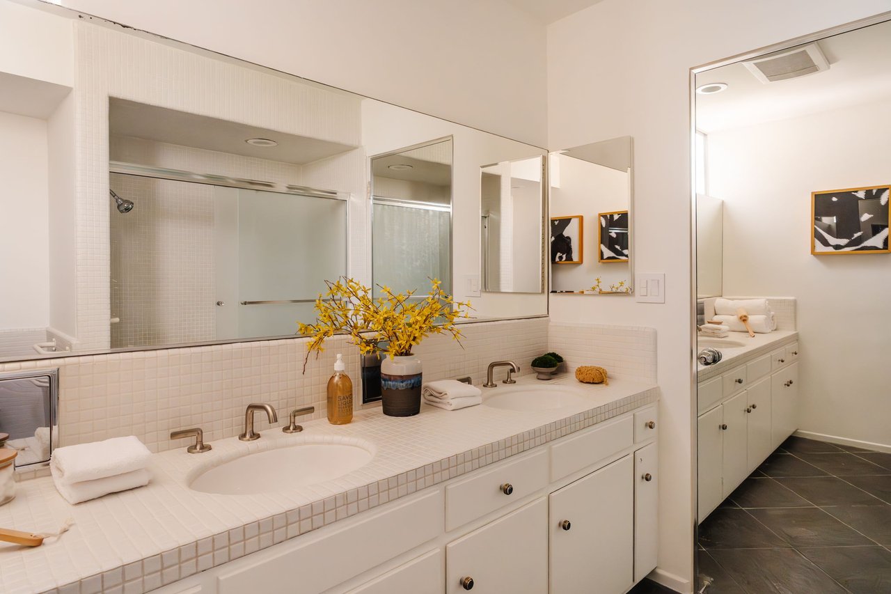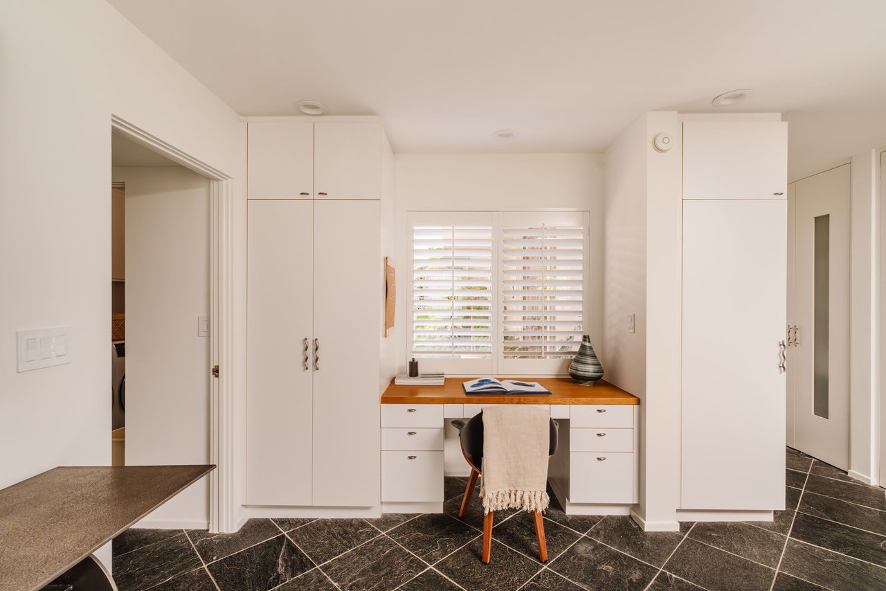 Designed in 1966 by acclaimed architect William Krisel, this Brentwood residence stands as a preserved study in California modernism, where light, landscape, and architecture converge with rare precision. Celebrated for shaping the postwar aesthetic of Southern California, Krisel's vision was defined by clean lines, open living, and a belief that design should elevate everyday life—and this home embodies that philosophy at every turn. Set discreetly above the street, the single-level floorplan reveals its architectural intent upon entering from the original double doors and Italian terrazzo floors to expansive, unobstructed views from the communal living spaces. A two-sided travertine fireplace anchors the interiors, separating the formal entertaining room from a more intimate lounge framed by warm wood built-ins and a chic wet bar. Walls of glass slide open to a covered patio that spans the length of the home, where serene canyon and mountain views unfold across a grassy backyard shaded by mature trees and layered landscaping. The property extends down the hillside, creating both privacy and the opportunity to design a true resort-style retreat. The reimagined kitchen retains its modernist spirit with a sculptural island, skylight, ample pantry storage, and sleek contemporary finishes. A breakfast nook and built-in workstation enhance daily living, while the adjacent formal dining room and entertaining areas flow seamlessly to the outdoors. Four bedrooms include a tranquil primary suite with generous closet space and a luxurious stone-clad bath. Additional amenities include brand new AC/Heater units, laundry room, and a two-car attached garage. Ideally situated in Kenter Canyon, the home feels worlds away yet remains close to Westside favorites like the area's fine dining, boutiques, top rated schools, and is just minutes to the beach. Preserved with integrity, this rare Brentwood offering honors the legacy of one of California's most celebrated architects and presents an opportunity to inhabit an authentic work of modernist design.