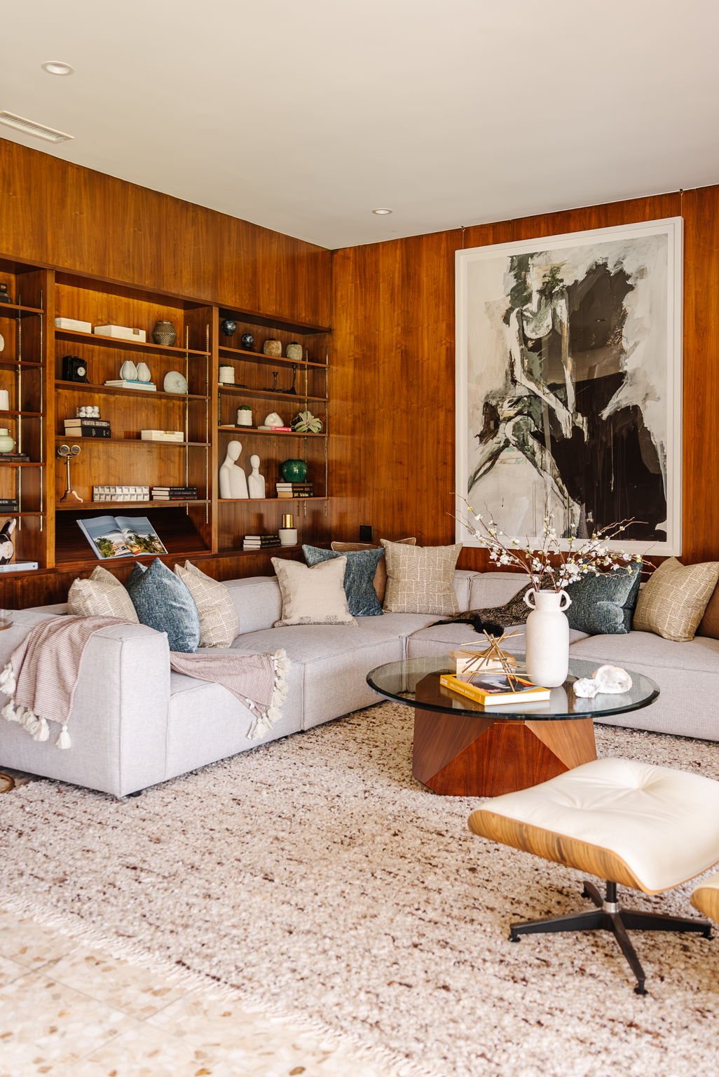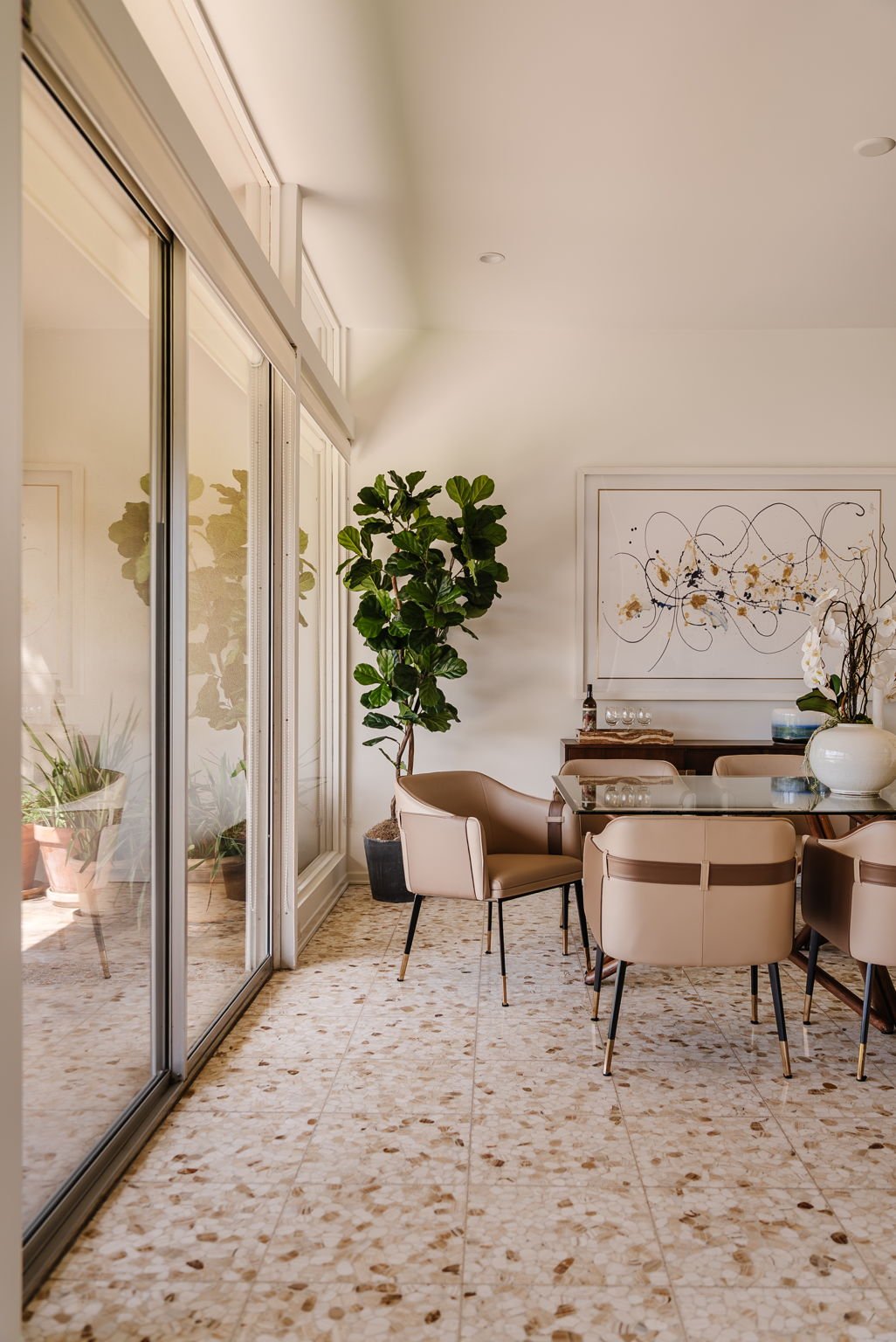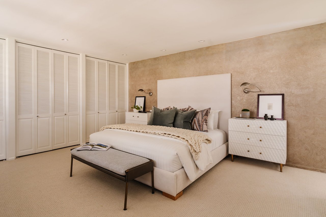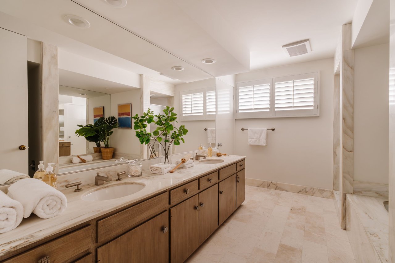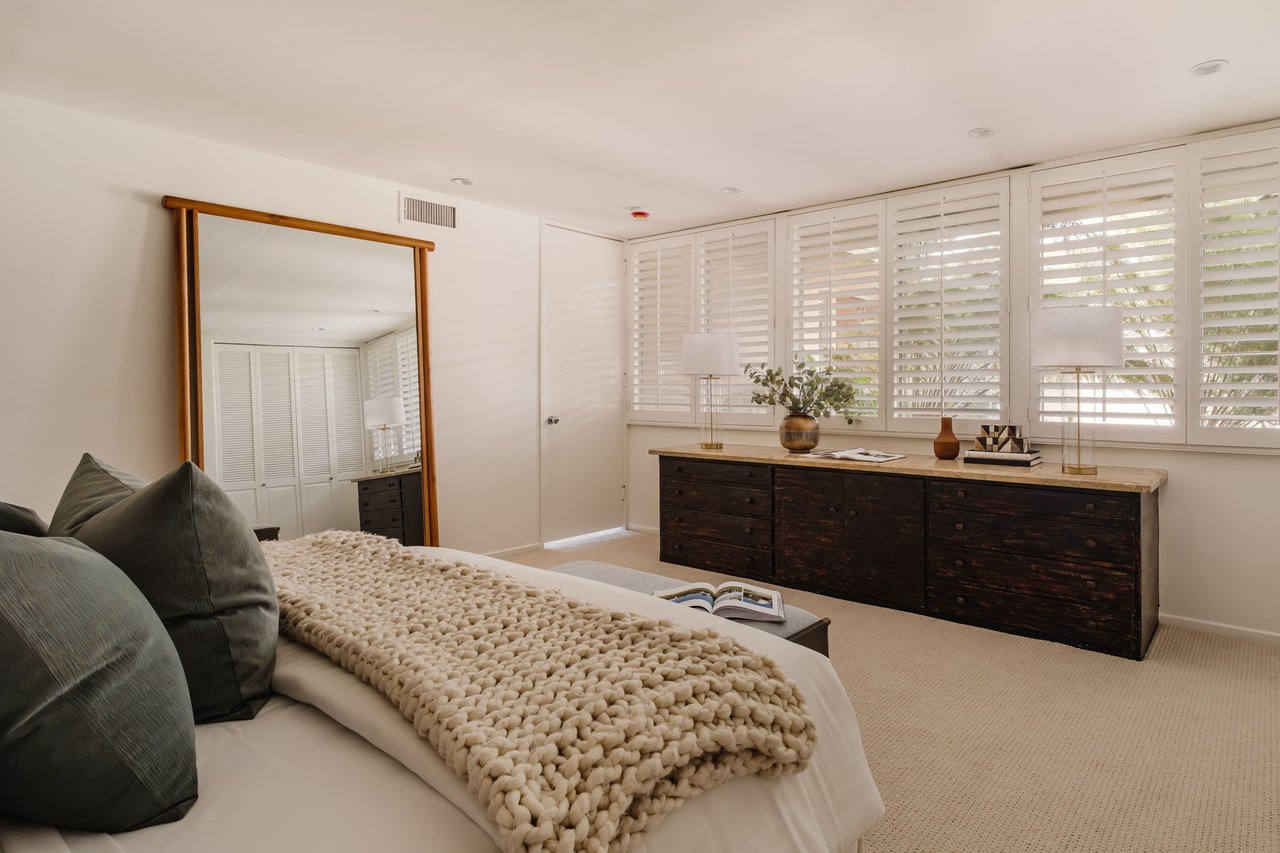 Designed in 1966 by acclaimed architect William Krisel, this Brentwood residence stands as a preserved study in California modernism, where light, landscape, and architecture converge with rare precision. Celebrated for shaping the postwar aesthetic of Southern California, Krisel's vision was defined by clean lines, open living, and a belief that design should elevate everyday life—and this home embodies that philosophy at every turn. Set discreetly above the street, the single-level floorplan reveals its architectural intent upon entering from the original double doors and Italian terrazzo floors to expansive, unobstructed views from the communal living spaces. A two-sided travertine fireplace anchors the interiors, separating the formal entertaining room from a more intimate lounge framed by warm wood built-ins and a chic wet bar. Walls of glass slide open to a covered patio that spans the length of the home, where serene canyon and mountain views unfold across a grassy backyard shaded by mature trees and layered landscaping. The property extends down the hillside, creating both privacy and the opportunity to design a true resort-style retreat. The reimagined kitchen retains its modernist spirit with a sculptural island, skylight, ample pantry storage, and sleek contemporary finishes. A breakfast nook and built-in workstation enhance daily living, while the adjacent formal dining room and entertaining areas flow seamlessly to the outdoors. Four bedrooms include a tranquil primary suite with generous closet space and a luxurious stone-clad bath. Additional amenities include brand new AC/Heater units, laundry room, and a two-car attached garage. Ideally situated in Kenter Canyon, the home feels worlds away yet remains close to Westside favorites like the area's fine dining, boutiques, top rated schools, and is just minutes to the beach. Preserved with integrity, this rare Brentwood offering honors the legacy of one of California's most celebrated architects and presents an opportunity to inhabit an authentic work of modernist design.