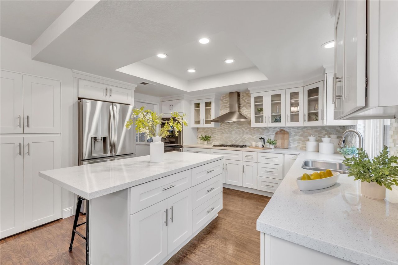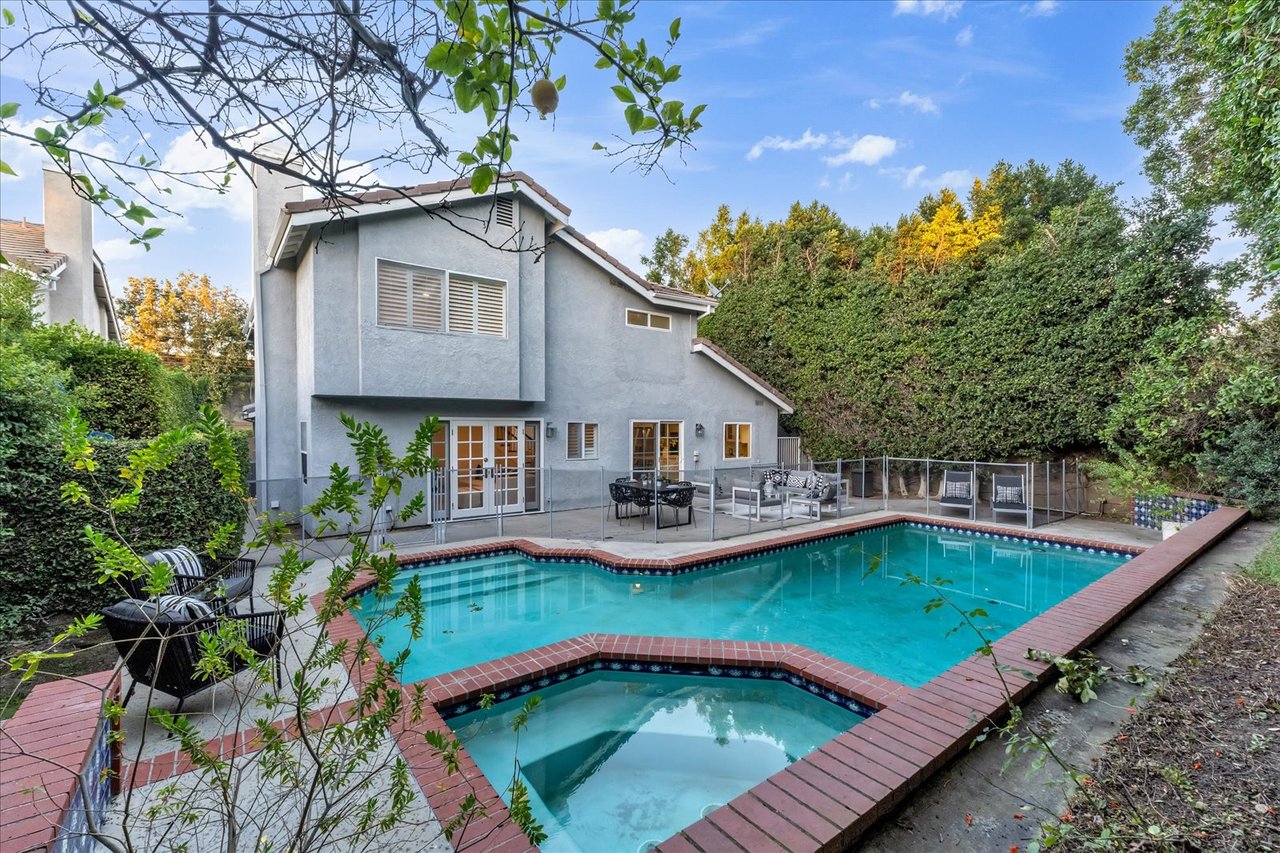 Charming home located at the end of a cul-de-sac in the coveted fifteen-home gated community of Encino Country Oaks. This 4-bedroom approx 2700 sq ft home was custom built by Brian Weinstock and is located in the Hesby Oaks Charter School district. One of the only K-8 options available in Los Angeles. The contemporary exterior introduces a freshly painted interior with high volume ceilings, custom lighting and walnut wood toned floors. The grand scale great room encompasses a living and dining room with walls of glass and sunlight treetop vistas. An updated center island kitchen with quartz countertops and stainless frig/freezer overlooks a private yard with a full sized sparkling pool/spa, & outdoor living/dining areas. The kitchen is adjacent to a family room with french sliding door access to the yard. This ideal floor-plan offers an attached oversized 2-car finished garage with access to a laundry room as well as a downstairs suite perfect for guests or a home office. The en-suite bath has exterior access for a separate entrance and pool bath. Upstairs are three bedrooms with vaulted ceilings. The two secondary bedrooms offer designer wallpaper accent walls by Kate Spade & Spoon Flower and a hall bath with chevron pattern white tile floors, dual sinks and a subway tiled shower over tub. The primary suite has a sitting area, treetop views, dual walk-in closets and a luxurious bath with double sinks, marble bath and spa-like shower. This is the one you have been waiting for. Minutes for shopping, commuter routes and the local's favorite Libbit Dog Park. Come start your next chapter at 5196 Brian Lane.