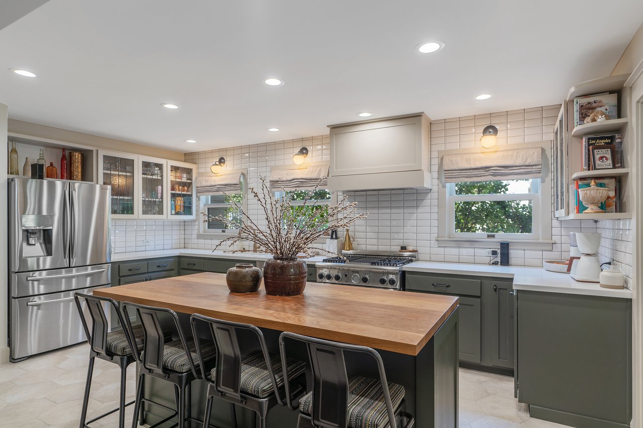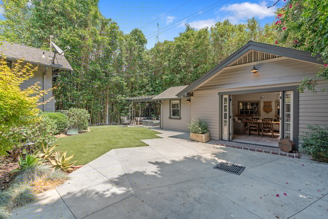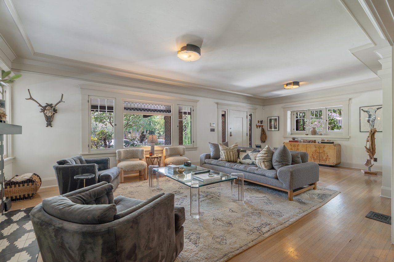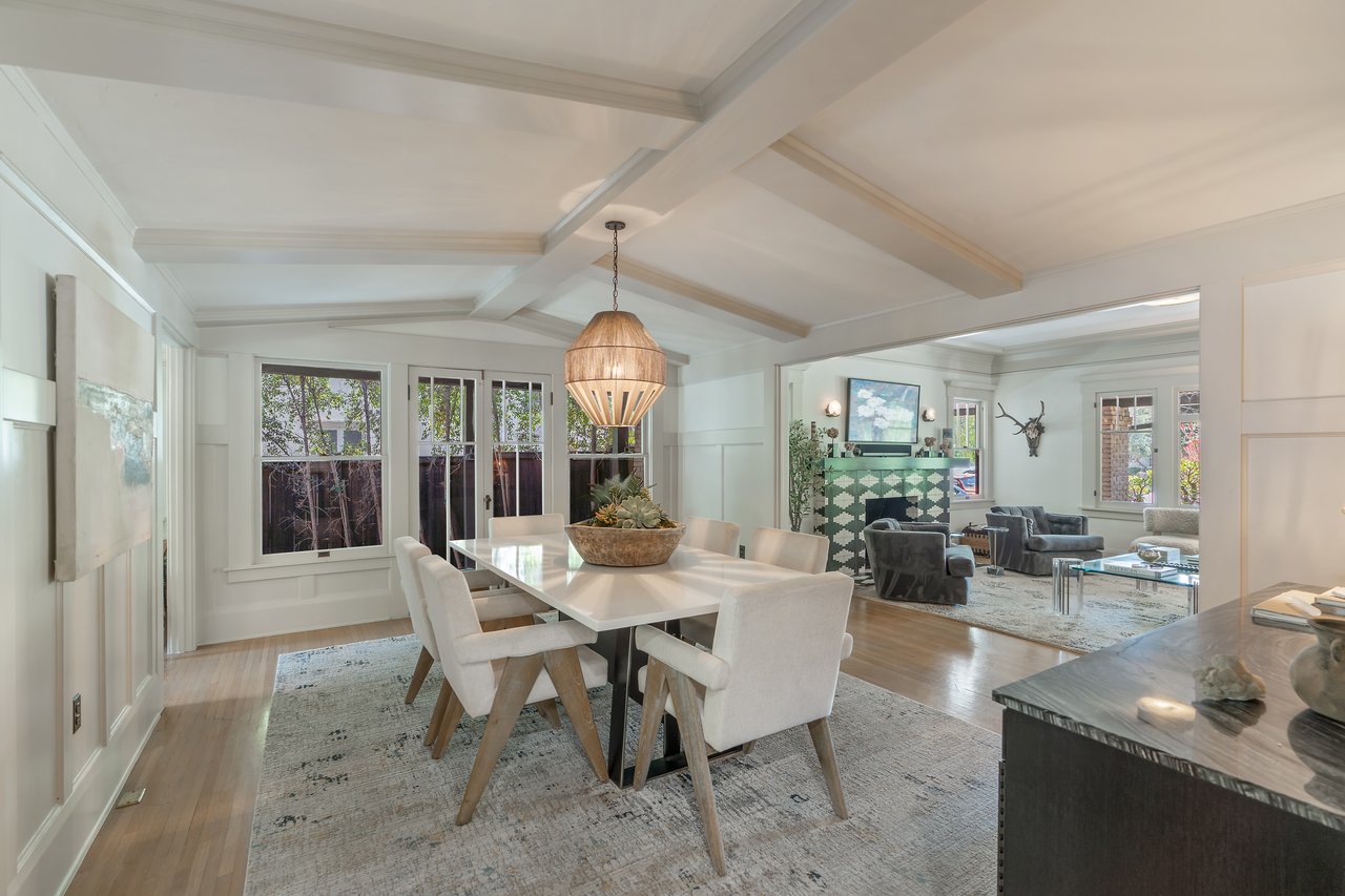 This stunning Craftsman blends original character with thoughtful modern updates. Enter the spacious living room, filled with rich wood trim and timeless charm. The formal dining room features wood-beamed ceilings and classic wainscoting, opening seamlessly to a cozy den, a breakfast room, and a beautifully updated kitchen with an island and modern appliances. A walk-in pantry, laundry/storage room, and a convenient half bath complete the main floor. Upstairs, a charming staircase leads to the large primary suite with a gorgeous new bathroom featuring double sinks and access to a private rooftop deck. Two additional guest bedrooms share a character-filled hall bath, and there's a versatile playroom, office, or optional fourth bedroom. The backyard is an entertainer's dream with a covered dining patio overlooking the private garden. The detached garage (an additional 500 sq.ft.) has been converted into a flexible office, playroom, or hobby space, with an attached gym. Property has been updated with newer central air and heat, copper plumbing, and electrical. Nestled on a picturesque tree-lined street surrounded by beautifully restored homes, this is a rare opportunity to own a true piece of architectural history (HPOZ).