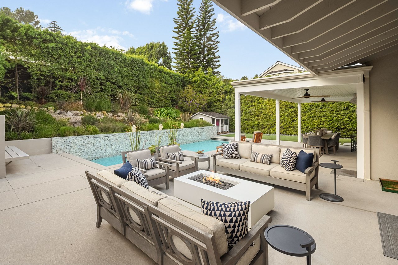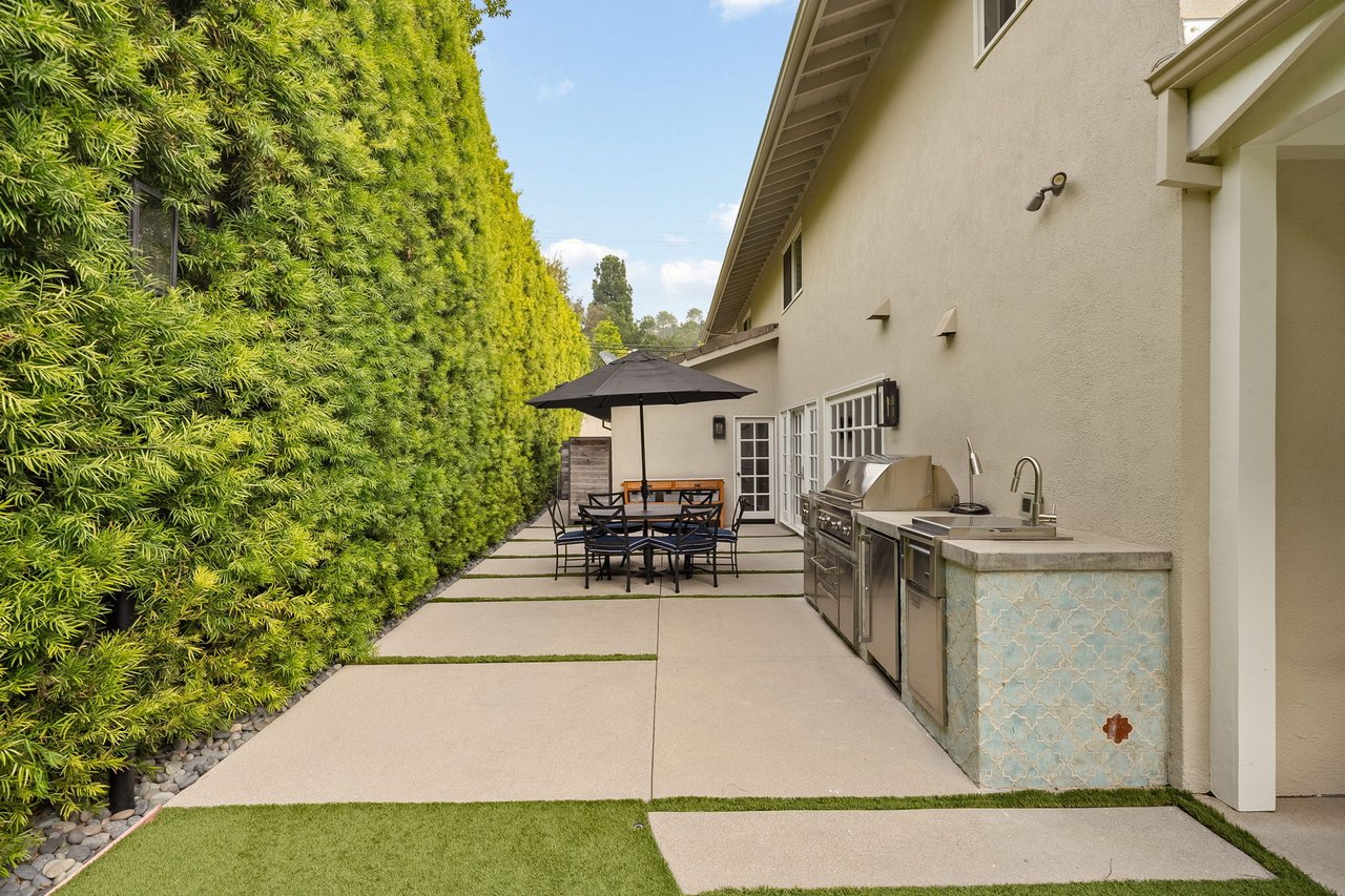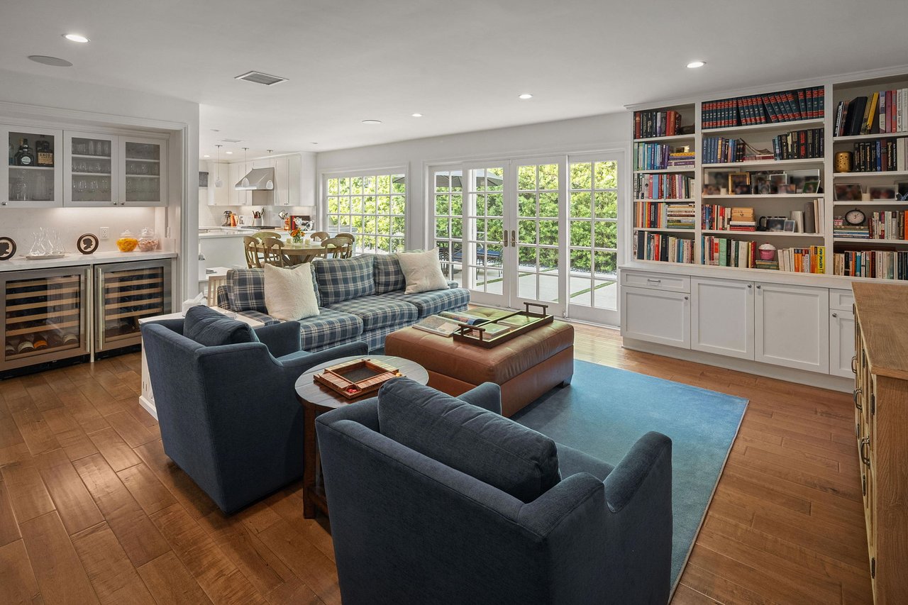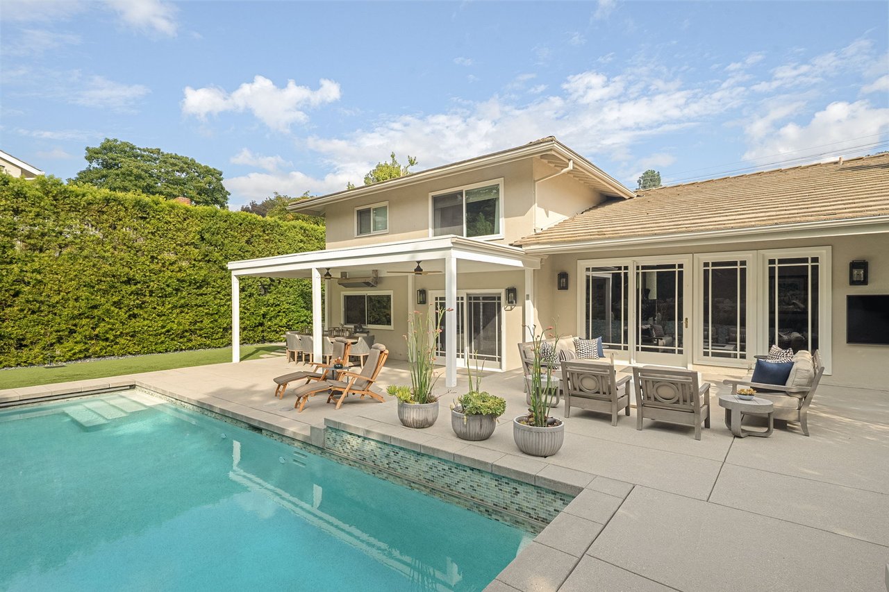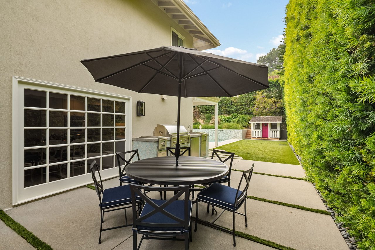 Set in an idyllic Brentwood neighborhood, this pristine traditional-style residence blends classic refinement with modern comfort. Awash with natural light, the home welcomes with soaring vaulted and beamed ceilings, warm wood floors, and an inviting sense of space and serenity. Enter through the foyer and enjoy an open sightline through the home to the beautifully landscaped backyard. The formal living room, anchored by a stone fireplace and custom built-ins, opens through sliding glass doors to the firepit patio for effortless indoor-outdoor living. The remodeled chef's kitchen features premium Thermador appliances, ample pantry storage, and a convenient passthrough window to the backyard entertaining area. A formal dining room sits adjacent to the kitchen, ideal for hosting intimate dinners or larger gatherings. Designed for relaxation and connection, the expansive family room boasts a built-in wet bar with temperature-controlled wine storage. The thoughtful floor plan offers one bedroom on the main level—ideal for a home office or guest suite—and four additional bedrooms upstairs. Retreat to the primary suite, a private sanctuary with a spacious walk-in closet and a luxurious en suite bath with dual vanities, a glass-enclosed shower with bench seating, and a sunlit soaking tub. Additional amenities include Control4 home automation, surround sound, a gym, a powder room, and a two-car garage with direct home access. Outdoors, enjoy manicured landscaping and tall privacy hedging framing an entertainer's paradise—complete with a sparkling pool with an automatic cover, built-in outdoor kitchen, cozy firepit, children's playhouse, and both covered and uncovered patio spaces for year-round enjoyment. Located just moments from Brentwood Village's charming boutiques, restaurants, and amenities, this home offers the best of Westside living in a premier Brentwood enclave.