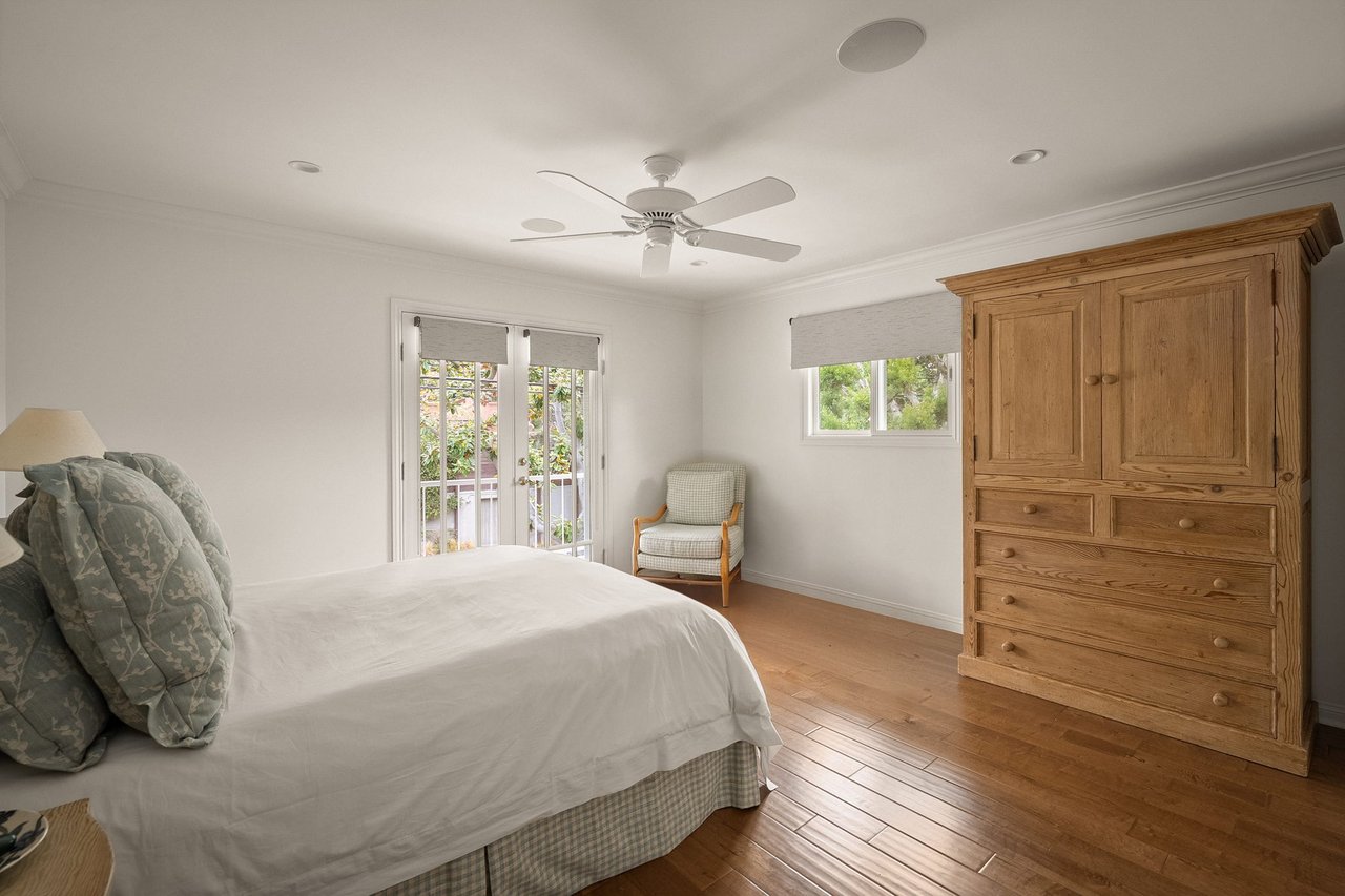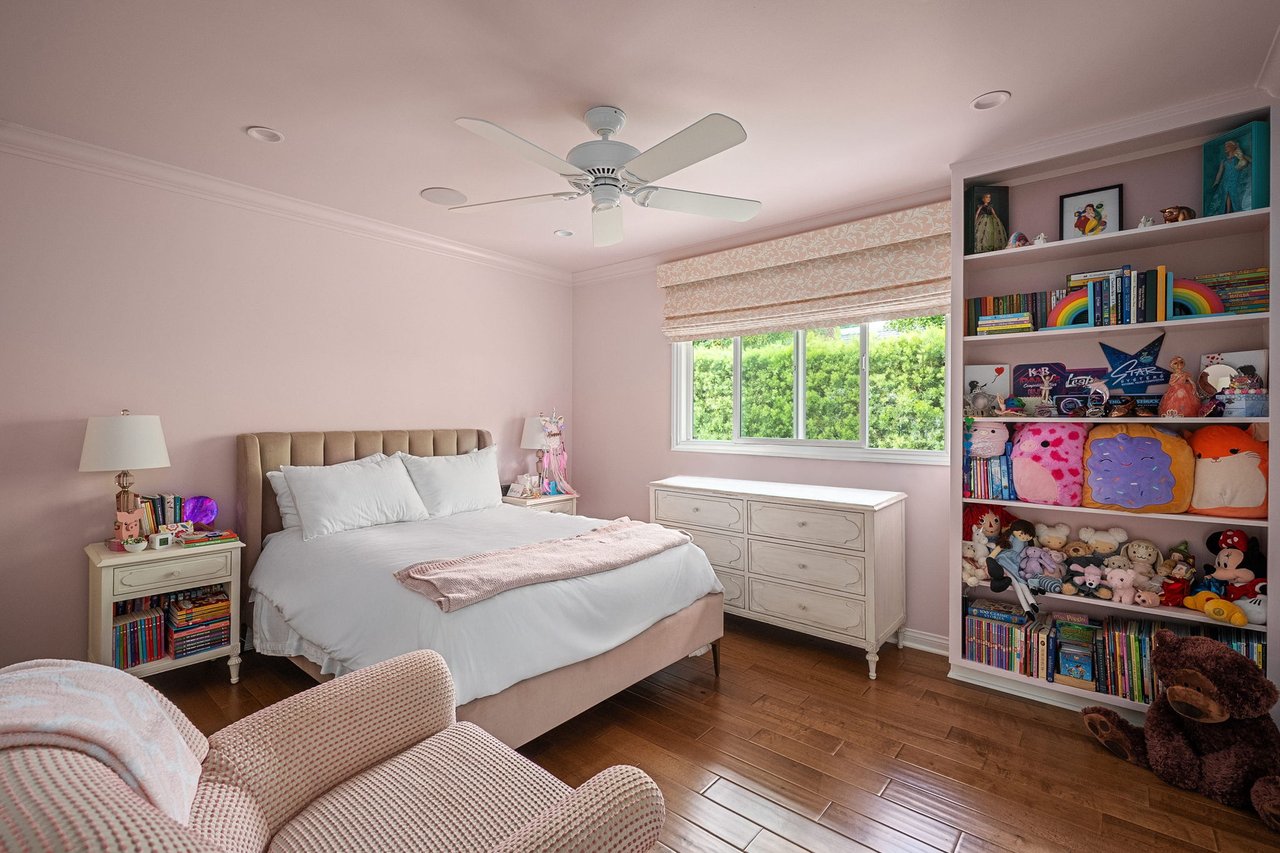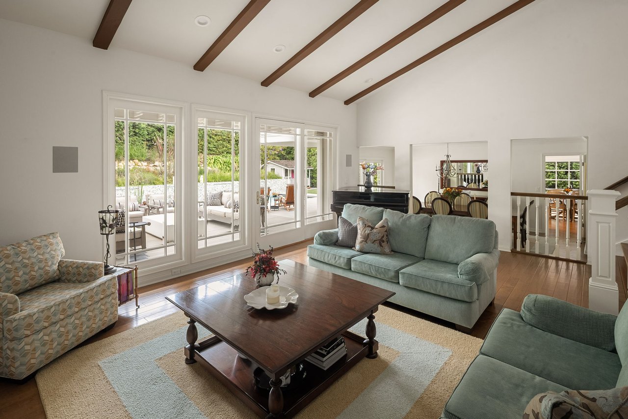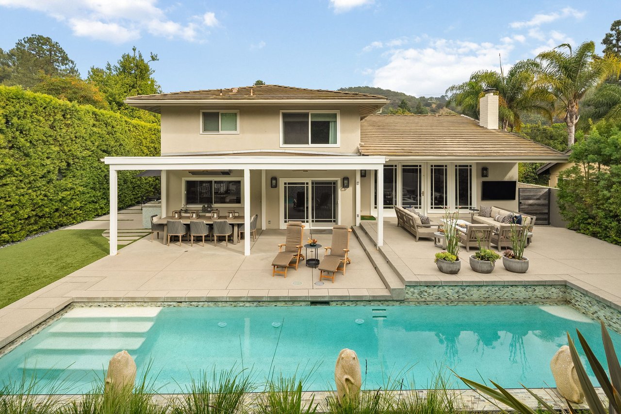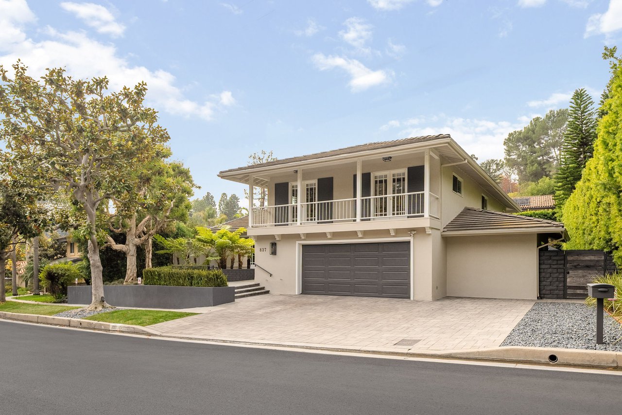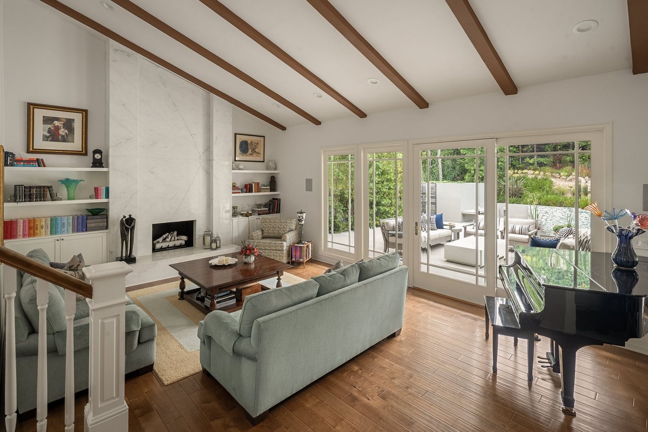 Set in an idyllic Brentwood neighborhood, this pristine traditional-style residence blends classic refinement with modern comfort. Awash with natural light, the home welcomes with soaring vaulted and beamed ceilings, warm wood floors, and an inviting sense of space and serenity. Enter through the foyer and enjoy an open sightline through the home to the beautifully landscaped backyard. The formal living room, anchored by a stone fireplace and custom built-ins, opens through sliding glass doors to the firepit patio for effortless indoor-outdoor living. The remodeled chef's kitchen features premium Thermador appliances, ample pantry storage, and a convenient passthrough window to the backyard entertaining area. A formal dining room sits adjacent to the kitchen, ideal for hosting intimate dinners or larger gatherings. Designed for relaxation and connection, the expansive family room boasts a built-in wet bar with temperature-controlled wine storage. The thoughtful floor plan offers one bedroom on the main level—ideal for a home office or guest suite—and four additional bedrooms upstairs. Retreat to the primary suite, a private sanctuary with a spacious walk-in closet and a luxurious en suite bath with dual vanities, a glass-enclosed shower with bench seating, and a sunlit soaking tub. Additional amenities include Control4 home automation, surround sound, a gym, a powder room, and a two-car garage with direct home access. Outdoors, enjoy manicured landscaping and tall privacy hedging framing an entertainer's paradise—complete with a sparkling pool with an automatic cover, built-in outdoor kitchen, cozy firepit, children's playhouse, and both covered and uncovered patio spaces for year-round enjoyment. Located just moments from Brentwood Village's charming boutiques, restaurants, and amenities, this home offers the best of Westside living in a premier Brentwood enclave.