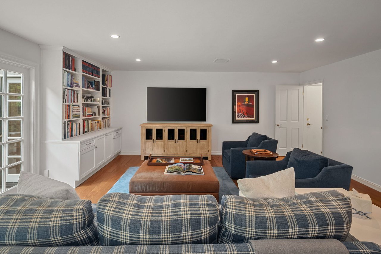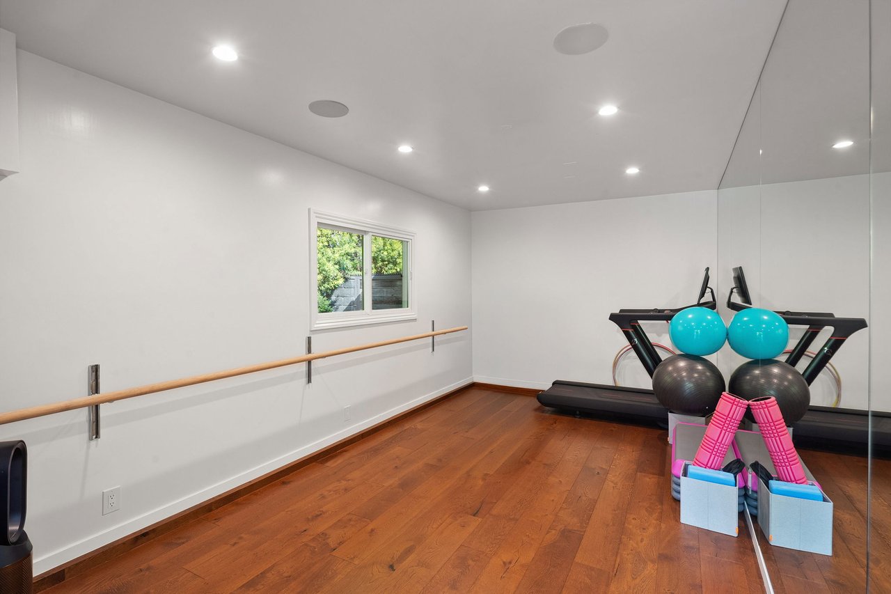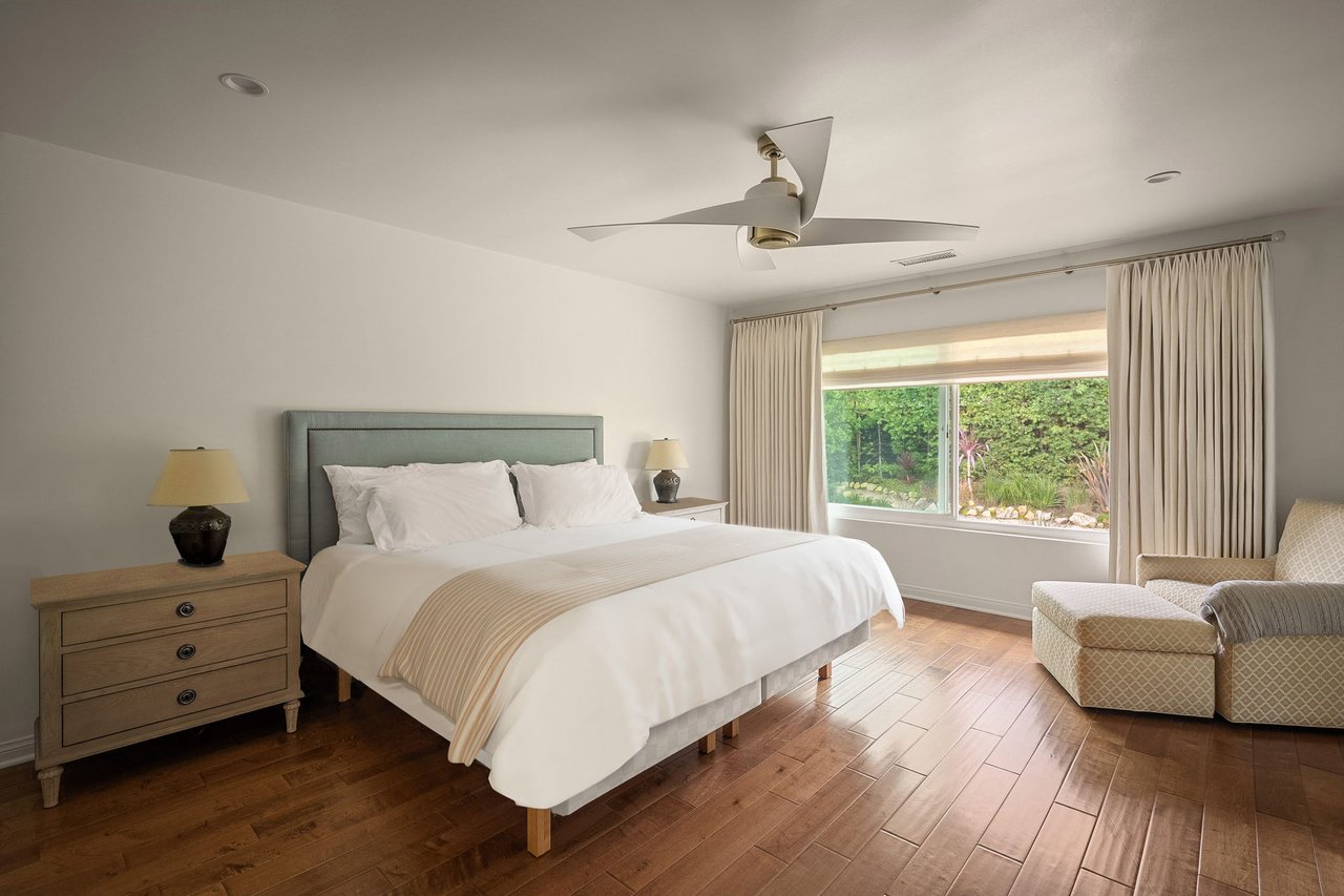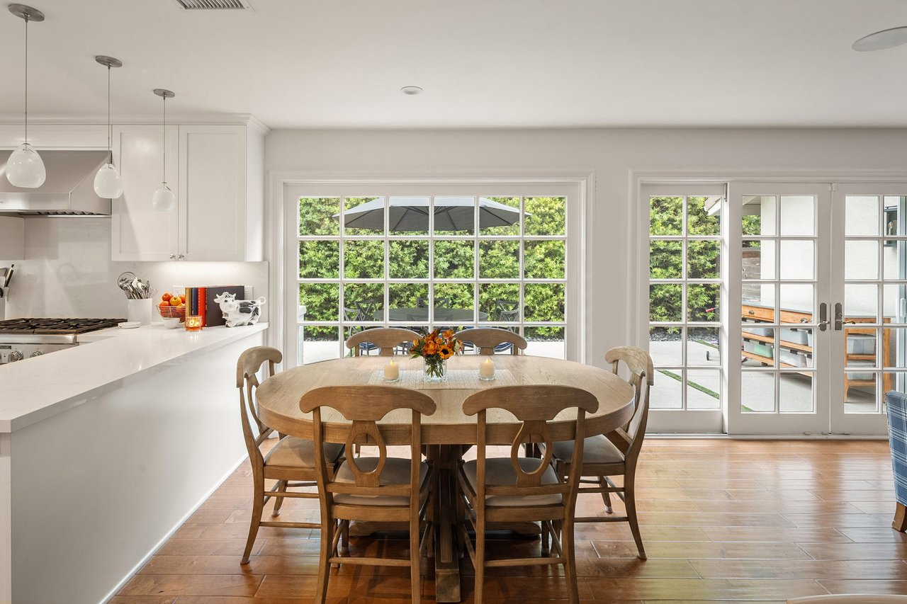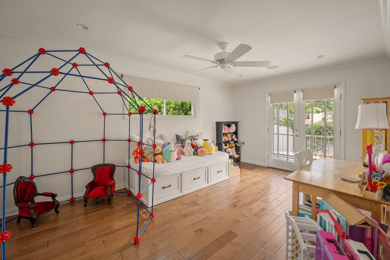 Set in an idyllic Brentwood neighborhood, this pristine traditional-style residence blends classic refinement with modern comfort. Awash with natural light, the home welcomes with soaring vaulted and beamed ceilings, warm wood floors, and an inviting sense of space and serenity. Enter through the foyer and enjoy an open sightline through the home to the beautifully landscaped backyard. The formal living room, anchored by a stone fireplace and custom built-ins, opens through sliding glass doors to the firepit patio for effortless indoor-outdoor living. The remodeled chef's kitchen features premium Thermador appliances, ample pantry storage, and a convenient passthrough window to the backyard entertaining area. A formal dining room sits adjacent to the kitchen, ideal for hosting intimate dinners or larger gatherings. Designed for relaxation and connection, the expansive family room boasts a built-in wet bar with temperature-controlled wine storage. The thoughtful floor plan offers one bedroom on the main level—ideal for a home office or guest suite—and four additional bedrooms upstairs. Retreat to the primary suite, a private sanctuary with a spacious walk-in closet and a luxurious en suite bath with dual vanities, a glass-enclosed shower with bench seating, and a sunlit soaking tub. Additional amenities include Control4 home automation, surround sound, a gym, a powder room, and a two-car garage with direct home access. Outdoors, enjoy manicured landscaping and tall privacy hedging framing an entertainer's paradise—complete with a sparkling pool with an automatic cover, built-in outdoor kitchen, cozy firepit, children's playhouse, and both covered and uncovered patio spaces for year-round enjoyment. Located just moments from Brentwood Village's charming boutiques, restaurants, and amenities, this home offers the best of Westside living in a premier Brentwood enclave.