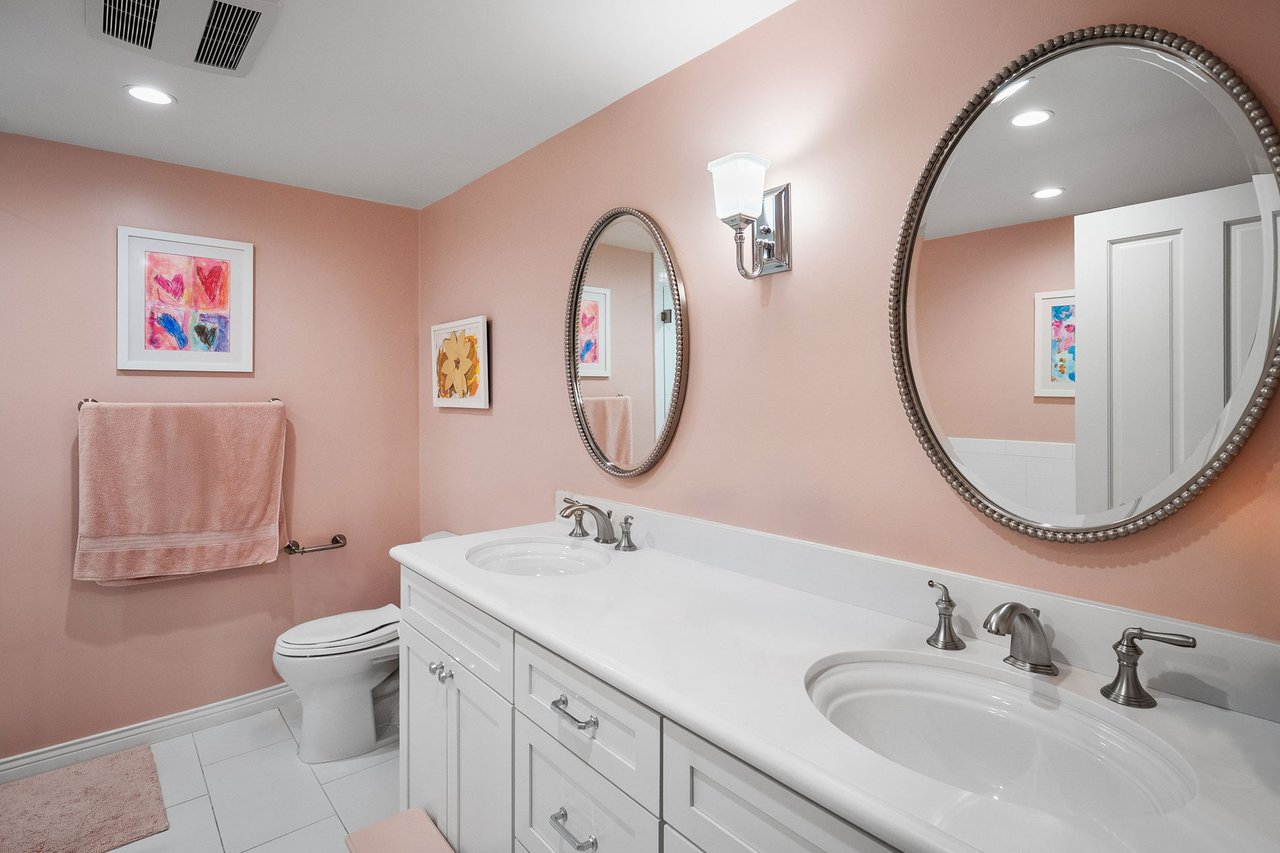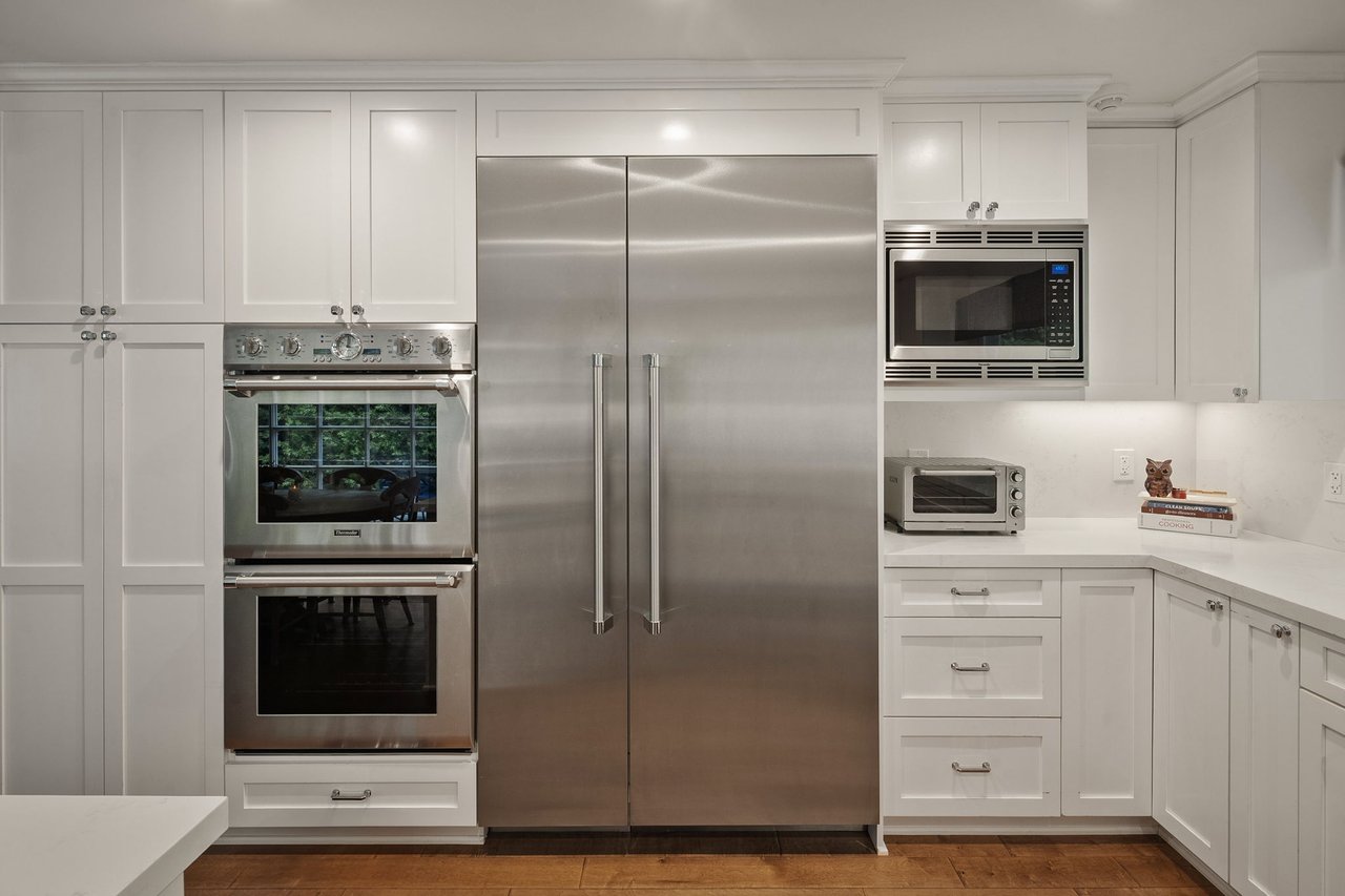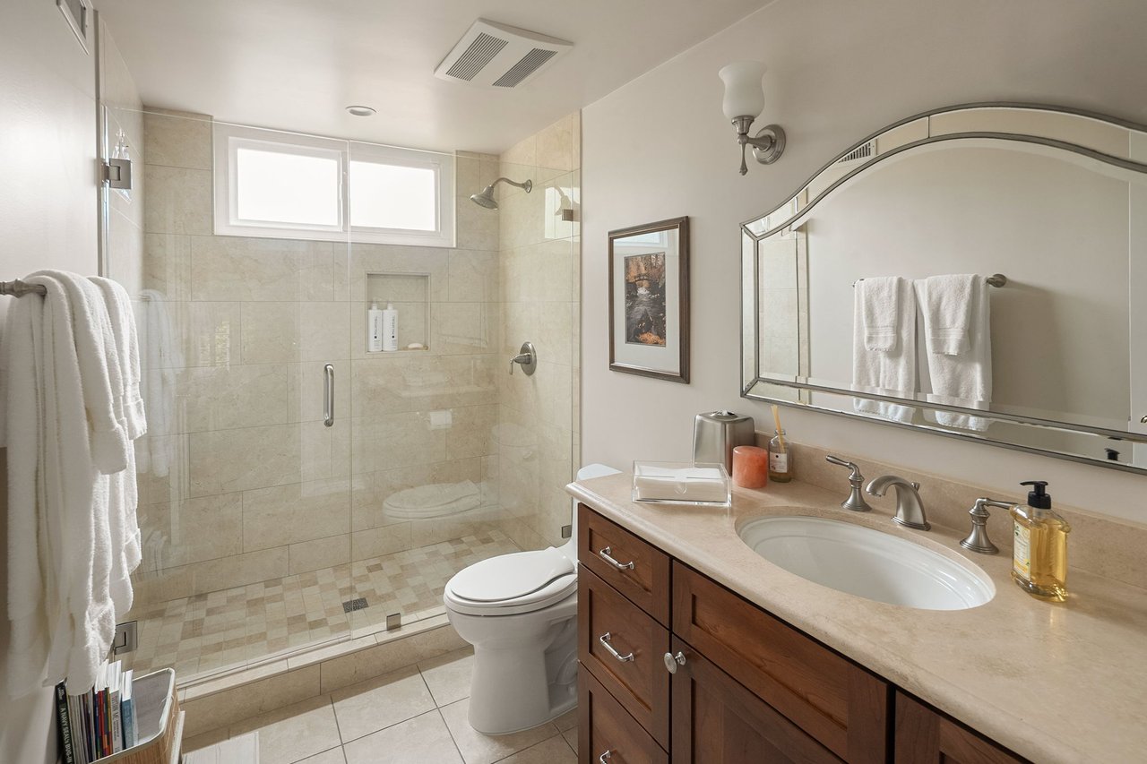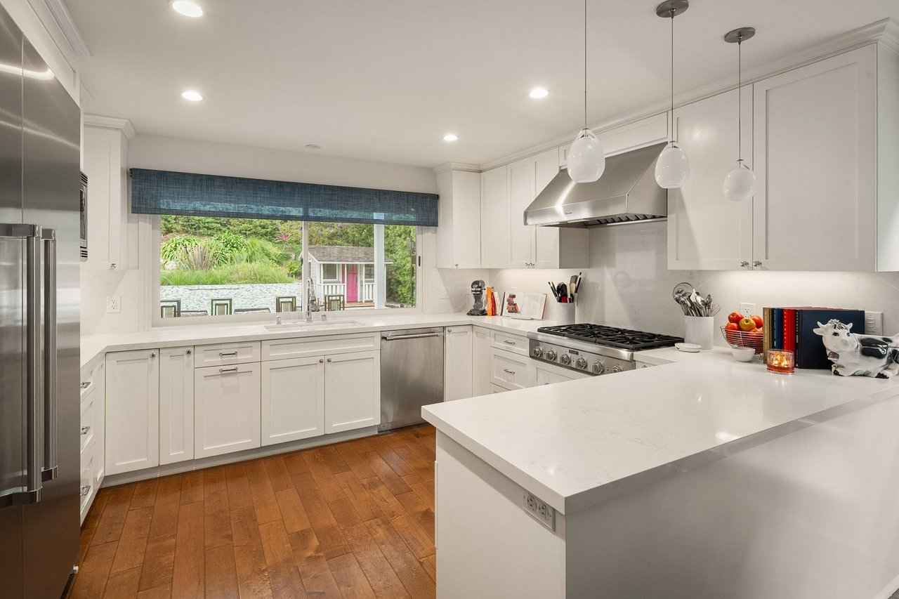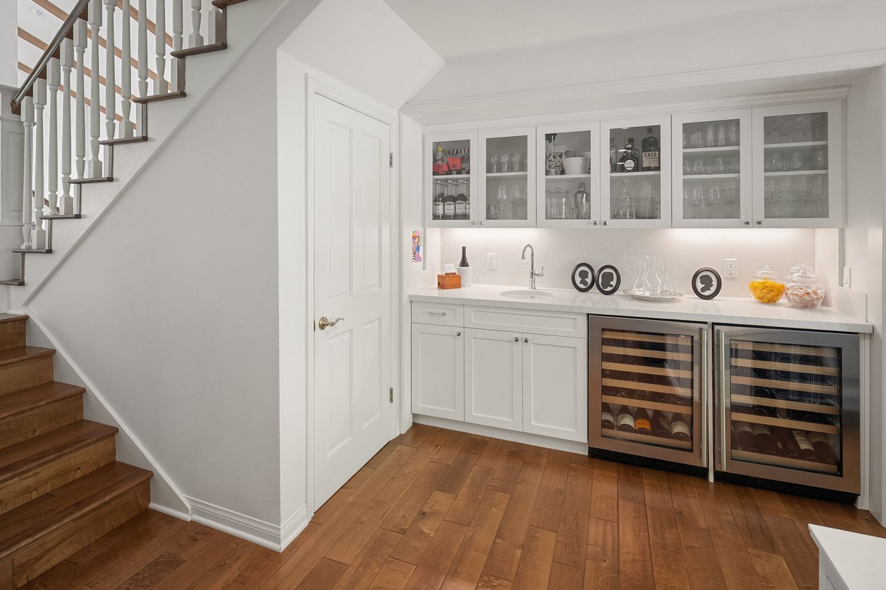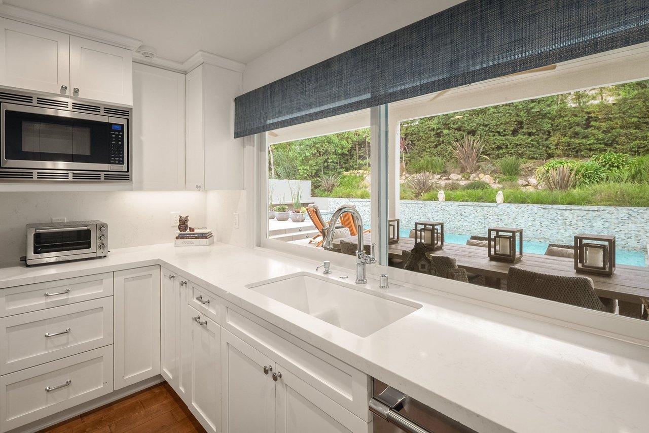 Set in an idyllic Brentwood neighborhood, this pristine traditional-style residence blends classic refinement with modern comfort. Awash with natural light, the home welcomes with soaring vaulted and beamed ceilings, warm wood floors, and an inviting sense of space and serenity. Enter through the foyer and enjoy an open sightline through the home to the beautifully landscaped backyard. The formal living room, anchored by a stone fireplace and custom built-ins, opens through sliding glass doors to the firepit patio for effortless indoor-outdoor living. The remodeled chef's kitchen features premium Thermador appliances, ample pantry storage, and a convenient passthrough window to the backyard entertaining area. A formal dining room sits adjacent to the kitchen, ideal for hosting intimate dinners or larger gatherings. Designed for relaxation and connection, the expansive family room boasts a built-in wet bar with temperature-controlled wine storage. The thoughtful floor plan offers one bedroom on the main level—ideal for a home office or guest suite—and four additional bedrooms upstairs. Retreat to the primary suite, a private sanctuary with a spacious walk-in closet and a luxurious en suite bath with dual vanities, a glass-enclosed shower with bench seating, and a sunlit soaking tub. Additional amenities include Control4 home automation, surround sound, a gym, a powder room, and a two-car garage with direct home access. Outdoors, enjoy manicured landscaping and tall privacy hedging framing an entertainer's paradise—complete with a sparkling pool with an automatic cover, built-in outdoor kitchen, cozy firepit, children's playhouse, and both covered and uncovered patio spaces for year-round enjoyment. Located just moments from Brentwood Village's charming boutiques, restaurants, and amenities, this home offers the best of Westside living in a premier Brentwood enclave.