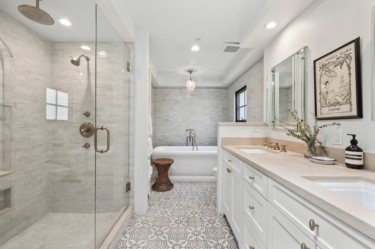 Discover this charming townhouse nestled in the heart of Santa Monica's coveted Bella Casa, an intimate community of just eight townhomes a stone's throw from Montana Avenue. This corner unit features a comfortable living and dining area that flows seamlessly through the entryway with stone imported from the South of France into a recently upgraded chef's kitchen, showcasing luxurious Calacatta gold marble slab countertops, breakfast bar, and top-of-the-line Viking appliances. The main level powder room delights with sophisticated Koi wallpaper by Osborne & Little and Walker Zanger tile. The home includes three bedrooms each with their own Juliet balconies, a spacious full bathroom with honed limestone, and a primary suite boasting a cozy fireplace with imported Moroccan tile, soaring ceilings, and a luxuriously updated bathroom retreat featuring more exquisite Moroccan tile. A versatile office/den space opens to a south-facing roof deck beneath a pergola, offering panoramic views across Santa Monica and peekaboo glimpses of the Pacific Ocean, while the standout massive oversized direct entry 4-car garage provides extraordinary potential for customization into a home gym, recording studio, creative workspace, or other personalized uses. This centrally located sanctuary offers effortless proximity to the vibrant boutiques and restaurants along Montana Avenue, quick access to Pacific Coast Highway, Brentwood, and all the premier amenities of LA's coveted Westside.