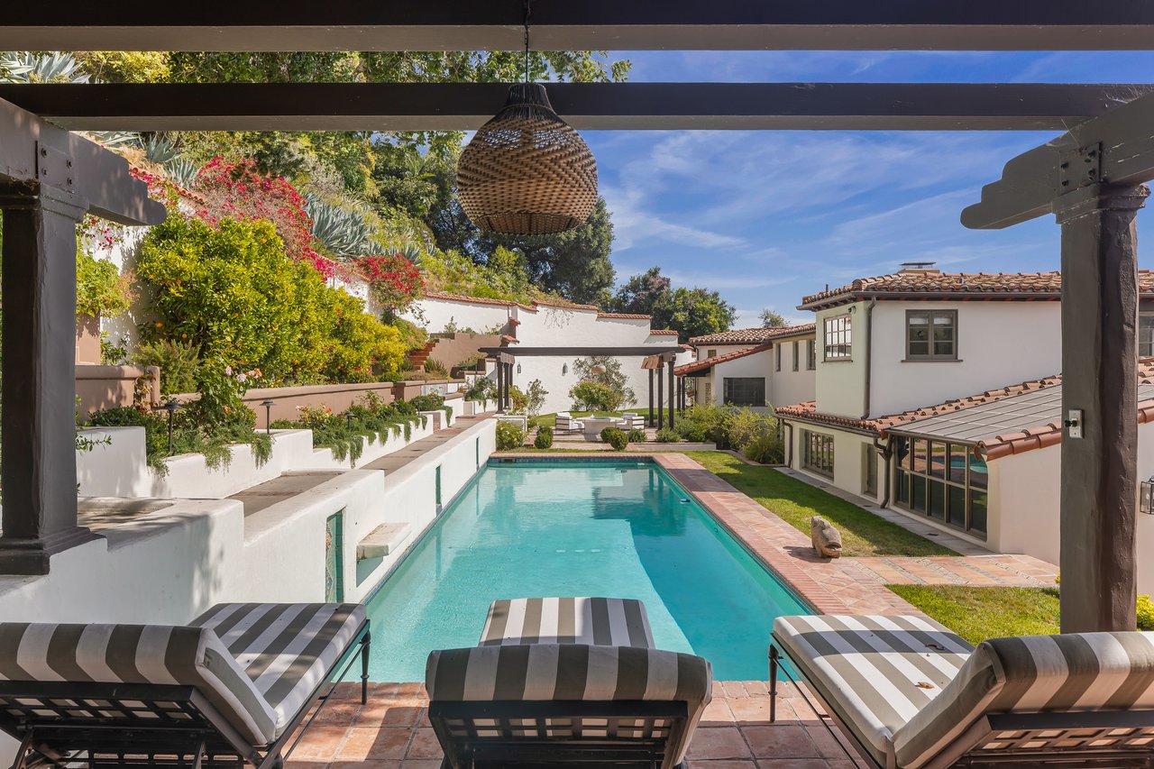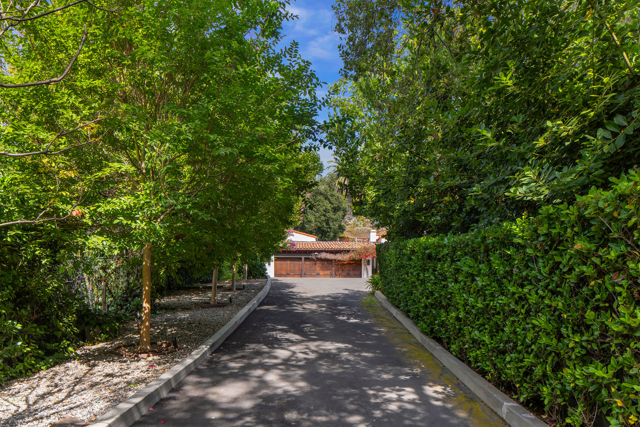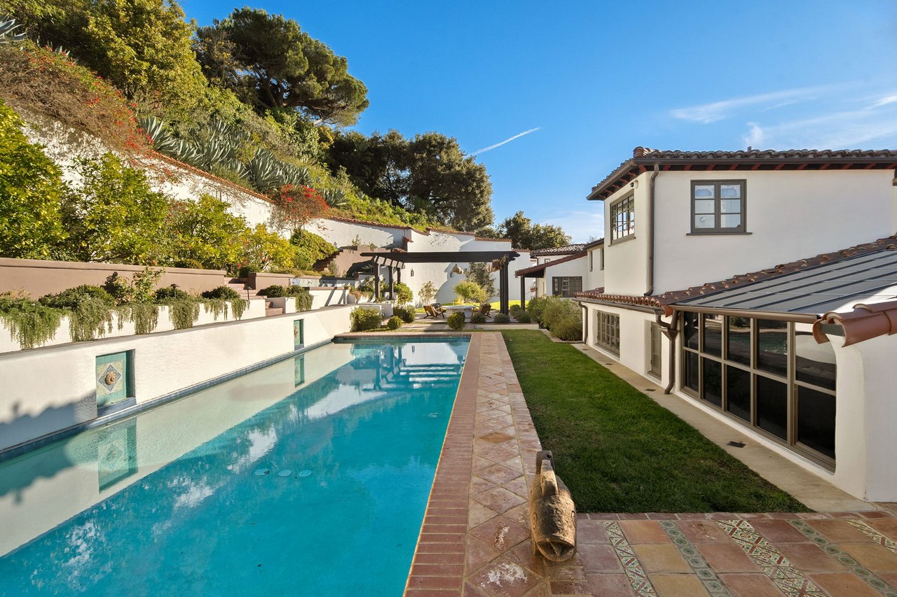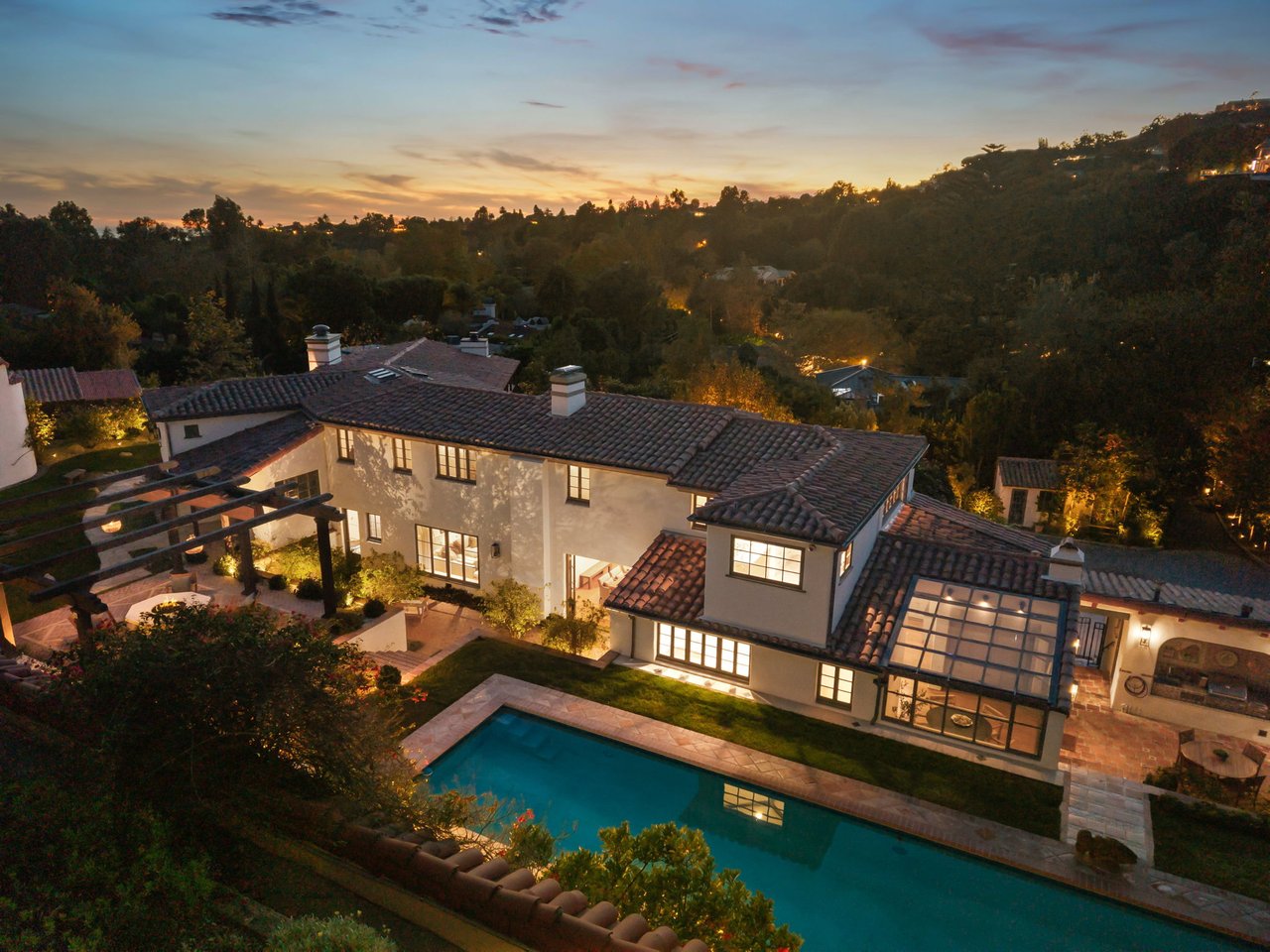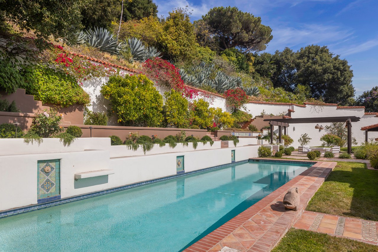 Nestled at the end of a long gated drive in Lower Mandeville Canyon, La Casa De Flores is a Spanish Revival estate of rare provenance and timeless beauty. Designed in 1929 by acclaimed architect John Byers and thoughtfully reimagined for modern living, the home sits on nearly an acre of lush, secluded grounds, offering an atmosphere that feels both grand and deeply inviting. Inside, the craftsmanship of the original era remains intact—with wood-beamed and coffered ceilings, rich hardwood floors, graceful French doors, and hand-crafted casement windows. Sculptural designer lighting fixtures punctuate the interiors, enhancing the interplay of light and texture throughout. The formal living room, framed by garden views, is anchored by a stone fireplace and crowned by thick, solid wood beams. The formal dining room opens to verandas on both sides, creating effortless flow for gatherings, while the warm, inviting family room is wrapped in custom built-ins. The fully remodeled gourmet kitchen blends elegance and function with stone countertops, custom cabinetry, and an expansive dual-surface marble and butcher block island. A Lacanche range sits within a bespoke alcove, complemented by a walk-in pantry. Adjacent, the glass-topped atrium breakfast room dazzles with direct access to the outdoor kitchen and al fresco dining patio outfitted in vibrant Spanish tile and an original fountain. The primary wing offers a serene retreat with a private covered balcony, far-reaching canyon vistas, a corner fireplace, and a designer walk-in dressing room. Its en suite bath, bathed in natural light, features dual marble vanities and a custom-tiled shower. Four additional guest suites, including two joined by a Jack-and-Jill bath, provide comfort and flexibility. A detached office with a tranquil handpainted mural and expansive windows offers an inspiring workspace, while a coved wine cellar adds an indulgent touch. The grounds are a true sanctuary—mature fruit trees, flowering gardens, peaceful fountains, and sweeping lush views frame a 55-foot swimmer’s pool, brick patios, and a pergola lounge with firepit. Accessory structures and a three-car garage complete this rare and private compound, just moments from Brentwood’s finest restaurants, boutiques, and top-rated schools. Blending architectural pedigree with modern comfort, La Casa De Flores is not merely a home—it’s a priceless work of art in one of Los Angeles’ most coveted neighborhoods.