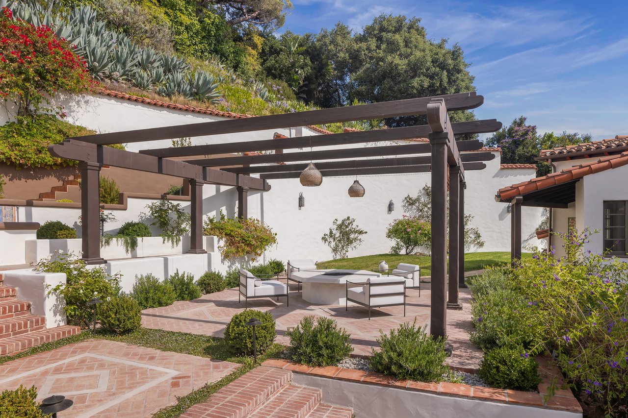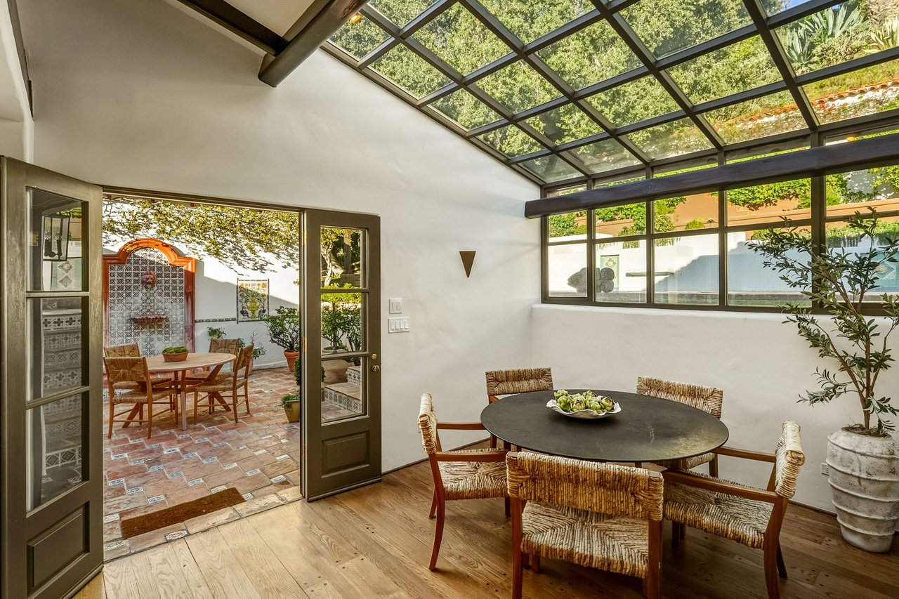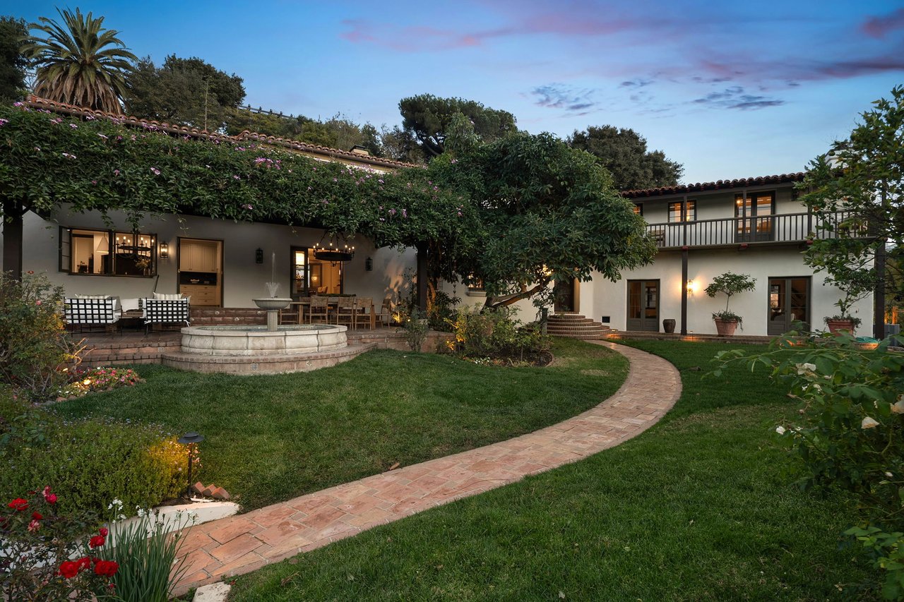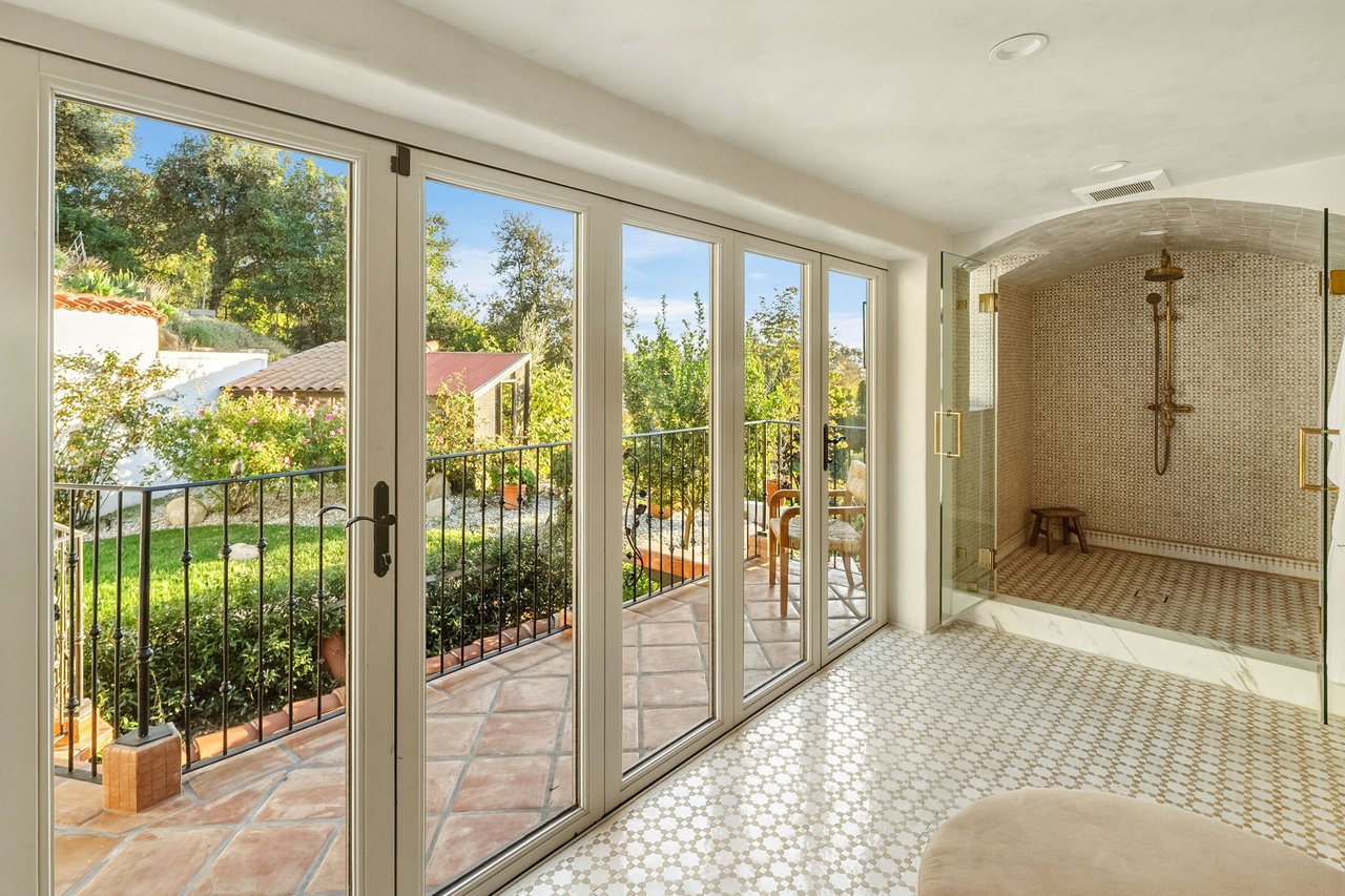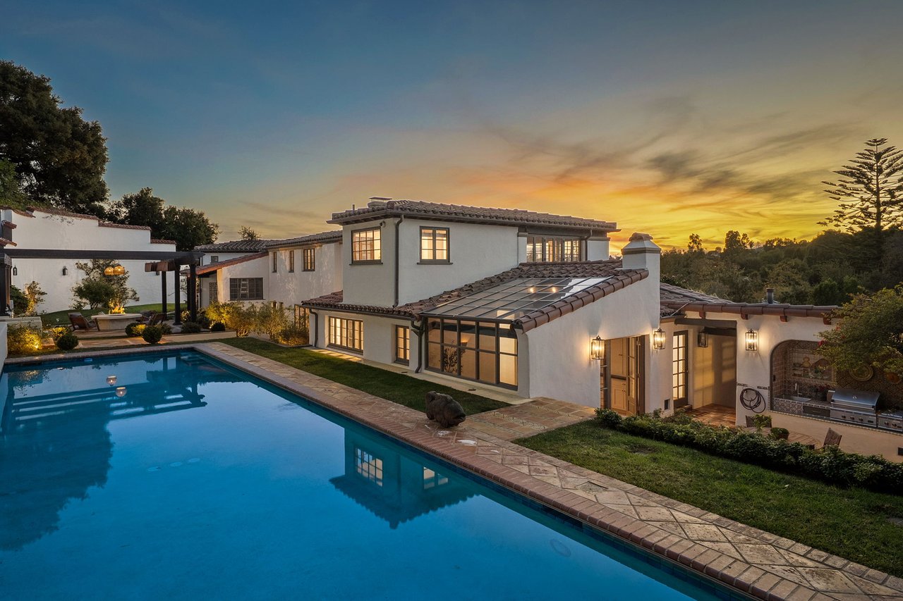 Nestled at the end of a long gated drive in Lower Mandeville Canyon, La Casa De Flores is a Spanish Revival estate of rare provenance and timeless beauty. Designed in 1929 by acclaimed architect John Byers and thoughtfully reimagined for modern living, the home sits on nearly an acre of lush, secluded grounds, offering an atmosphere that feels both grand and deeply inviting. Inside, the craftsmanship of the original era remains intact—with wood-beamed and coffered ceilings, rich hardwood floors, graceful French doors, and hand-crafted casement windows. Sculptural designer lighting fixtures punctuate the interiors, enhancing the interplay of light and texture throughout. The formal living room, framed by garden views, is anchored by a stone fireplace and crowned by thick, solid wood beams. The formal dining room opens to verandas on both sides, creating effortless flow for gatherings, while the warm, inviting family room is wrapped in custom built-ins. The fully remodeled gourmet kitchen blends elegance and function with stone countertops, custom cabinetry, and an expansive dual-surface marble and butcher block island. A Lacanche range sits within a bespoke alcove, complemented by a walk-in pantry. Adjacent, the glass-topped atrium breakfast room dazzles with direct access to the outdoor kitchen and al fresco dining patio outfitted in vibrant Spanish tile and an original fountain. The primary wing offers a serene retreat with a private covered balcony, far-reaching canyon vistas, a corner fireplace, and a designer walk-in dressing room. Its en suite bath, bathed in natural light, features dual marble vanities and a custom-tiled shower. Four additional guest suites, including two joined by a Jack-and-Jill bath, provide comfort and flexibility. A detached office with a tranquil handpainted mural and expansive windows offers an inspiring workspace, while a coved wine cellar adds an indulgent touch. The grounds are a true sanctuary—mature fruit trees, flowering gardens, peaceful fountains, and sweeping lush views frame a 55-foot swimmer’s pool, brick patios, and a pergola lounge with firepit. Accessory structures and a three-car garage complete this rare and private compound, just moments from Brentwood’s finest restaurants, boutiques, and top-rated schools. Blending architectural pedigree with modern comfort, La Casa De Flores is not merely a home—it’s a priceless work of art in one of Los Angeles’ most coveted neighborhoods.