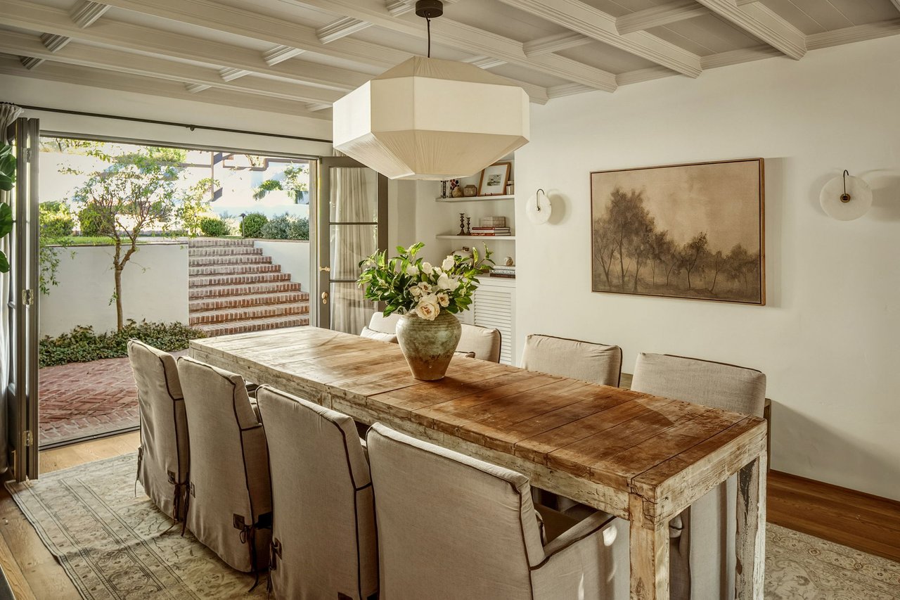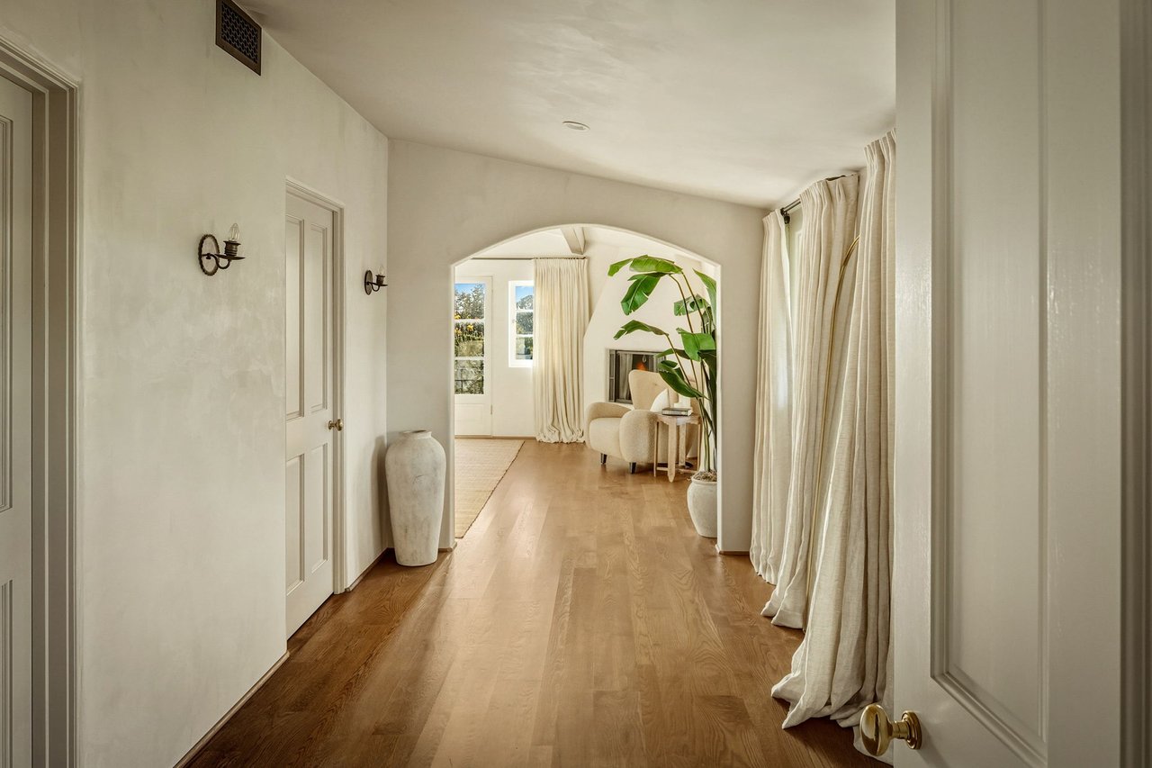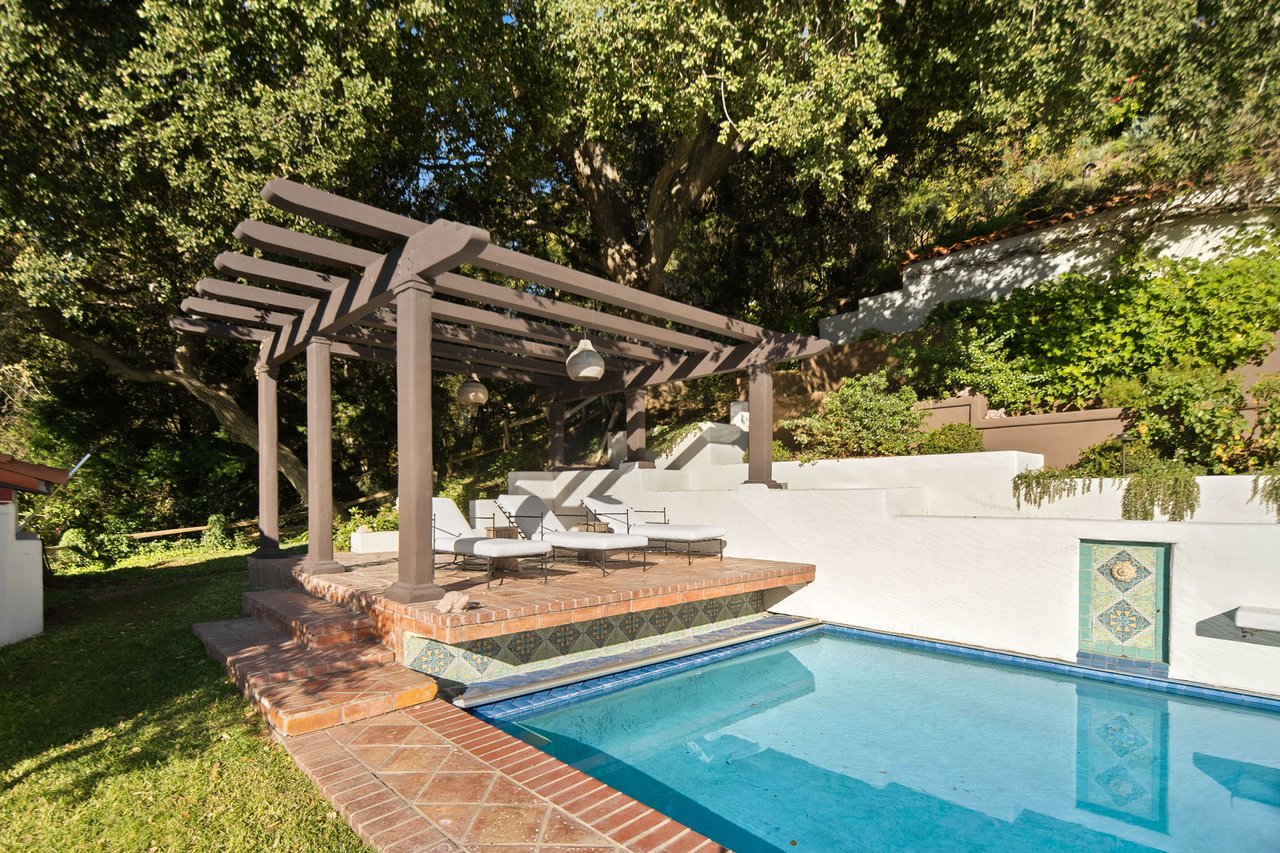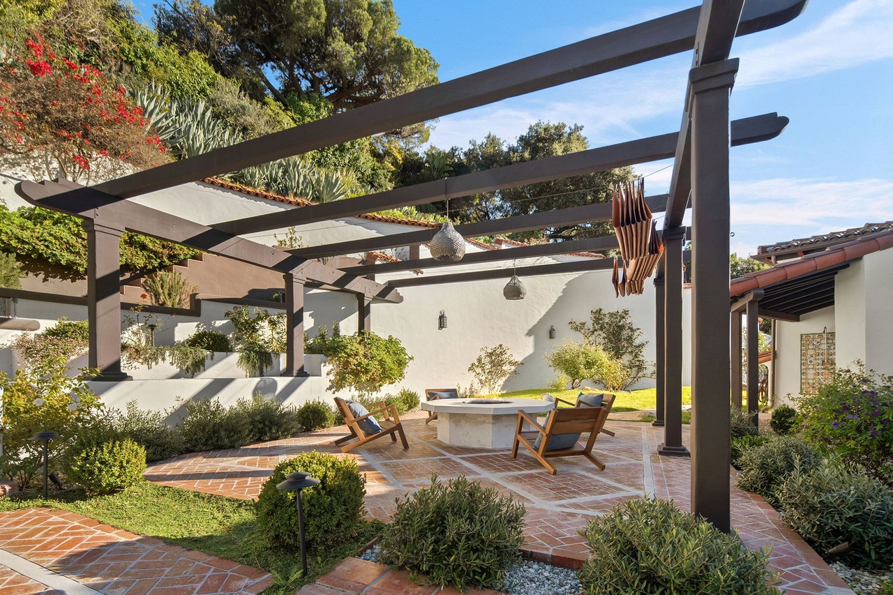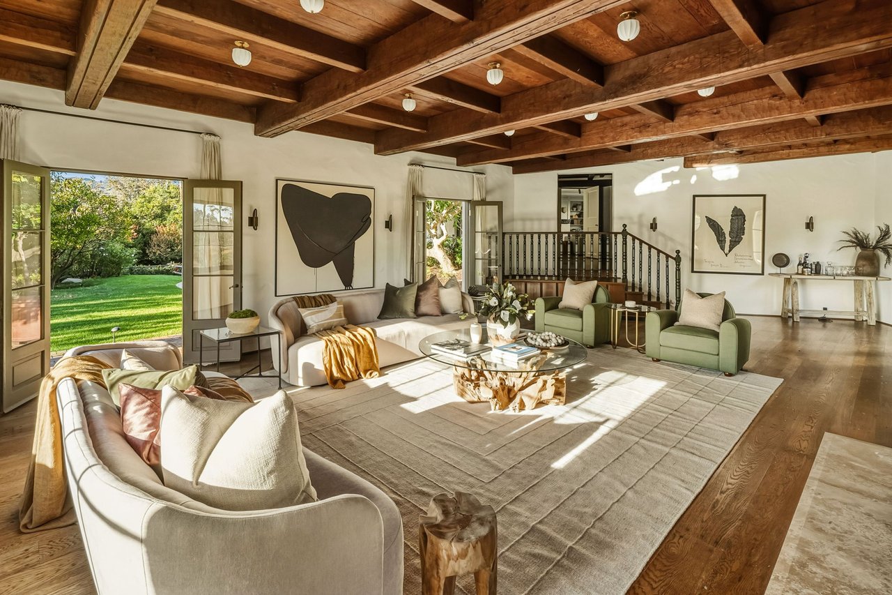 Nestled at the end of a long gated drive in Lower Mandeville Canyon, La Casa De Flores is a Spanish Revival estate of rare provenance and timeless beauty. Designed in 1929 by acclaimed architect John Byers and thoughtfully reimagined for modern living, the home sits on nearly an acre of lush, secluded grounds, offering an atmosphere that feels both grand and deeply inviting. Inside, the craftsmanship of the original era remains intact—with wood-beamed and coffered ceilings, rich hardwood floors, graceful French doors, and hand-crafted casement windows. Sculptural designer lighting fixtures punctuate the interiors, enhancing the interplay of light and texture throughout. The formal living room, framed by garden views, is anchored by a stone fireplace and crowned by thick, solid wood beams. The formal dining room opens to verandas on both sides, creating effortless flow for gatherings, while the warm, inviting family room is wrapped in custom built-ins. The fully remodeled gourmet kitchen blends elegance and function with stone countertops, custom cabinetry, and an expansive dual-surface marble and butcher block island. A Lacanche range sits within a bespoke alcove, complemented by a walk-in pantry. Adjacent, the glass-topped atrium breakfast room dazzles with direct access to the outdoor kitchen and al fresco dining patio outfitted in vibrant Spanish tile and an original fountain. The primary wing offers a serene retreat with a private covered balcony, far-reaching canyon vistas, a corner fireplace, and a designer walk-in dressing room. Its en suite bath, bathed in natural light, features dual marble vanities and a custom-tiled shower. Four additional guest suites, including two joined by a Jack-and-Jill bath, provide comfort and flexibility. A detached office with a tranquil handpainted mural and expansive windows offers an inspiring workspace, while a coved wine cellar adds an indulgent touch. The grounds are a true sanctuary—mature fruit trees, flowering gardens, peaceful fountains, and sweeping lush views frame a 55-foot swimmer’s pool, brick patios, and a pergola lounge with firepit. Accessory structures and a three-car garage complete this rare and private compound, just moments from Brentwood’s finest restaurants, boutiques, and top-rated schools. Blending architectural pedigree with modern comfort, La Casa De Flores is not merely a home—it’s a priceless work of art in one of Los Angeles’ most coveted neighborhoods.