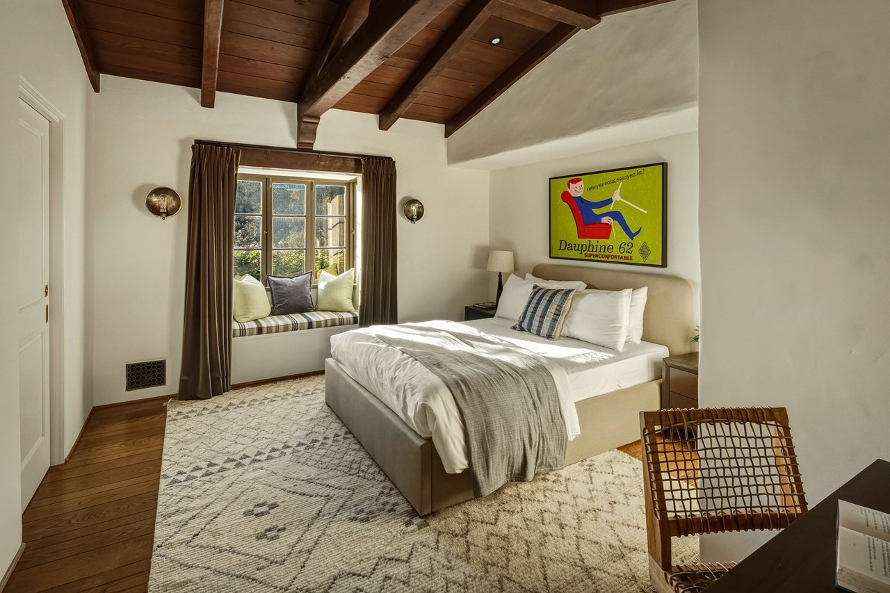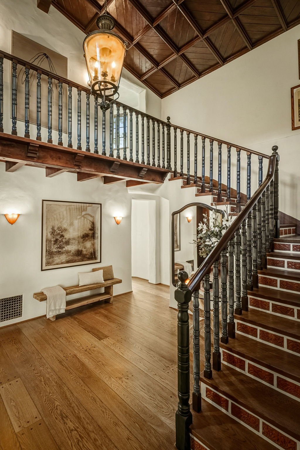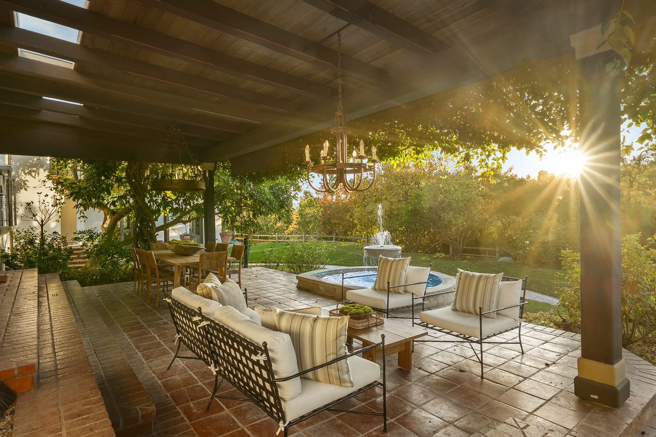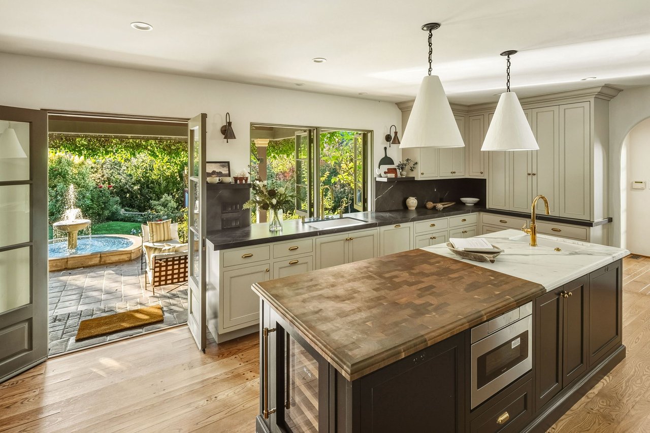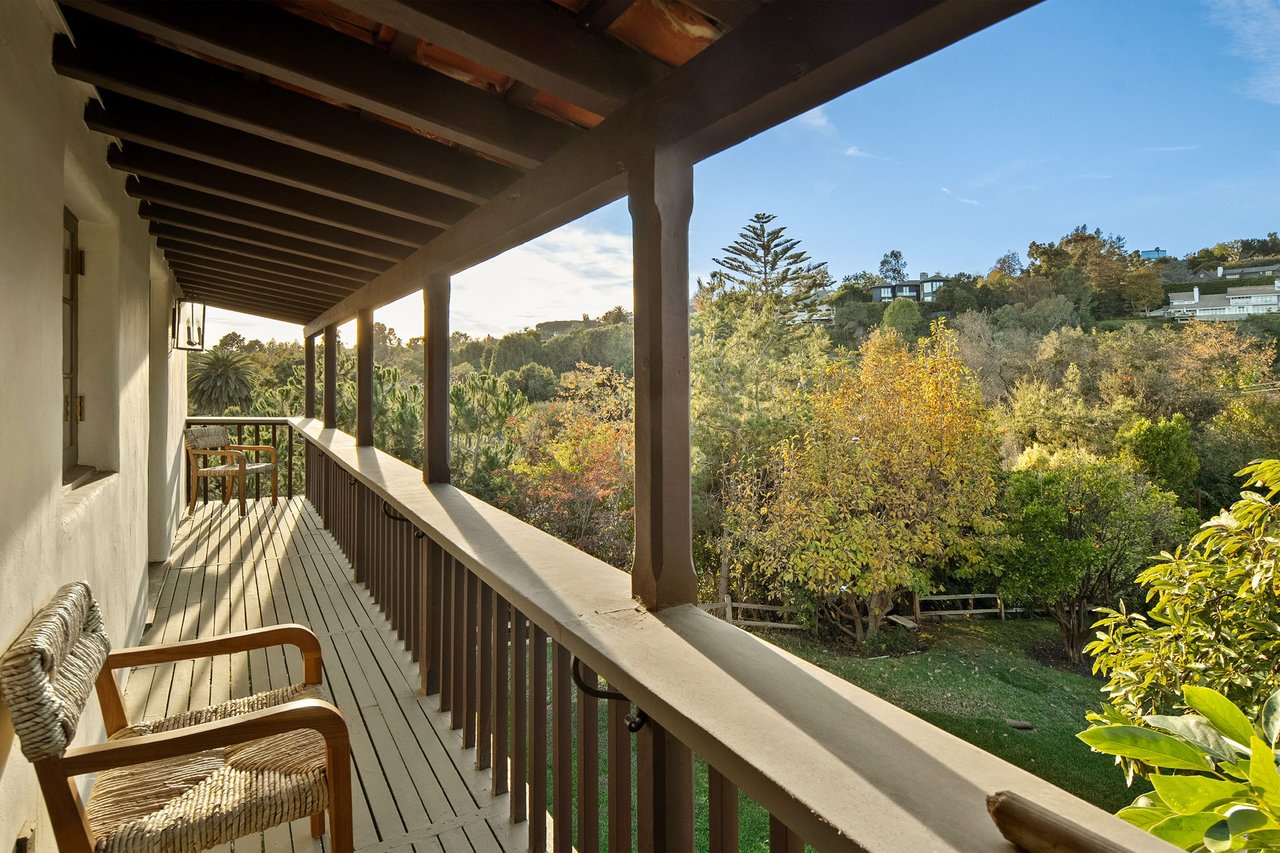 Nestled at the end of a long gated drive in Lower Mandeville Canyon, La Casa De Flores is a Spanish Revival estate of rare provenance and timeless beauty. Designed in 1929 by acclaimed architect John Byers and thoughtfully reimagined for modern living, the home sits on nearly an acre of lush, secluded grounds, offering an atmosphere that feels both grand and deeply inviting. Inside, the craftsmanship of the original era remains intact—with wood-beamed and coffered ceilings, rich hardwood floors, graceful French doors, and hand-crafted casement windows. Sculptural designer lighting fixtures punctuate the interiors, enhancing the interplay of light and texture throughout. The formal living room, framed by garden views, is anchored by a stone fireplace and crowned by thick, solid wood beams. The formal dining room opens to verandas on both sides, creating effortless flow for gatherings, while the warm, inviting family room is wrapped in custom built-ins. The fully remodeled gourmet kitchen blends elegance and function with stone countertops, custom cabinetry, and an expansive dual-surface marble and butcher block island. A Lacanche range sits within a bespoke alcove, complemented by a walk-in pantry. Adjacent, the glass-topped atrium breakfast room dazzles with direct access to the outdoor kitchen and al fresco dining patio outfitted in vibrant Spanish tile and an original fountain. The primary wing offers a serene retreat with a private covered balcony, far-reaching canyon vistas, a corner fireplace, and a designer walk-in dressing room. Its en suite bath, bathed in natural light, features dual marble vanities and a custom-tiled shower. Four additional guest suites, including two joined by a Jack-and-Jill bath, provide comfort and flexibility. A detached office with a tranquil handpainted mural and expansive windows offers an inspiring workspace, while a coved wine cellar adds an indulgent touch. The grounds are a true sanctuary—mature fruit trees, flowering gardens, peaceful fountains, and sweeping lush views frame a 55-foot swimmer’s pool, brick patios, and a pergola lounge with firepit. Accessory structures and a three-car garage complete this rare and private compound, just moments from Brentwood’s finest restaurants, boutiques, and top-rated schools. Blending architectural pedigree with modern comfort, La Casa De Flores is not merely a home—it’s a priceless work of art in one of Los Angeles’ most coveted neighborhoods.