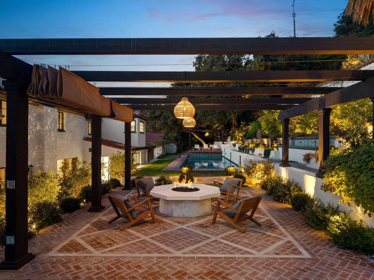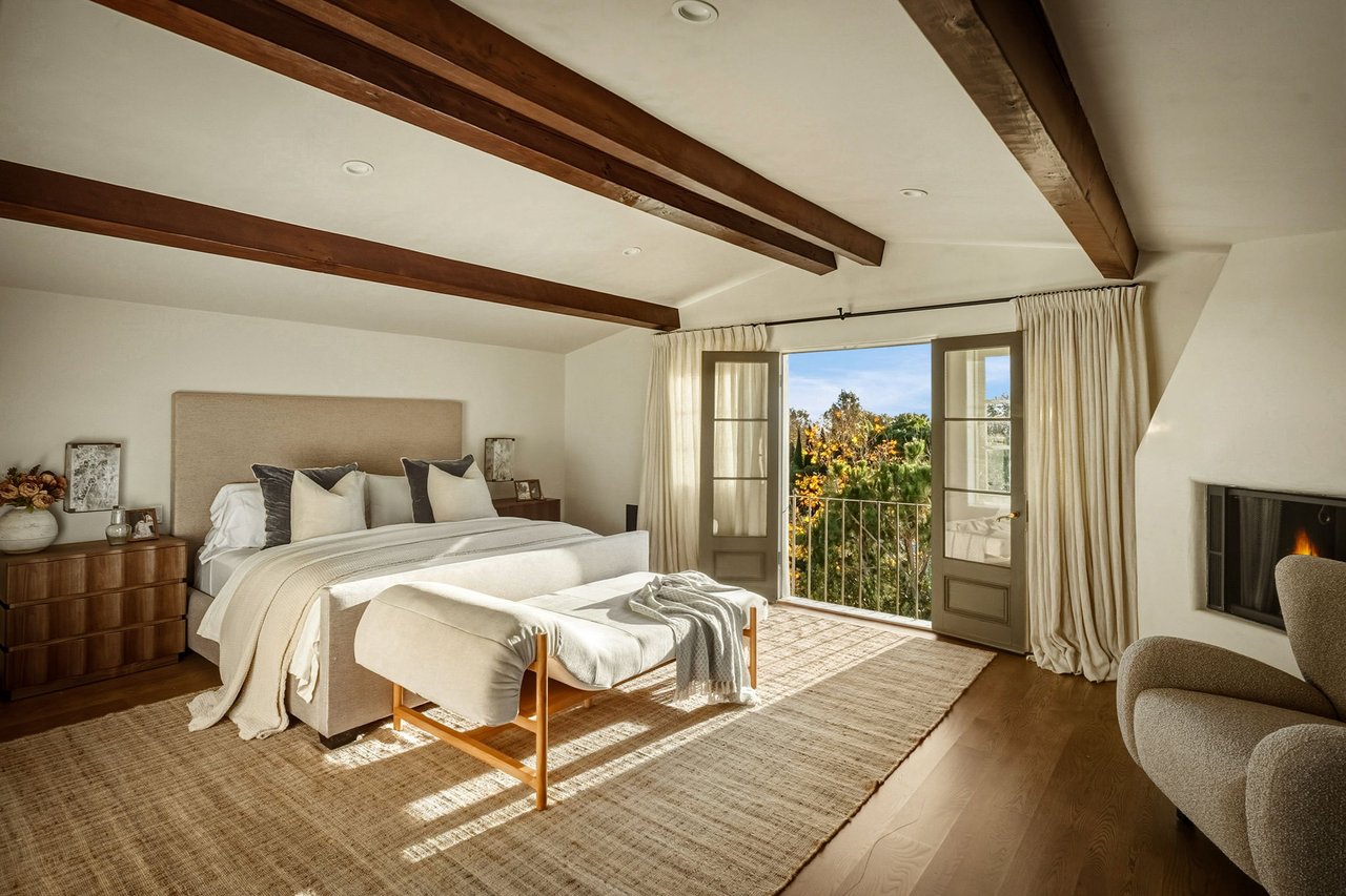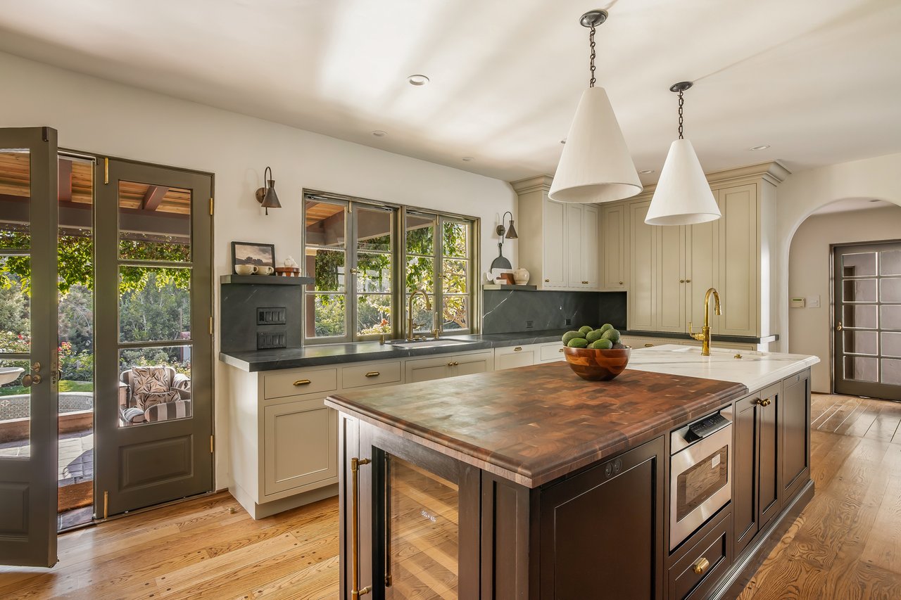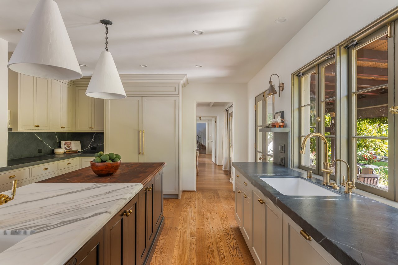 Nestled at the end of a long gated drive in Lower Mandeville Canyon, La Casa De Flores is a Spanish Revival estate of rare provenance and timeless beauty. Designed in 1929 by acclaimed architect John Byers and thoughtfully reimagined for modern living, the home sits on nearly an acre of lush, secluded grounds, offering an atmosphere that feels both grand and deeply inviting. Inside, the craftsmanship of the original era remains intact—with wood-beamed and coffered ceilings, rich hardwood floors, graceful French doors, and hand-crafted casement windows. Sculptural designer lighting fixtures punctuate the interiors, enhancing the interplay of light and texture throughout. The formal living room, framed by garden views, is anchored by a stone fireplace and crowned by thick, solid wood beams. The formal dining room opens to verandas on both sides, creating effortless flow for gatherings, while the warm, inviting family room is wrapped in custom built-ins. The fully remodeled gourmet kitchen blends elegance and function with stone countertops, custom cabinetry, and an expansive dual-surface marble and butcher block island. A Lacanche range sits within a bespoke alcove, complemented by a walk-in pantry. Adjacent, the glass-topped atrium breakfast room dazzles with direct access to the outdoor kitchen and al fresco dining patio outfitted in vibrant Spanish tile and an original fountain. The primary wing offers a serene retreat with a private covered balcony, far-reaching canyon vistas, a corner fireplace, and a designer walk-in dressing room. Its en suite bath, bathed in natural light, features dual marble vanities and a custom-tiled shower. Four additional guest suites, including two joined by a Jack-and-Jill bath, provide comfort and flexibility. A detached office with a tranquil handpainted mural and expansive windows offers an inspiring workspace, while a coved wine cellar adds an indulgent touch. The grounds are a true sanctuary—mature fruit trees, flowering gardens, peaceful fountains, and sweeping lush views frame a 55-foot swimmer’s pool, brick patios, and a pergola lounge with firepit. Accessory structures and a three-car garage complete this rare and private compound, just moments from Brentwood’s finest restaurants, boutiques, and top-rated schools. Blending architectural pedigree with modern comfort, La Casa De Flores is not merely a home—it’s a priceless work of art in one of Los Angeles’ most coveted neighborhoods.