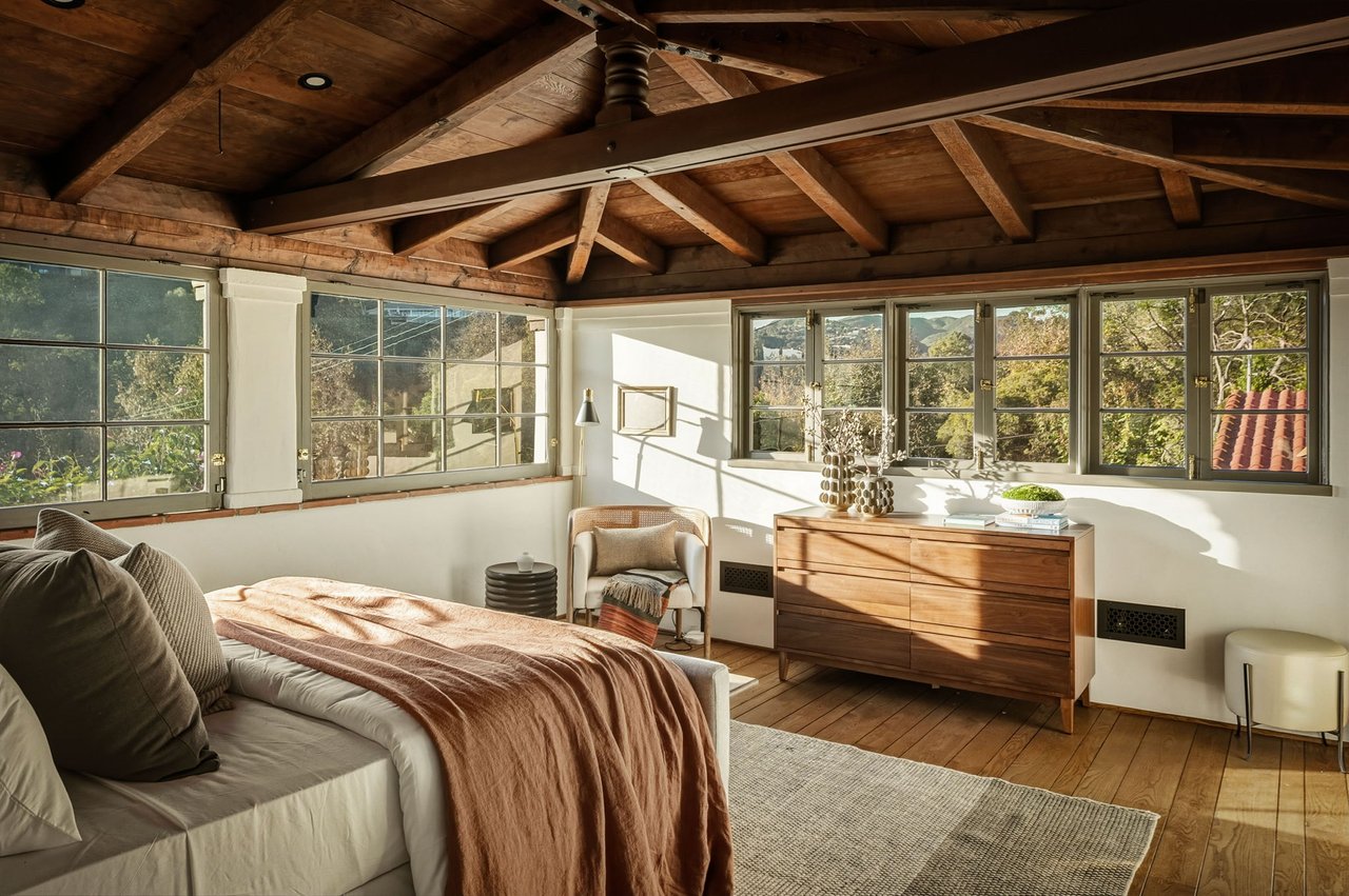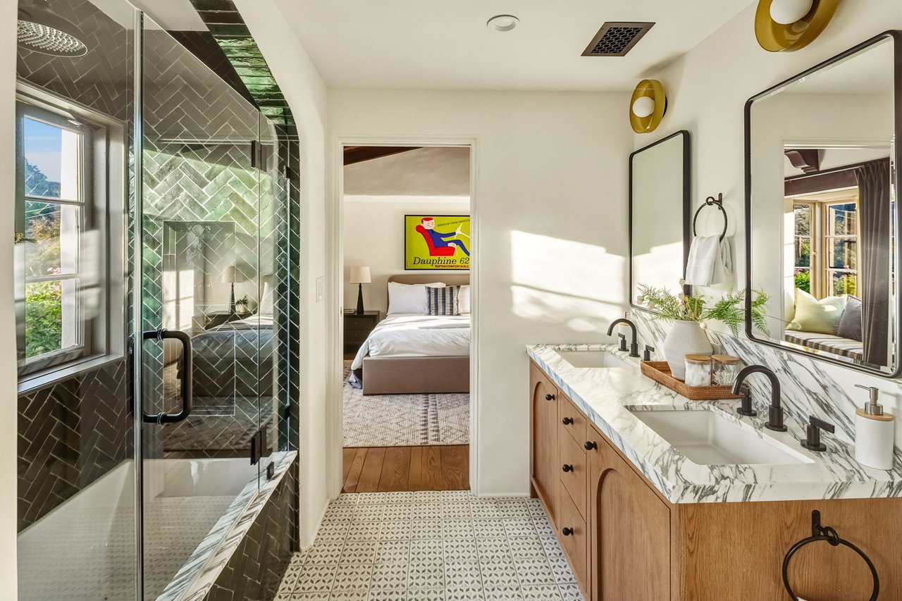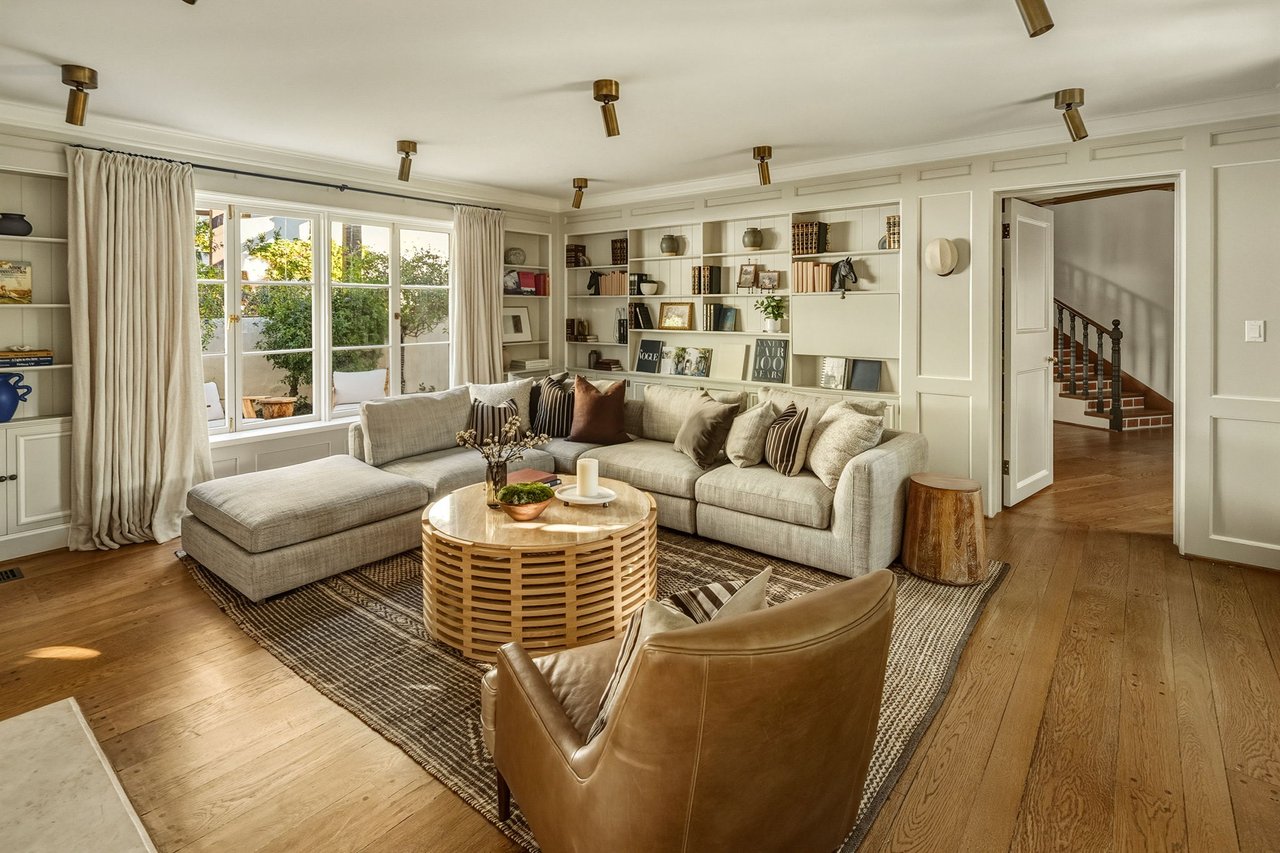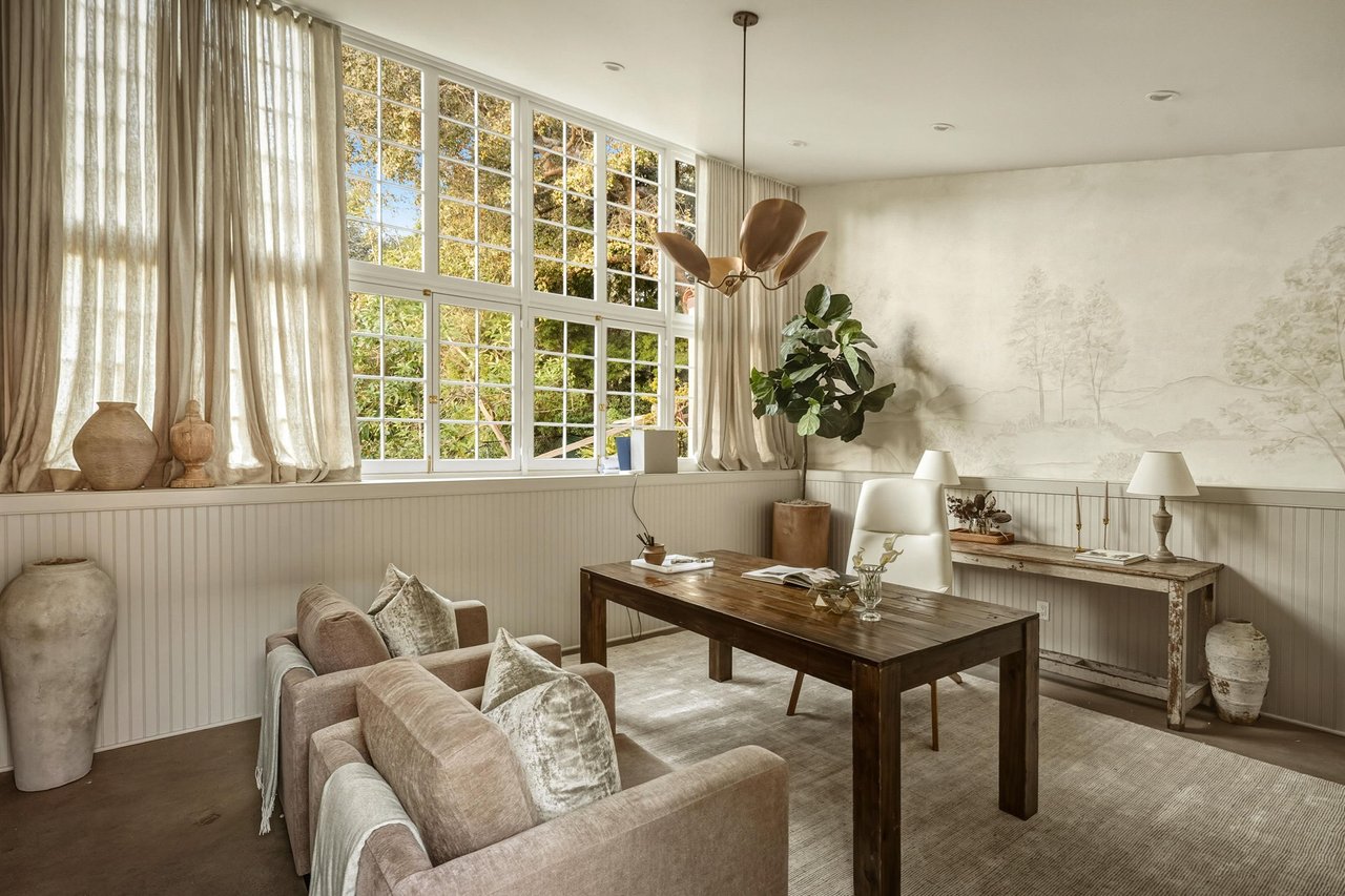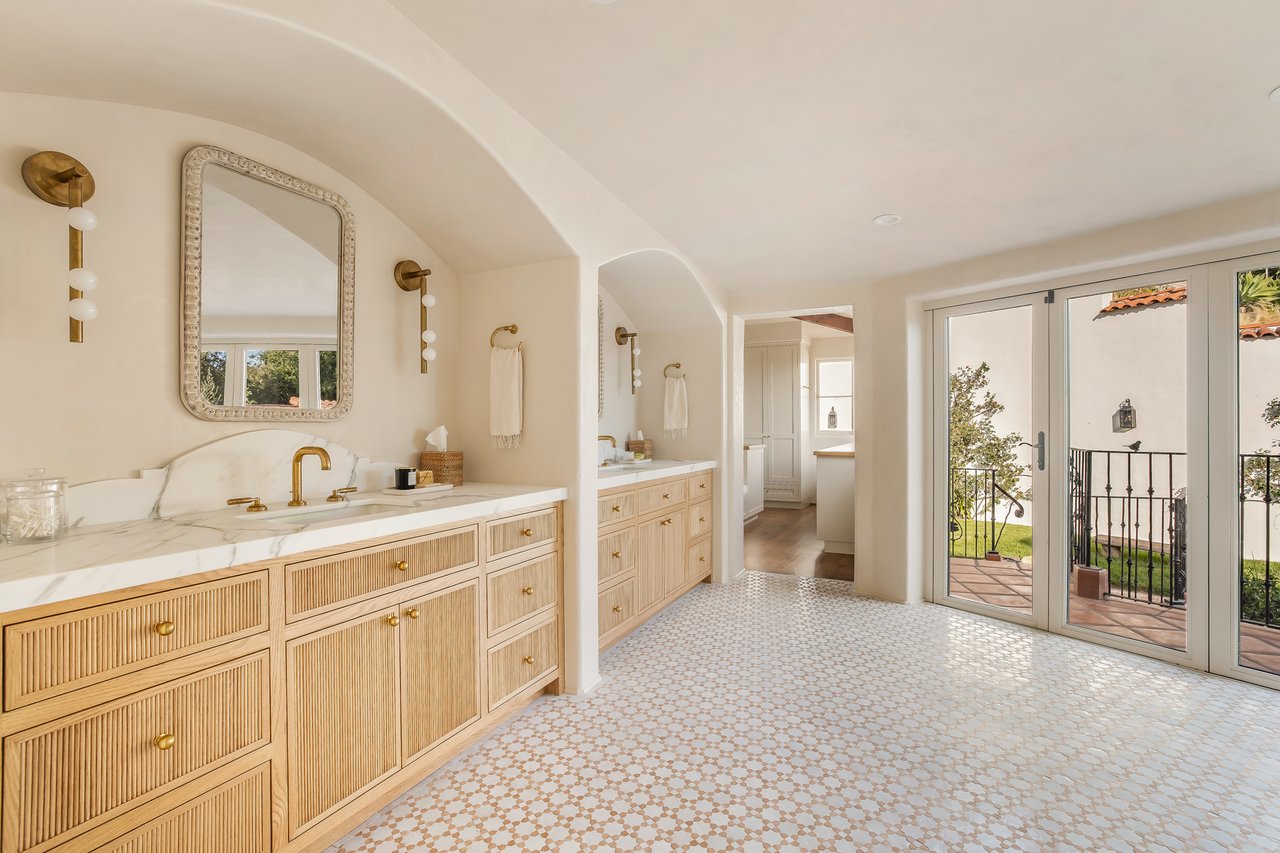 Nestled at the end of a long gated drive in Lower Mandeville Canyon, La Casa De Flores is a Spanish Revival estate of rare provenance and timeless beauty. Designed in 1929 by acclaimed architect John Byers and thoughtfully reimagined for modern living, the home sits on nearly an acre of lush, secluded grounds, offering an atmosphere that feels both grand and deeply inviting. Inside, the craftsmanship of the original era remains intact—with wood-beamed and coffered ceilings, rich hardwood floors, graceful French doors, and hand-crafted casement windows. Sculptural designer lighting fixtures punctuate the interiors, enhancing the interplay of light and texture throughout. The formal living room, framed by garden views, is anchored by a stone fireplace and crowned by thick, solid wood beams. The formal dining room opens to verandas on both sides, creating effortless flow for gatherings, while the warm, inviting family room is wrapped in custom built-ins. The fully remodeled gourmet kitchen blends elegance and function with stone countertops, custom cabinetry, and an expansive dual-surface marble and butcher block island. A Lacanche range sits within a bespoke alcove, complemented by a walk-in pantry. Adjacent, the glass-topped atrium breakfast room dazzles with direct access to the outdoor kitchen and al fresco dining patio outfitted in vibrant Spanish tile and an original fountain. The primary wing offers a serene retreat with a private covered balcony, far-reaching canyon vistas, a corner fireplace, and a designer walk-in dressing room. Its en suite bath, bathed in natural light, features dual marble vanities and a custom-tiled shower. Four additional guest suites, including two joined by a Jack-and-Jill bath, provide comfort and flexibility. A detached office with a tranquil handpainted mural and expansive windows offers an inspiring workspace, while a coved wine cellar adds an indulgent touch. The grounds are a true sanctuary—mature fruit trees, flowering gardens, peaceful fountains, and sweeping lush views frame a 55-foot swimmer’s pool, brick patios, and a pergola lounge with firepit. Accessory structures and a three-car garage complete this rare and private compound, just moments from Brentwood’s finest restaurants, boutiques, and top-rated schools. Blending architectural pedigree with modern comfort, La Casa De Flores is not merely a home—it’s a priceless work of art in one of Los Angeles’ most coveted neighborhoods.
