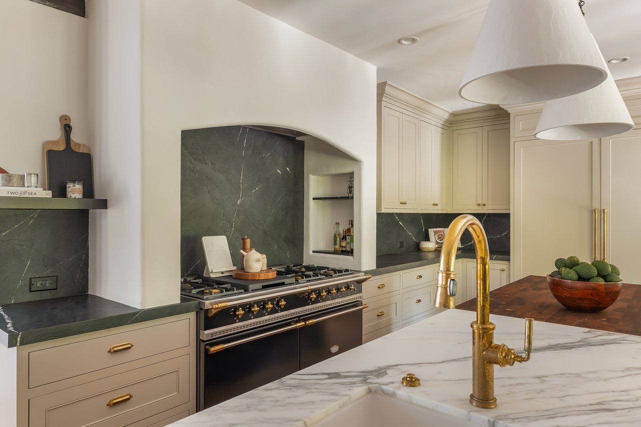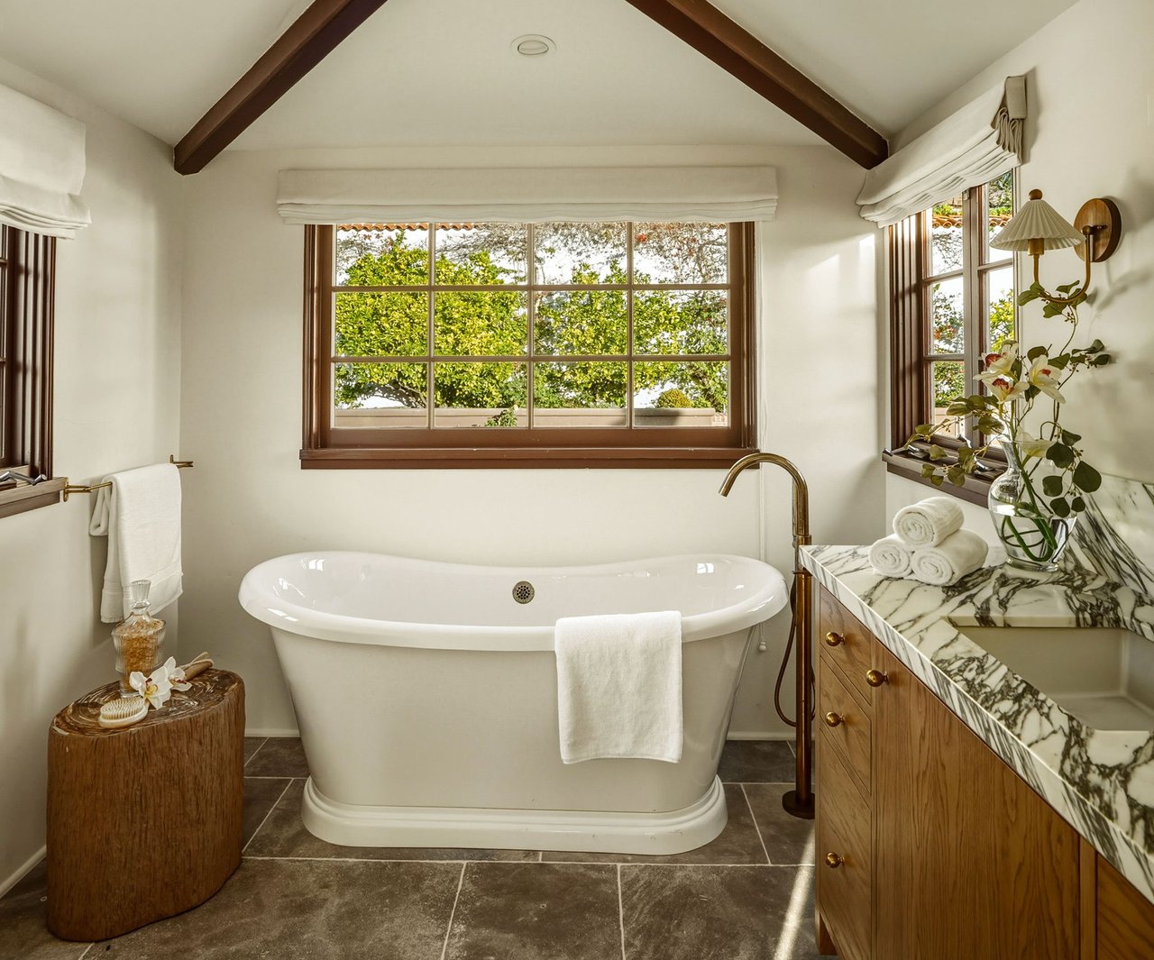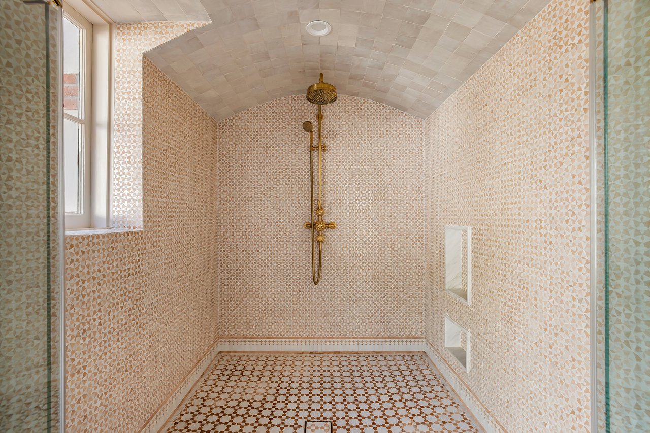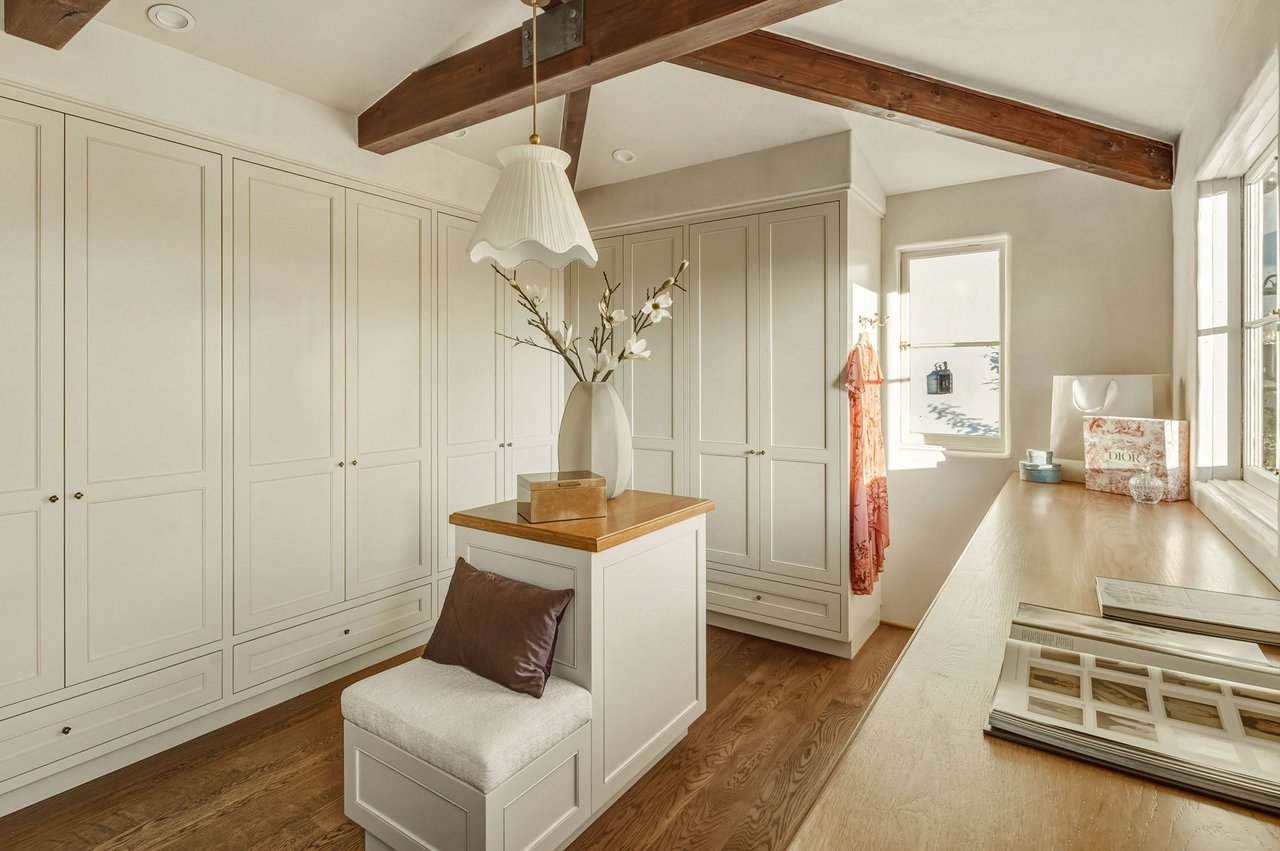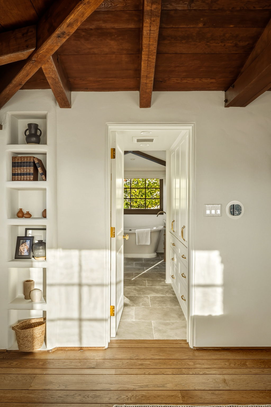 Nestled at the end of a long gated drive in Lower Mandeville Canyon, La Casa De Flores is a Spanish Revival estate of rare provenance and timeless beauty. Designed in 1929 by acclaimed architect John Byers and thoughtfully reimagined for modern living, the home sits on nearly an acre of lush, secluded grounds, offering an atmosphere that feels both grand and deeply inviting. Inside, the craftsmanship of the original era remains intact—with wood-beamed and coffered ceilings, rich hardwood floors, graceful French doors, and hand-crafted casement windows. Sculptural designer lighting fixtures punctuate the interiors, enhancing the interplay of light and texture throughout. The formal living room, framed by garden views, is anchored by a stone fireplace and crowned by thick, solid wood beams. The formal dining room opens to verandas on both sides, creating effortless flow for gatherings, while the warm, inviting family room is wrapped in custom built-ins. The fully remodeled gourmet kitchen blends elegance and function with stone countertops, custom cabinetry, and an expansive dual-surface marble and butcher block island. A Lacanche range sits within a bespoke alcove, complemented by a walk-in pantry. Adjacent, the glass-topped atrium breakfast room dazzles with direct access to the outdoor kitchen and al fresco dining patio outfitted in vibrant Spanish tile and an original fountain. The primary wing offers a serene retreat with a private covered balcony, far-reaching canyon vistas, a corner fireplace, and a designer walk-in dressing room. Its en suite bath, bathed in natural light, features dual marble vanities and a custom-tiled shower. Four additional guest suites, including two joined by a Jack-and-Jill bath, provide comfort and flexibility. A detached office with a tranquil handpainted mural and expansive windows offers an inspiring workspace, while a coved wine cellar adds an indulgent touch. The grounds are a true sanctuary—mature fruit trees, flowering gardens, peaceful fountains, and sweeping lush views frame a 55-foot swimmer’s pool, brick patios, and a pergola lounge with firepit. Accessory structures and a three-car garage complete this rare and private compound, just moments from Brentwood’s finest restaurants, boutiques, and top-rated schools. Blending architectural pedigree with modern comfort, La Casa De Flores is not merely a home—it’s a priceless work of art in one of Los Angeles’ most coveted neighborhoods.